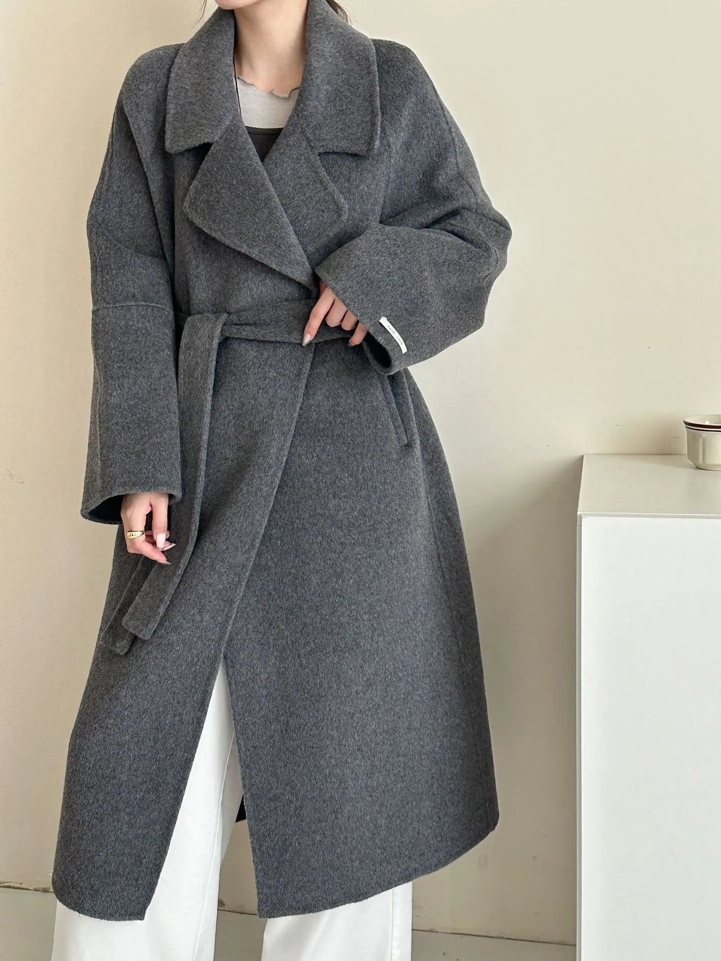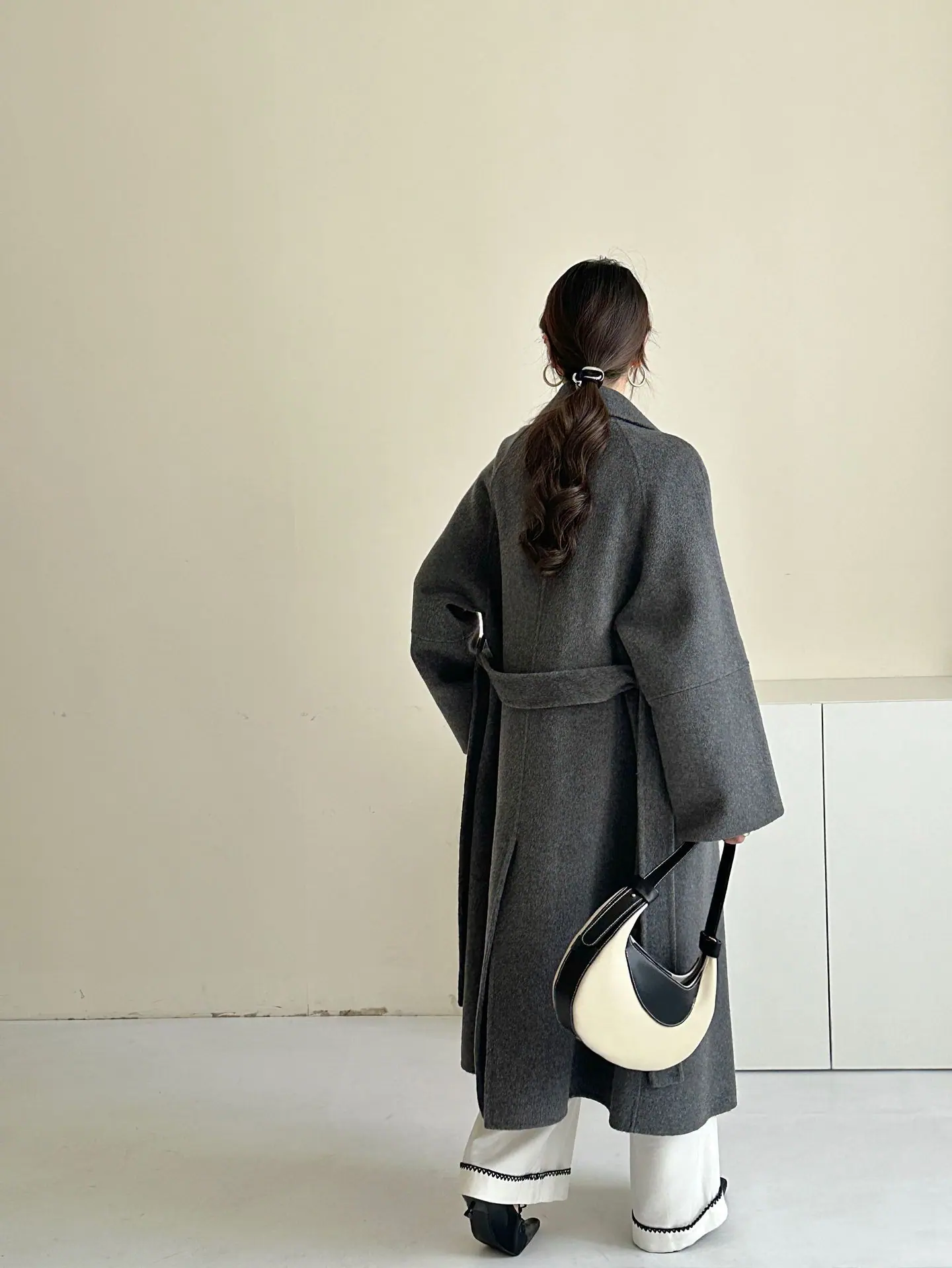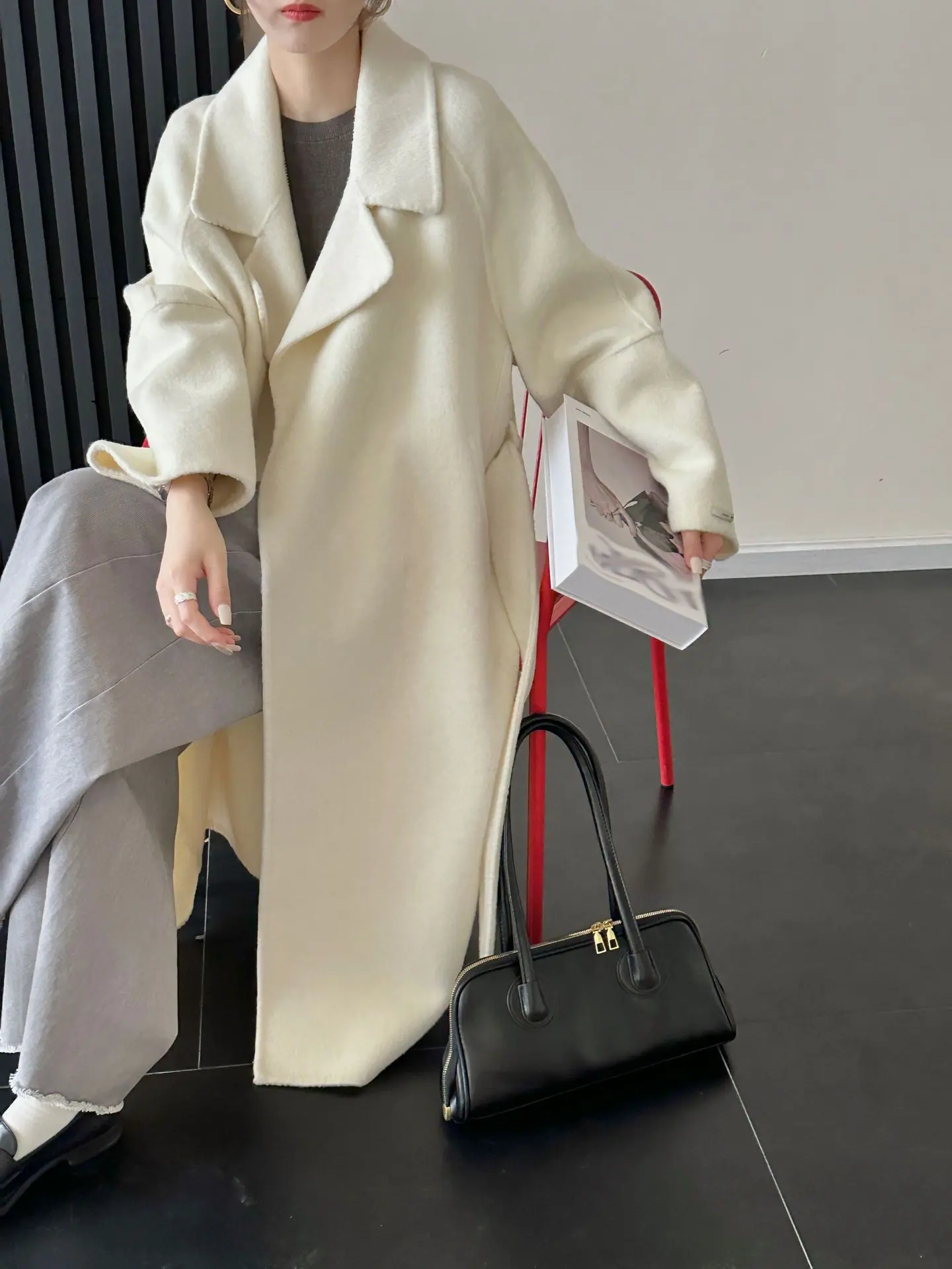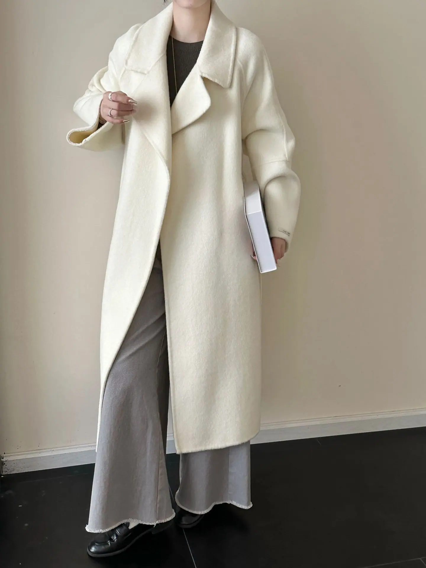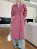 Abrigo de Lana de Doble Faz para Mujer con Cuello de Traje, Doble Botonadura, Manga Raglán, Manga Larga, Largo Extendido, Corte Tridimensional