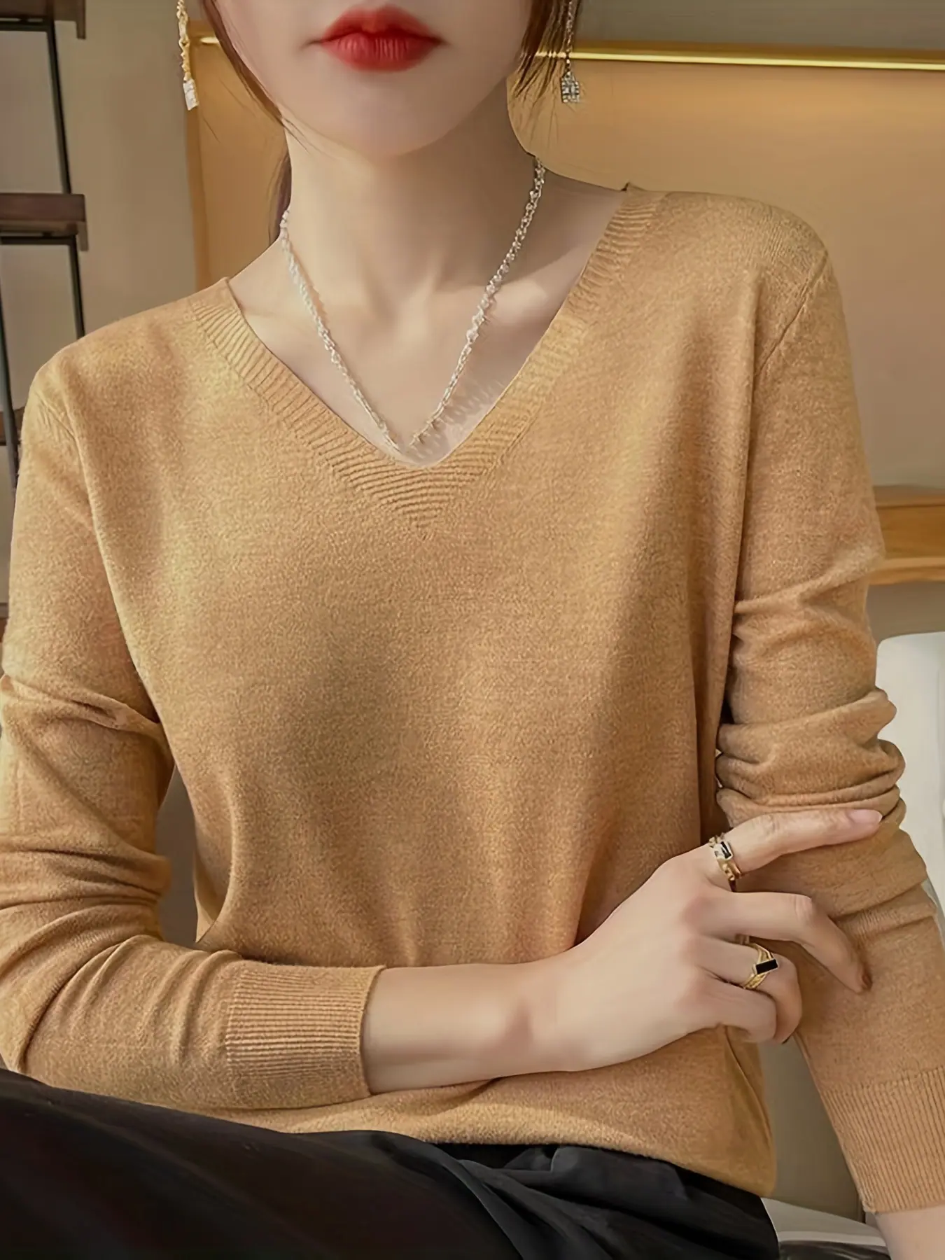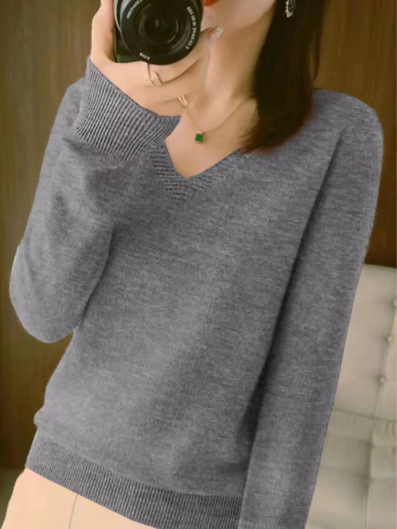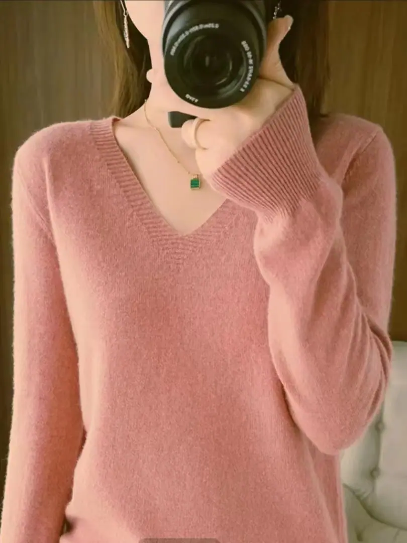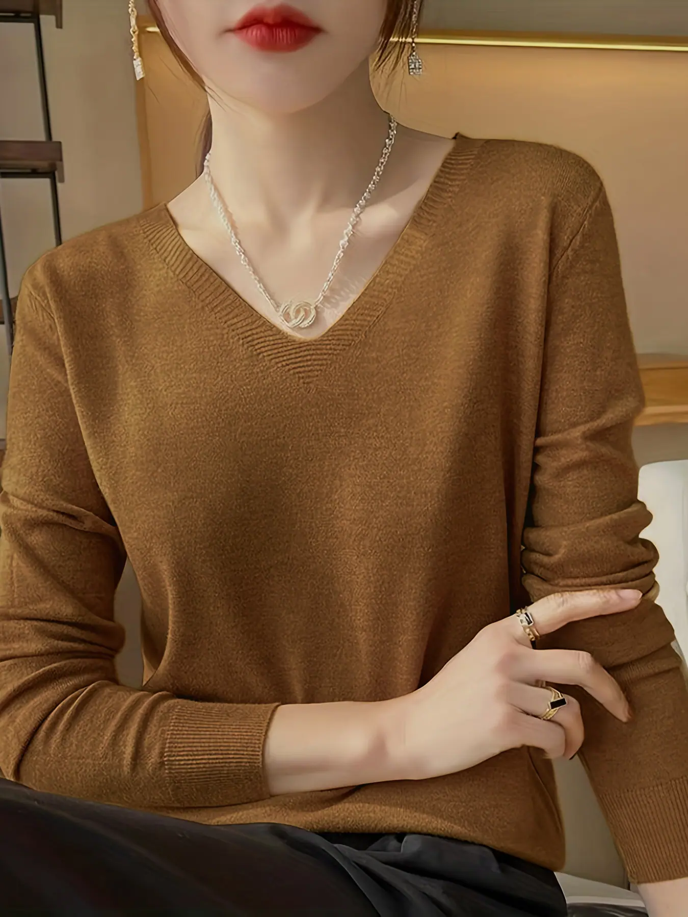 Suéter holgado de cuello en V para mujer, nuevo para otoño e invierno, suéter versátil, top delgado de manga larga de color sólido
