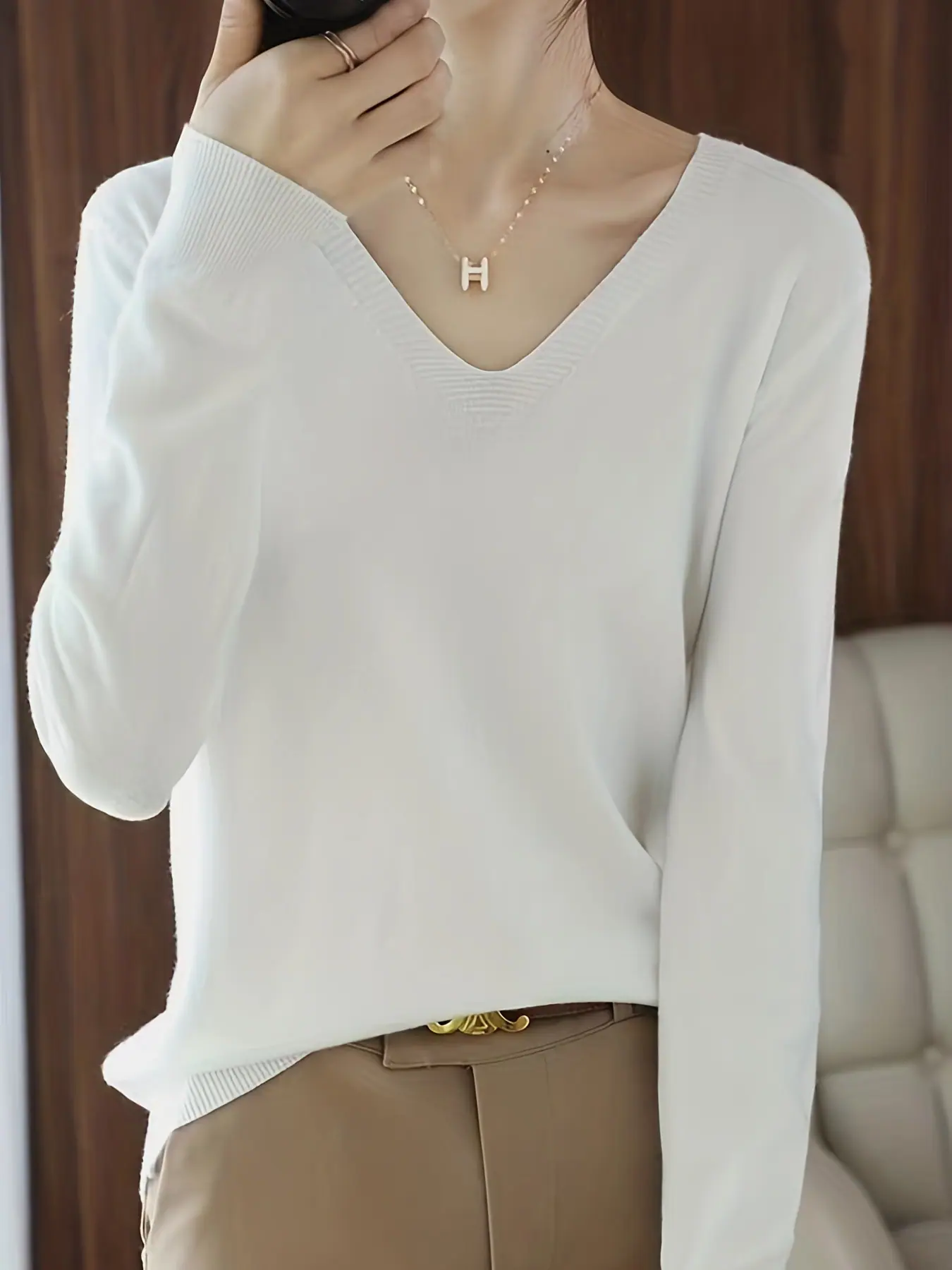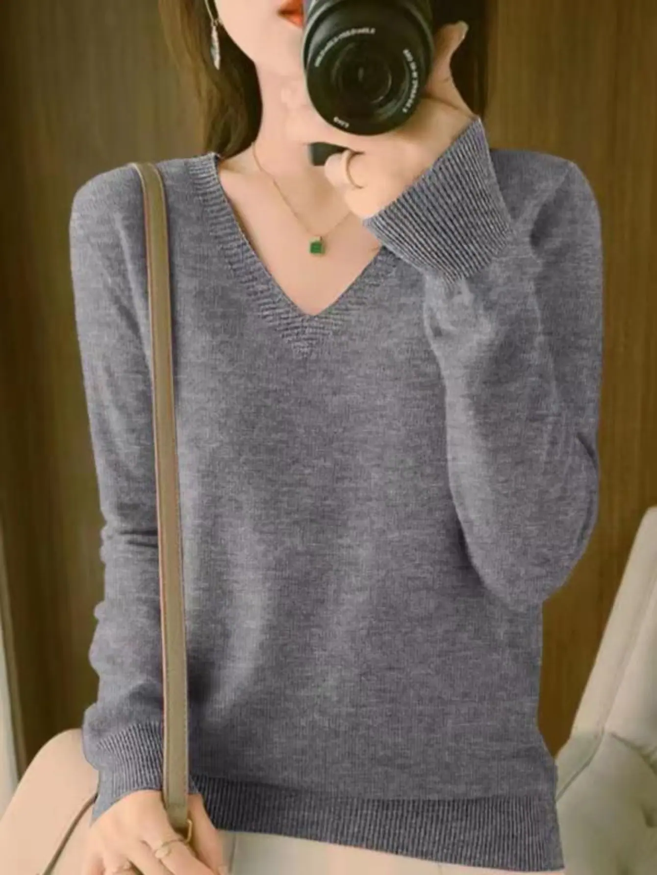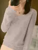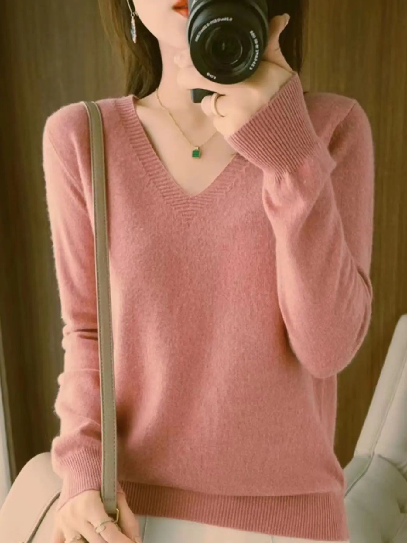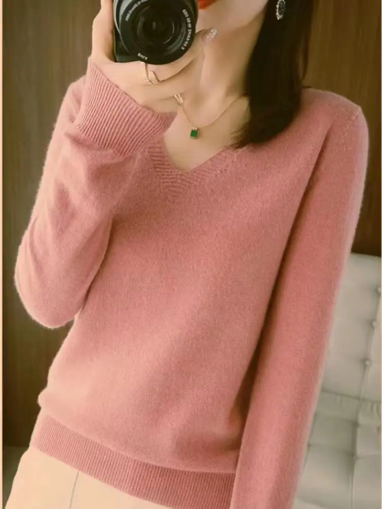 Suéter holgado de cuello en V para mujer, nuevo para otoño e invierno, suéter versátil, top delgado de manga larga de color sólido