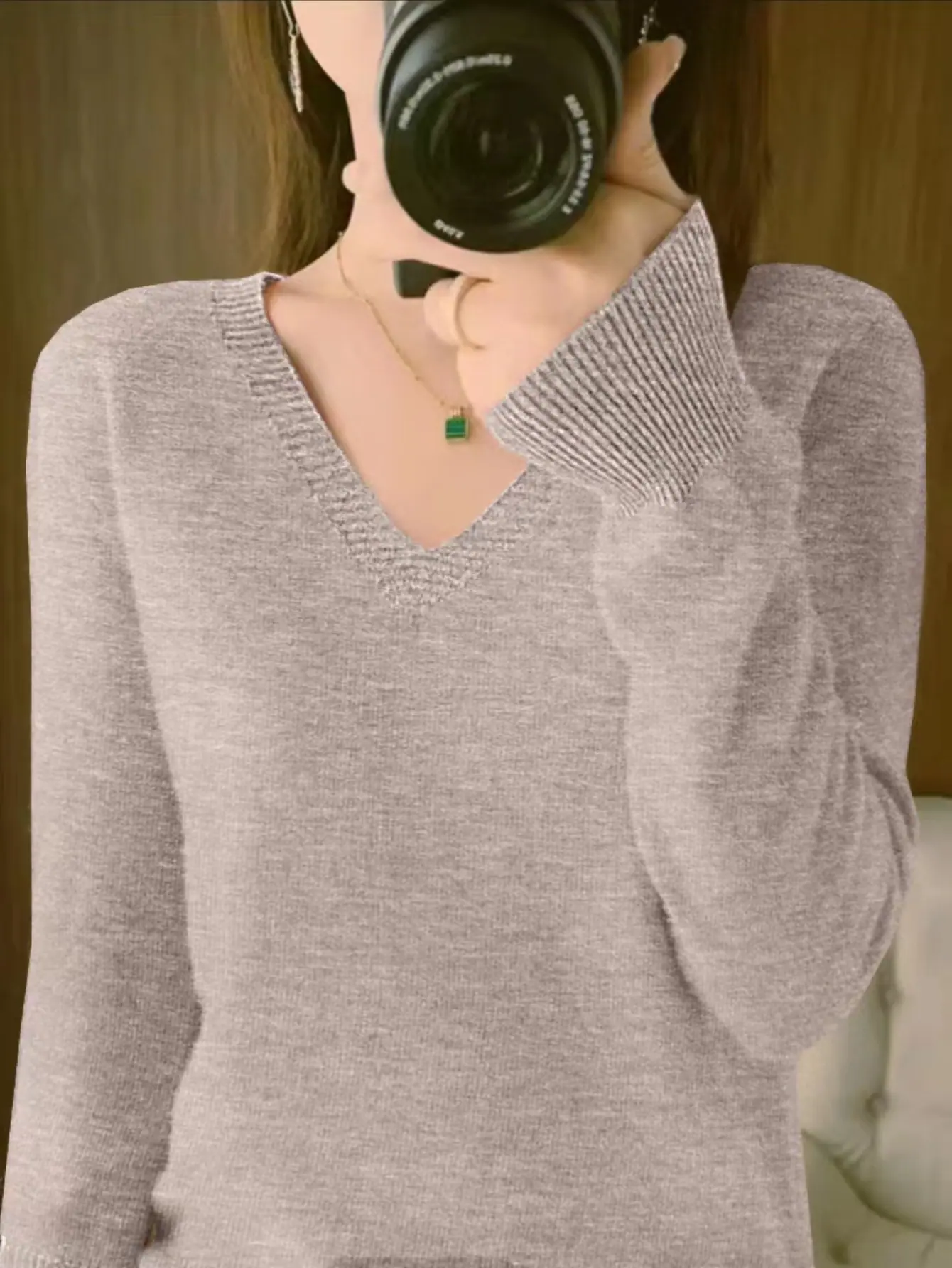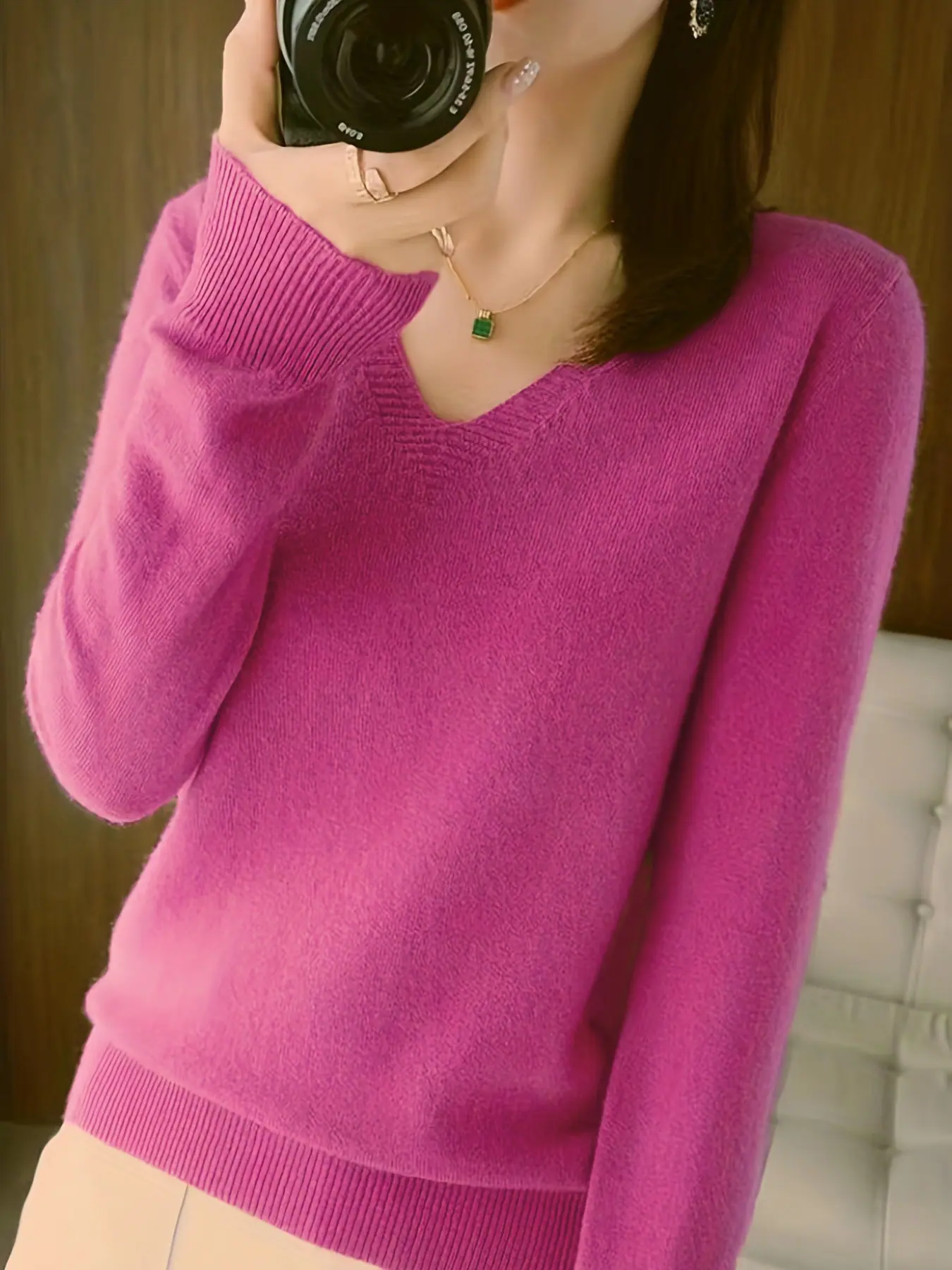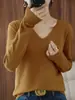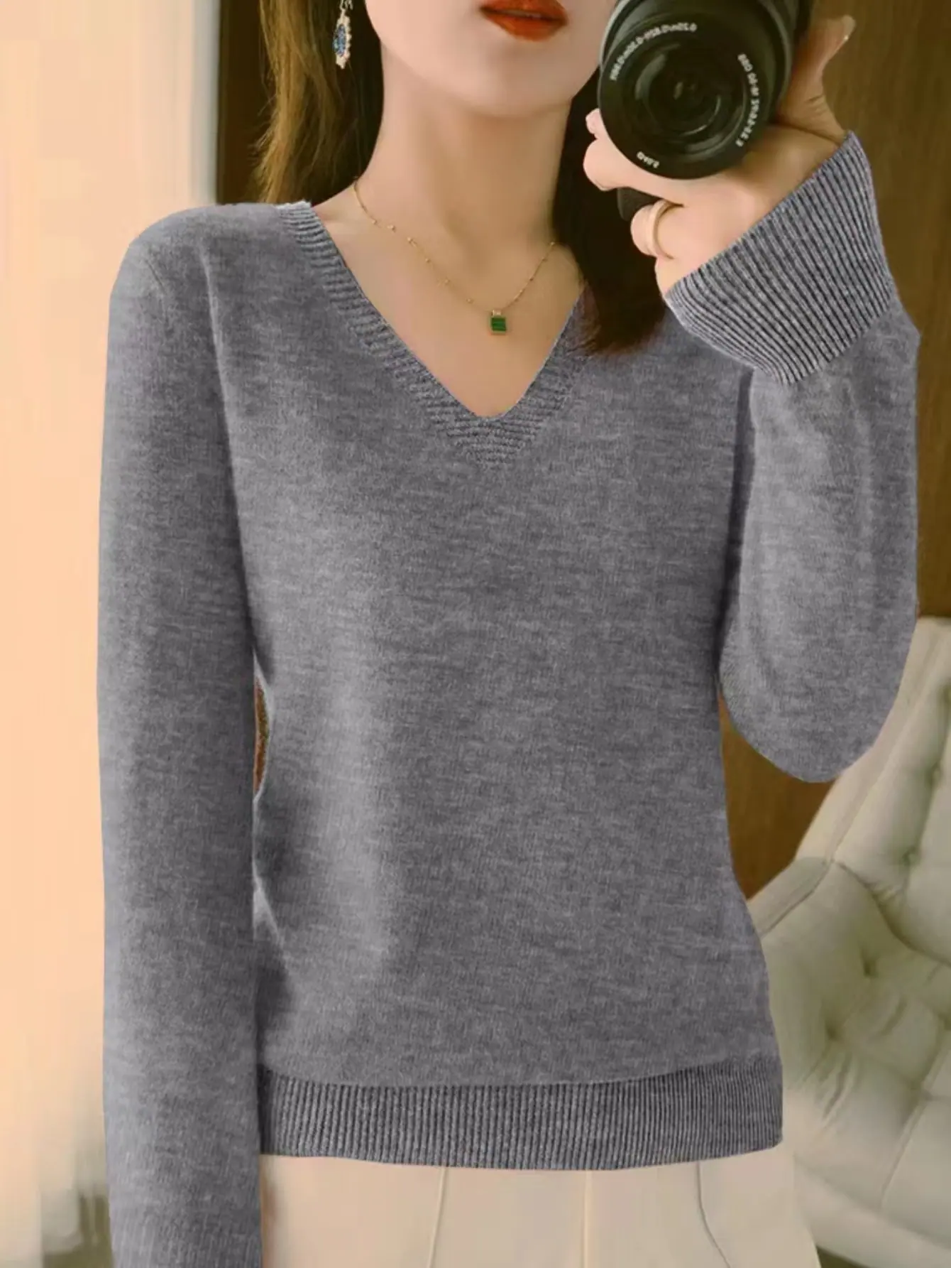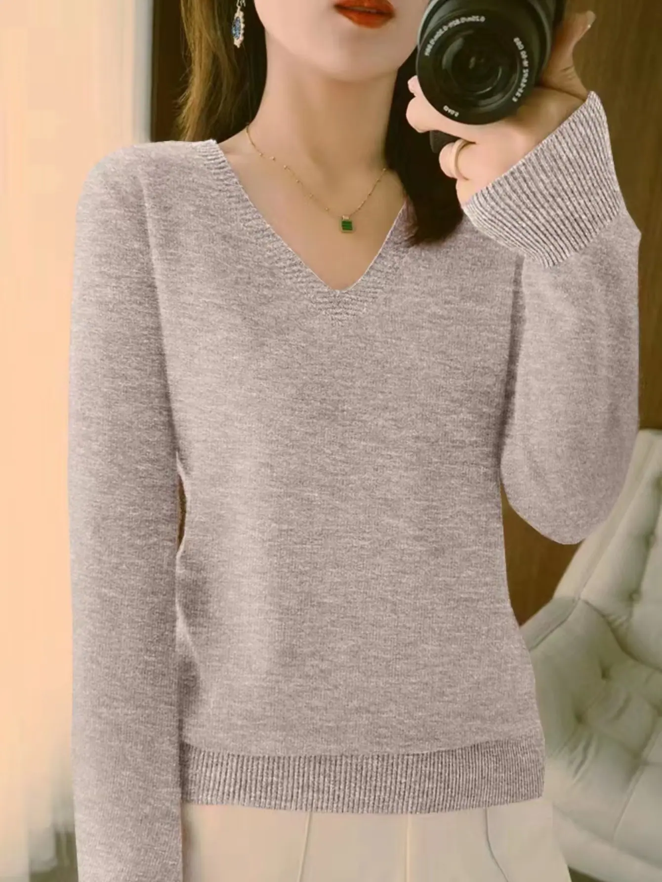 Suéter holgado de cuello en V para mujer, nuevo para otoño e invierno, suéter versátil, top delgado de manga larga de color sólido