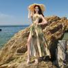 Descanso del Té Francés Vestido de Tirantes Floral Retro Verde Manchado Vacaciones en la Costa Único Hermoso Cintura Falda Larga