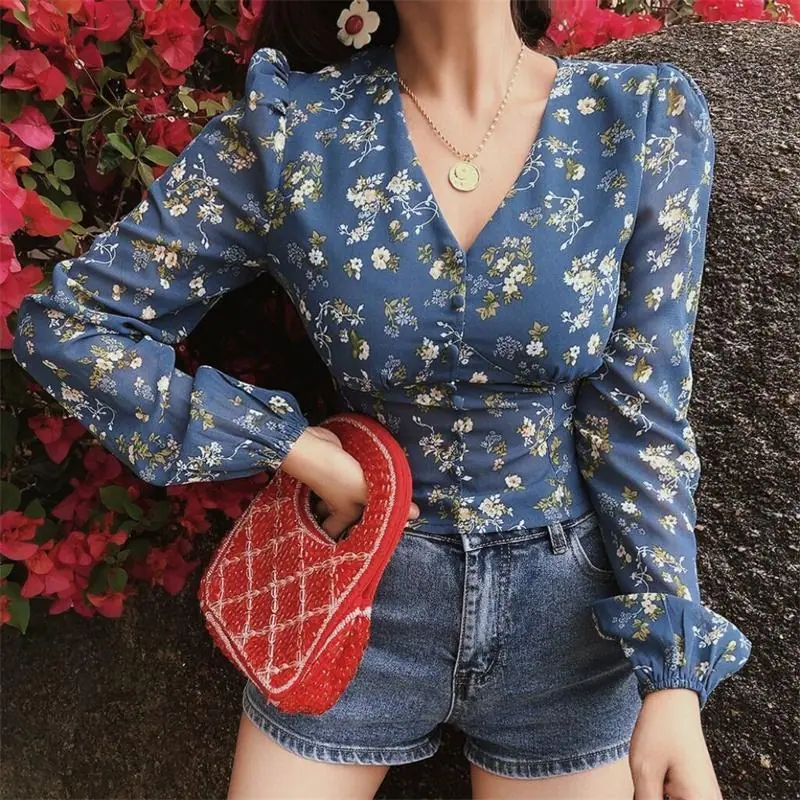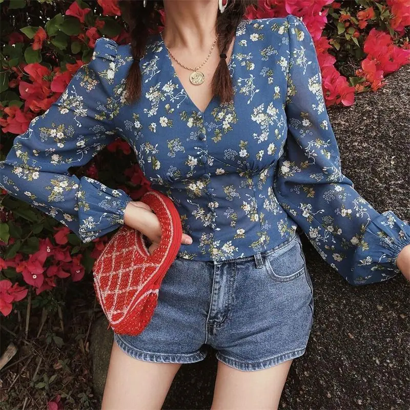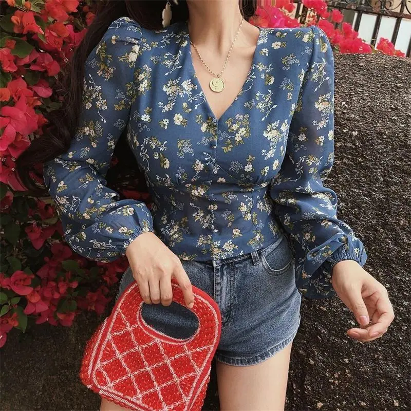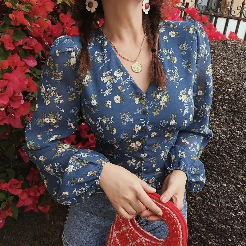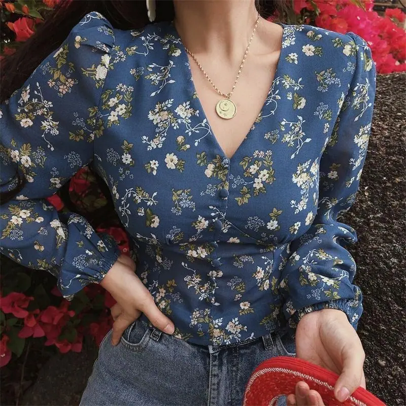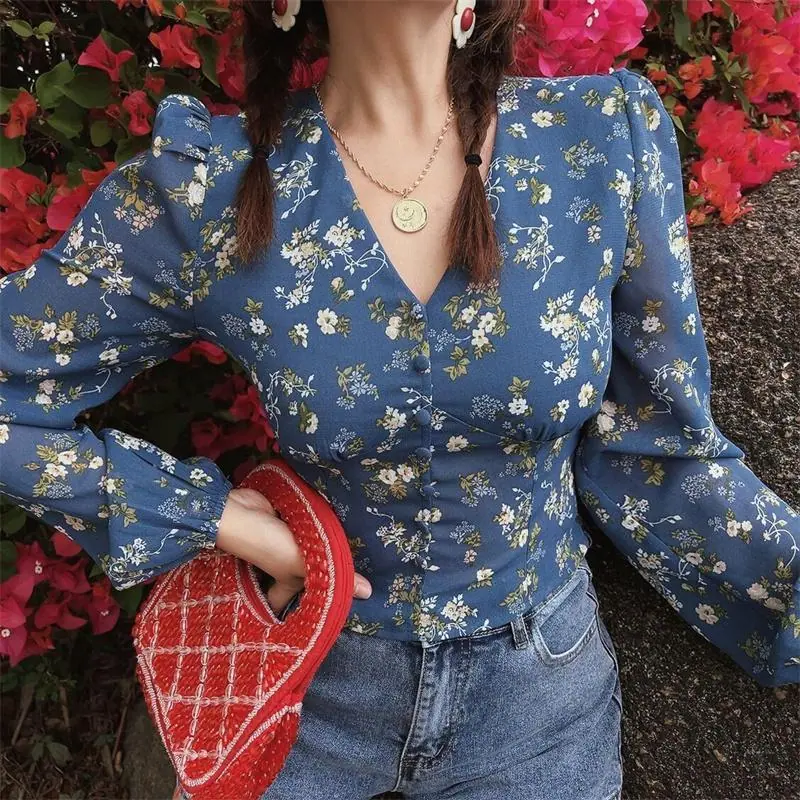 Blusa de gasa retro francesa para mujer 2025 primavera nuevo diseño nicho cuello en V adelgazante manga larga top estampado