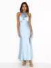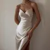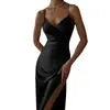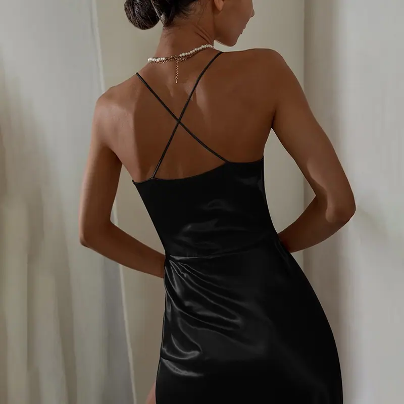Verano Europeo y Americano nueva moda temperamento cuello en V ajustado sexy sin espalda abertura satén vestido de tirantes para mujer