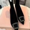 Zapatos de Mujer Botas Negras para Mujer 2025 Otoño Puntiagudos con Pedrería Tacones Altos Hebilla Cuadrada Botas Elásticas Botines Tacones Bajos Ajustados