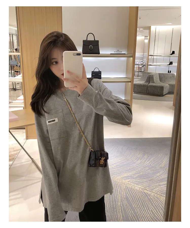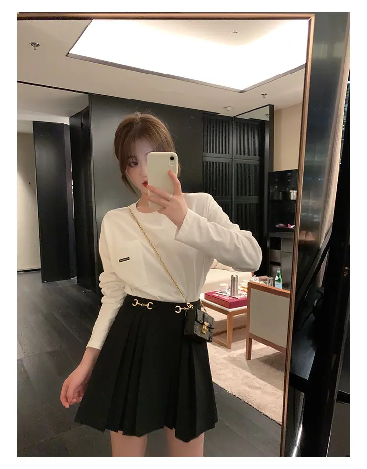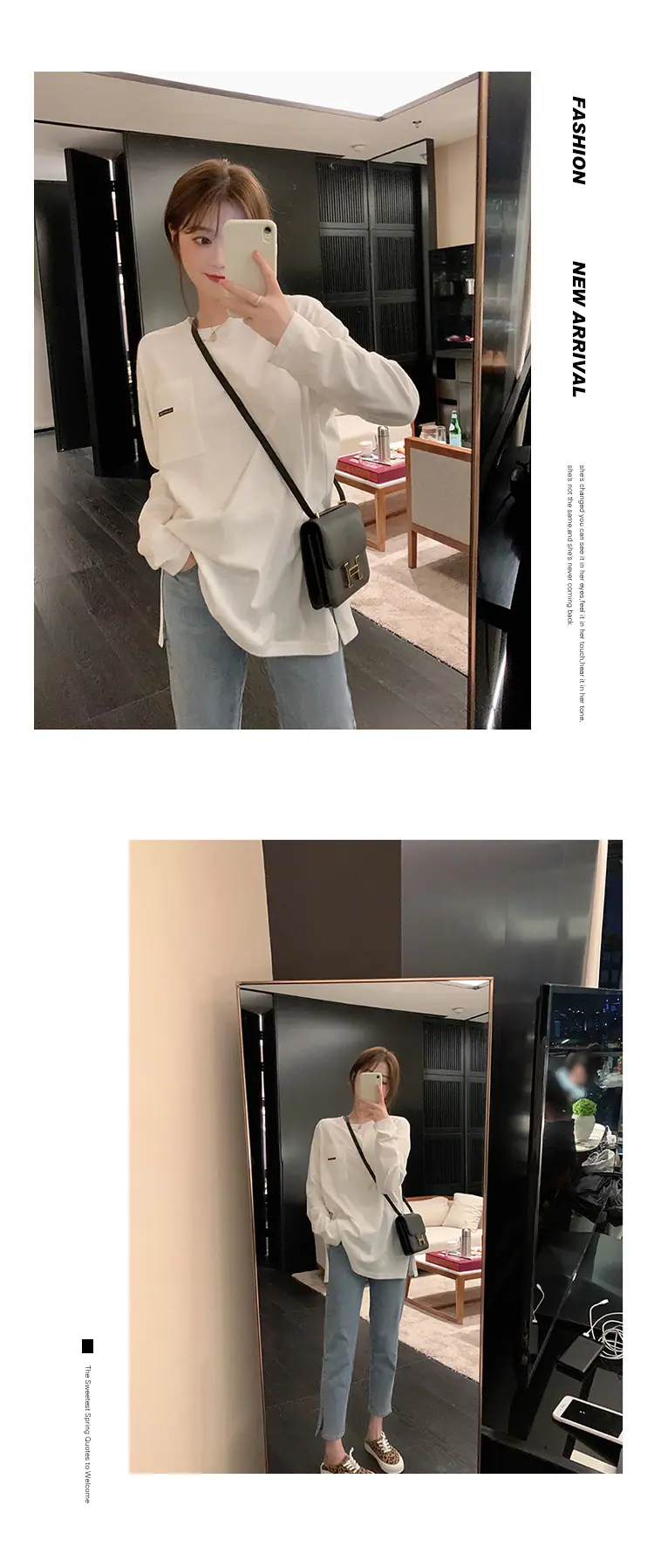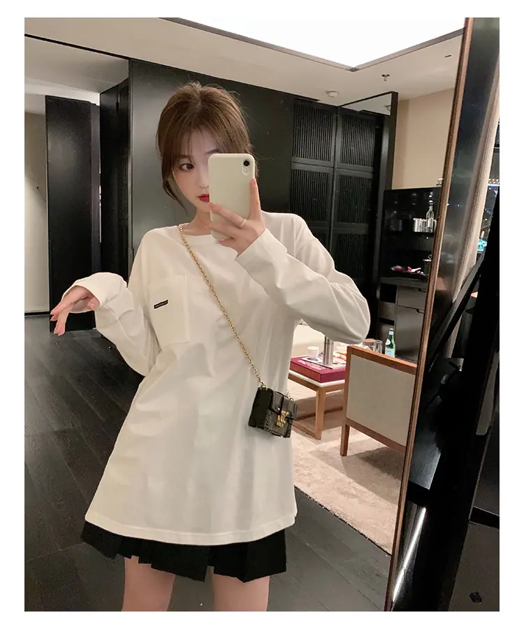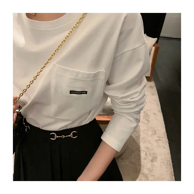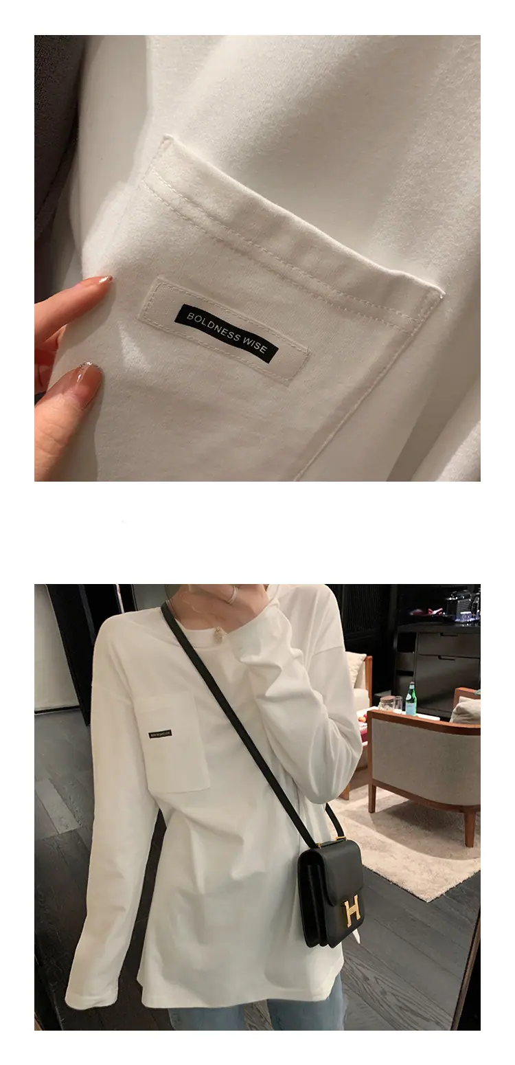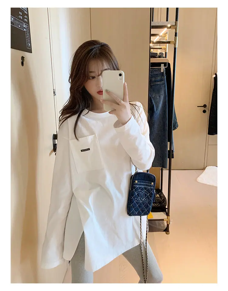 2025 Principios de Otoño Nuevo Blanco Abertura Base Camisa Ropa Interior de Mujer Largo Medio Algodón Bolsillo Reductor de Edad Camiseta de Manga Larga ins