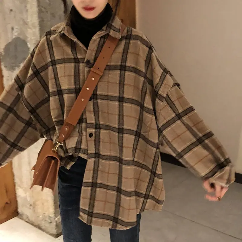 Camisa de cuadros de manga larga para mujer, estilo otoño e invierno, holgada, versión coreana, diseño retro estilo Hong Kong, nicho, versátil, chamarra camisa, tendencia
