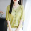 Cárdigan de Punto de Lino Tencel de Verano con Cuello en V, Manga Tres Cuartos, Calado de Crochet, Suelto, Versátil para Mujer