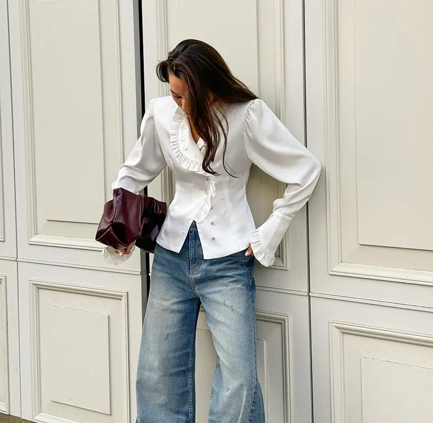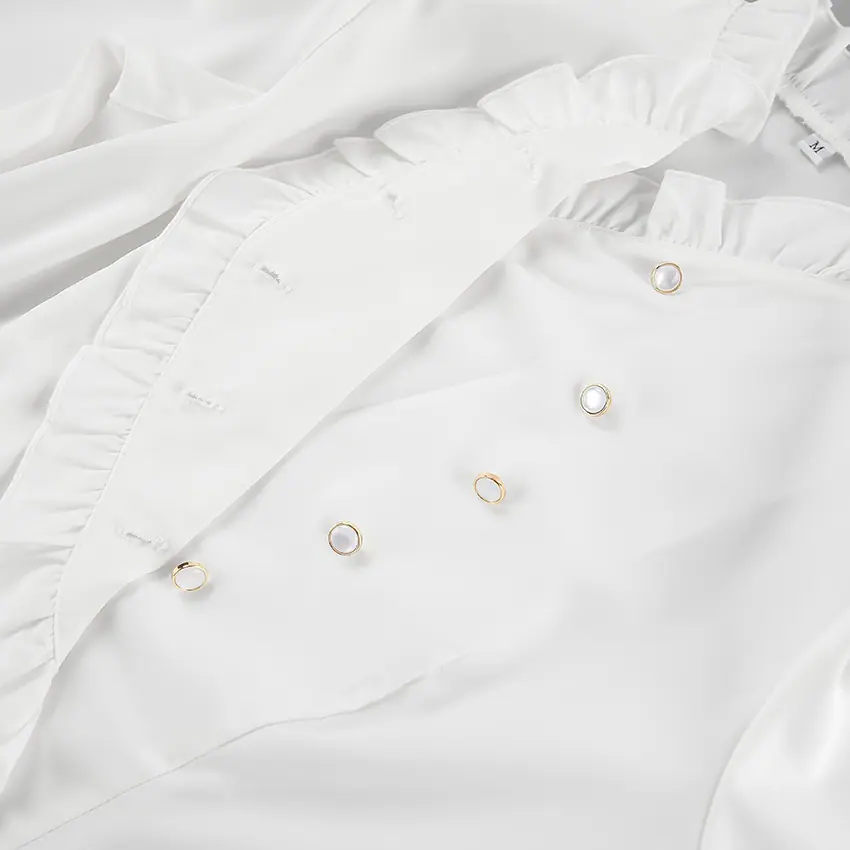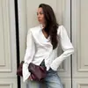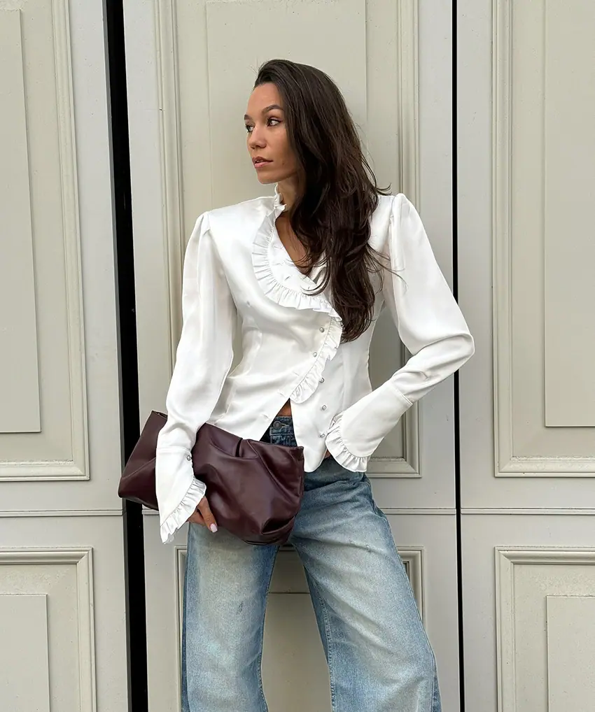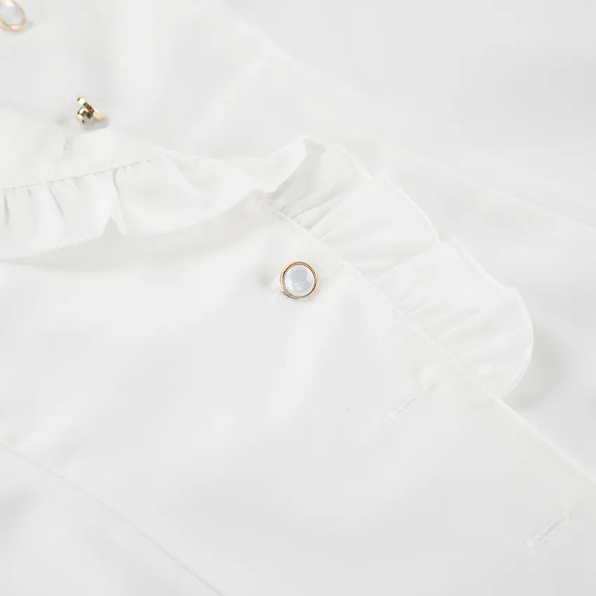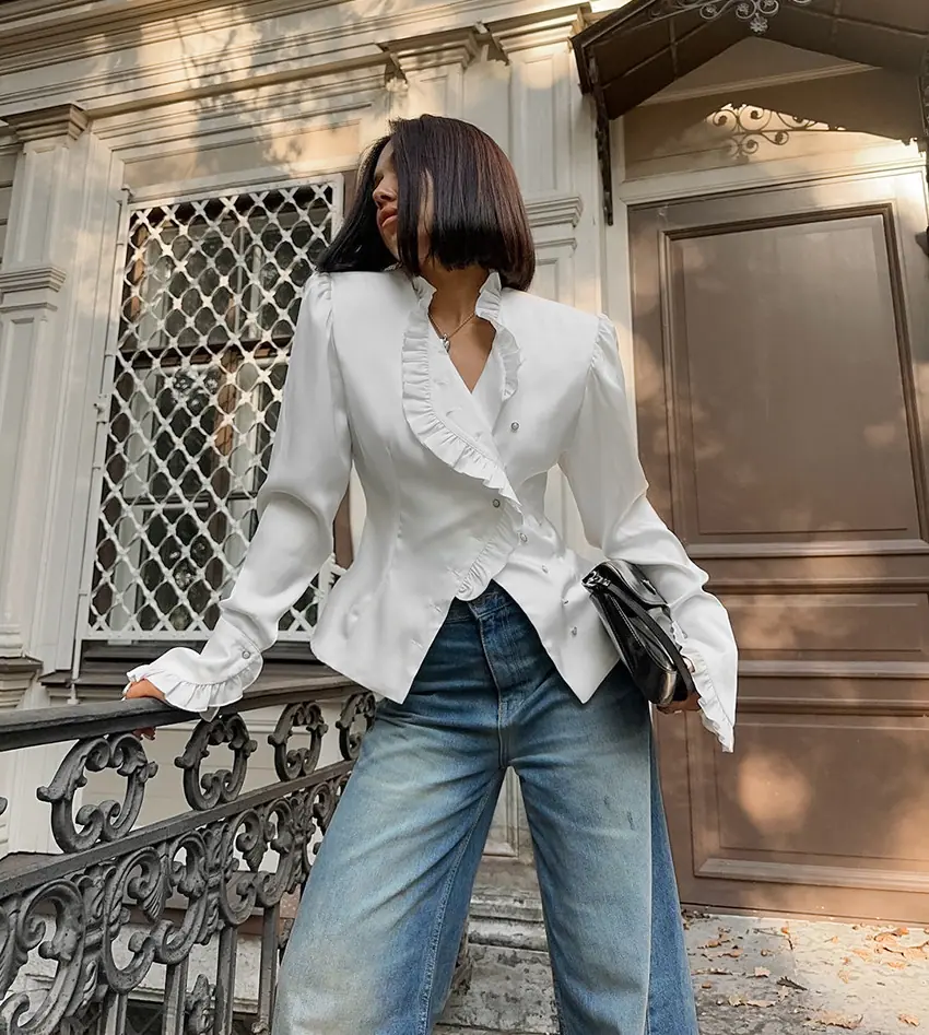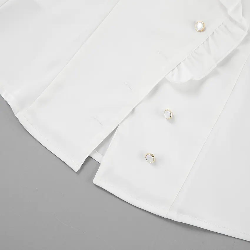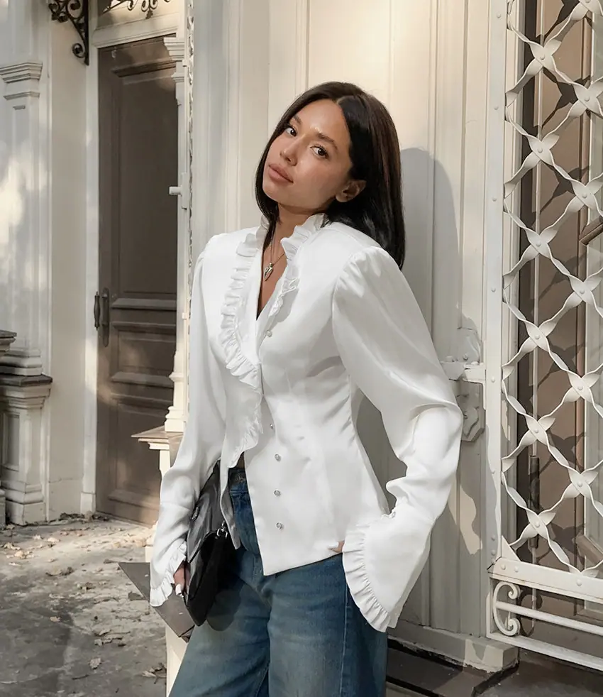Camisa de satén con volantes transfronteriza europea y americana Otoño 2025 Temperamento Ropa interior Adelgazante Top de encaje blanco Ropa de mujer