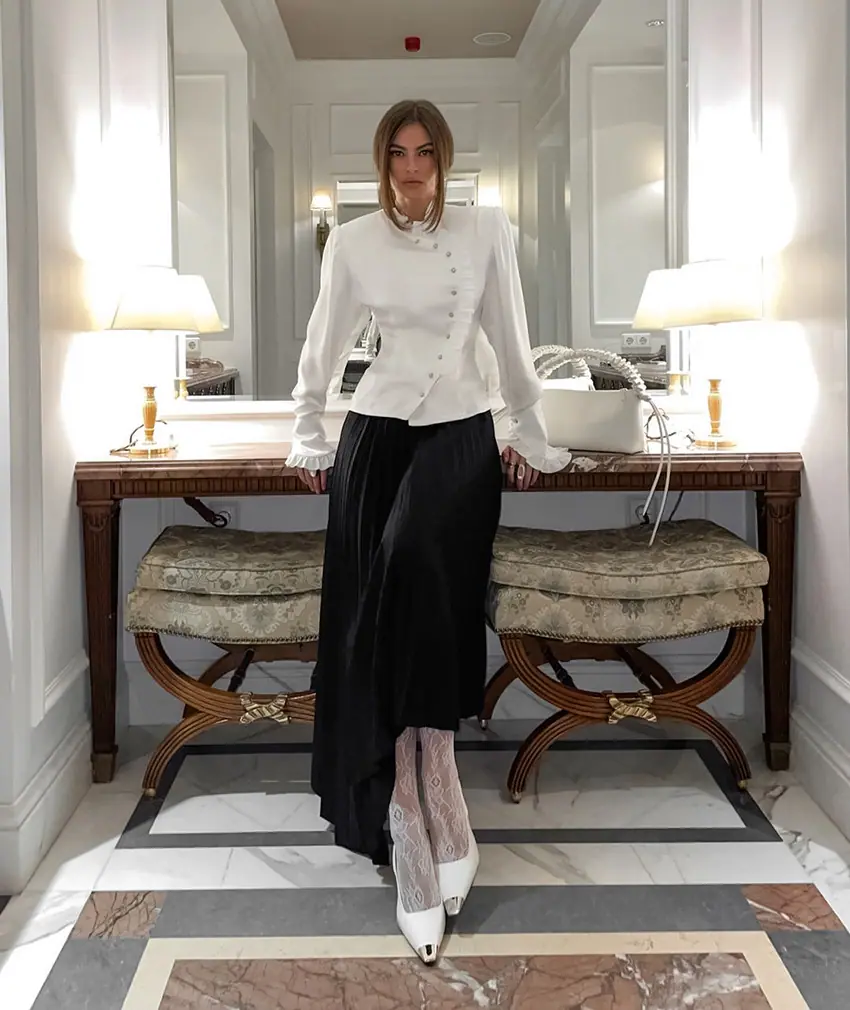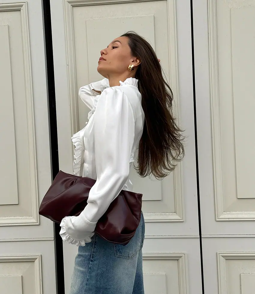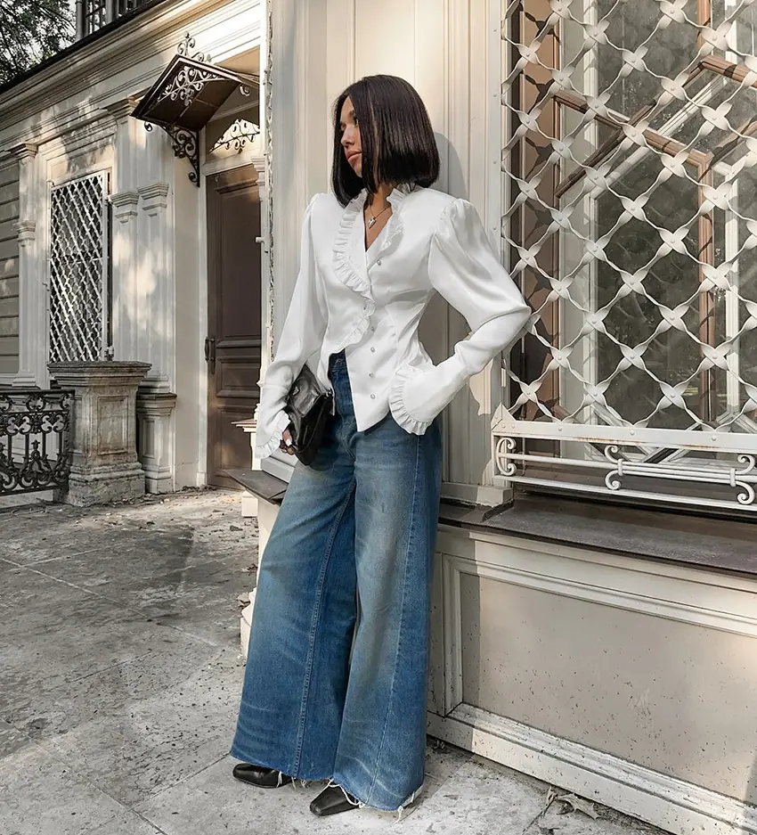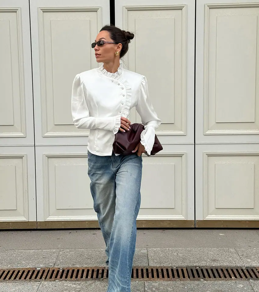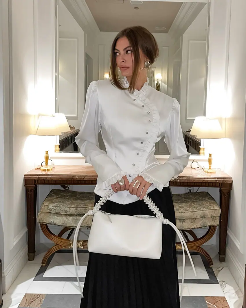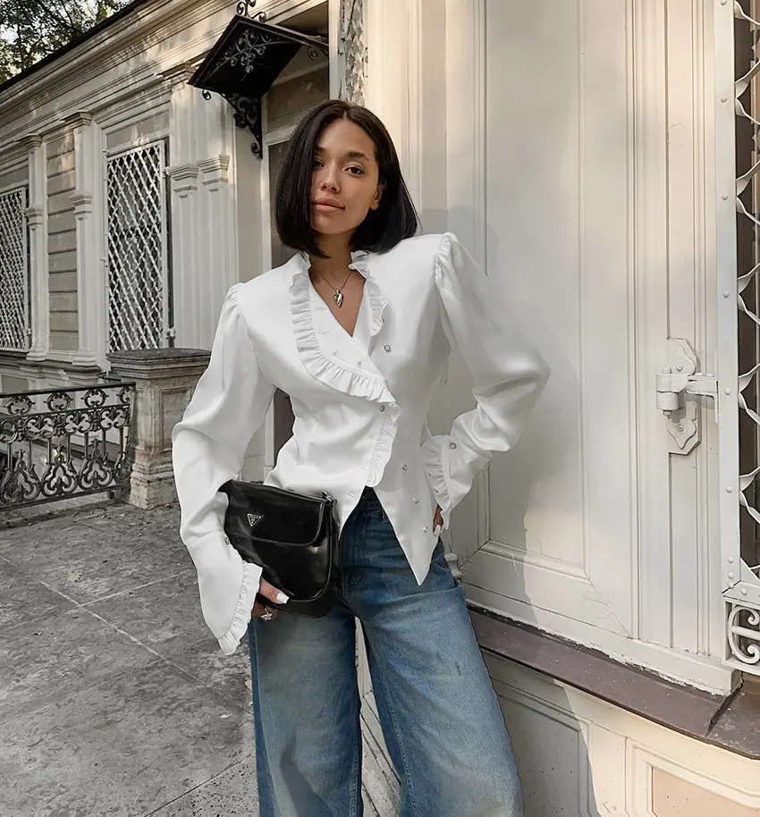 Camisa de satén con volantes transfronteriza europea y americana Otoño 2025 Temperamento Ropa interior Adelgazante Top de encaje blanco Ropa de mujer