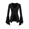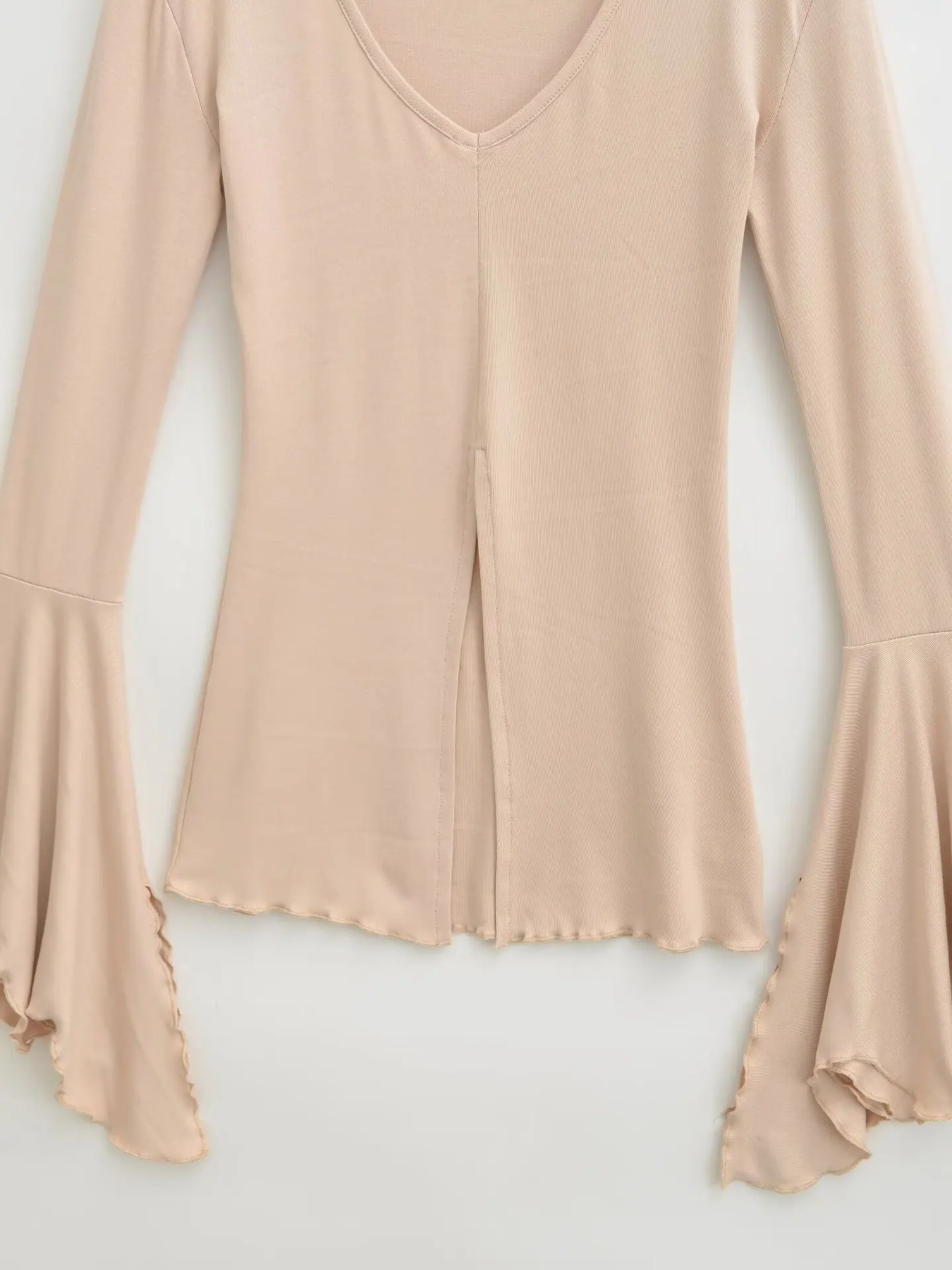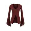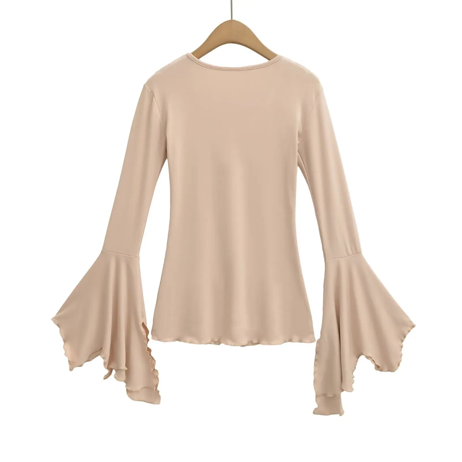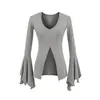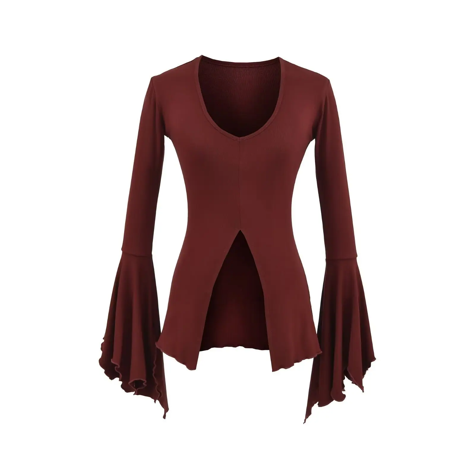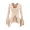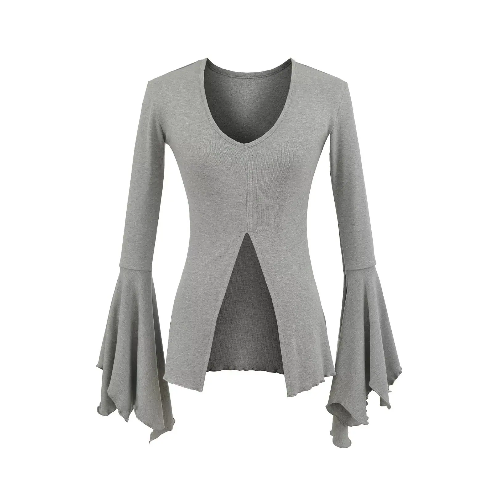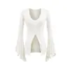 Suéter de Punto con Cuello en V para Chica Picante Americana Manga Acampanada Manga Larga Camiseta para Mujer Otoño Nuevo Adelgazante Diseño con Abertura Sentido Camisa Básica
