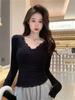 Camiseta Básica Sexy de Encaje con Cuello en V Estilo Pura Pasión para Mujer Otoño Nueva Ajustada Delgada de Manga Larga Top Interior
