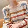 Suéter de Punto a Rayas de Manga Larga con Cuello Redondo para Mujer 2025 Nuevo Primavera y Otoño Versión Coreana Casual con Calados Elegante Versátil Top Adelgazante
