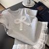 Compra Playera Gris de Encaje con Lazo de Manga Corta para Mujer Verano 2025 Nuevo Diseño Top de Hombro Derecho Corto a la Cintura al por mayor en Joom.pro