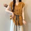 Talla Extra Estilo Coreano Sencillo Diseño de Cuello en V Camisa de Bufanda de Seda Abotonada para Mujer Verano Nuevo Holgada Aspecto Adelgazante Top Versátil