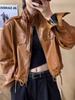 Chaqueta de Cuero Estilo Motocicleta Retro Americana con Cuello Mao para Mujer 2025 Otoño Nuevo Corta con Cordón Versátil Abrigo de Cuero PU