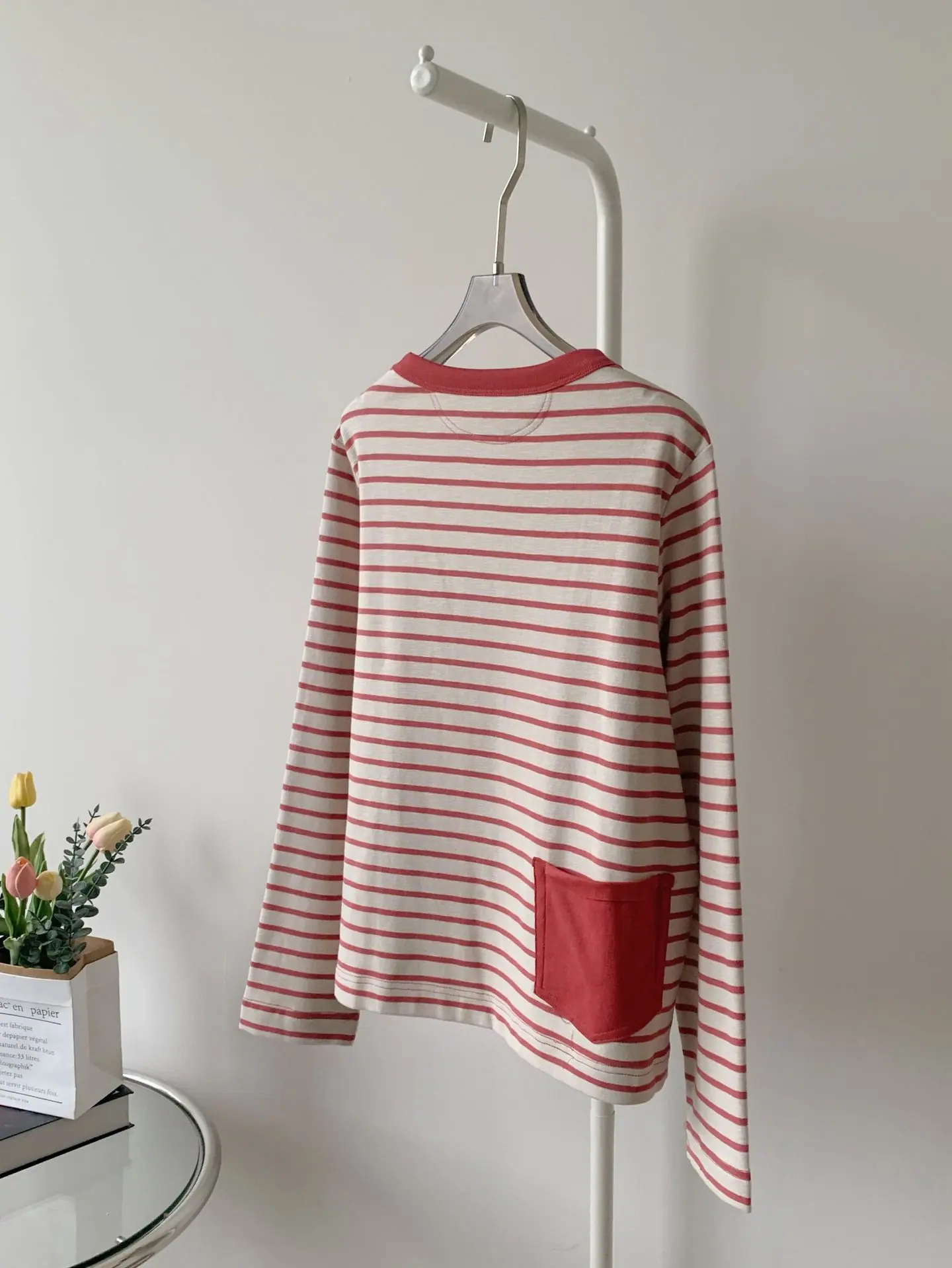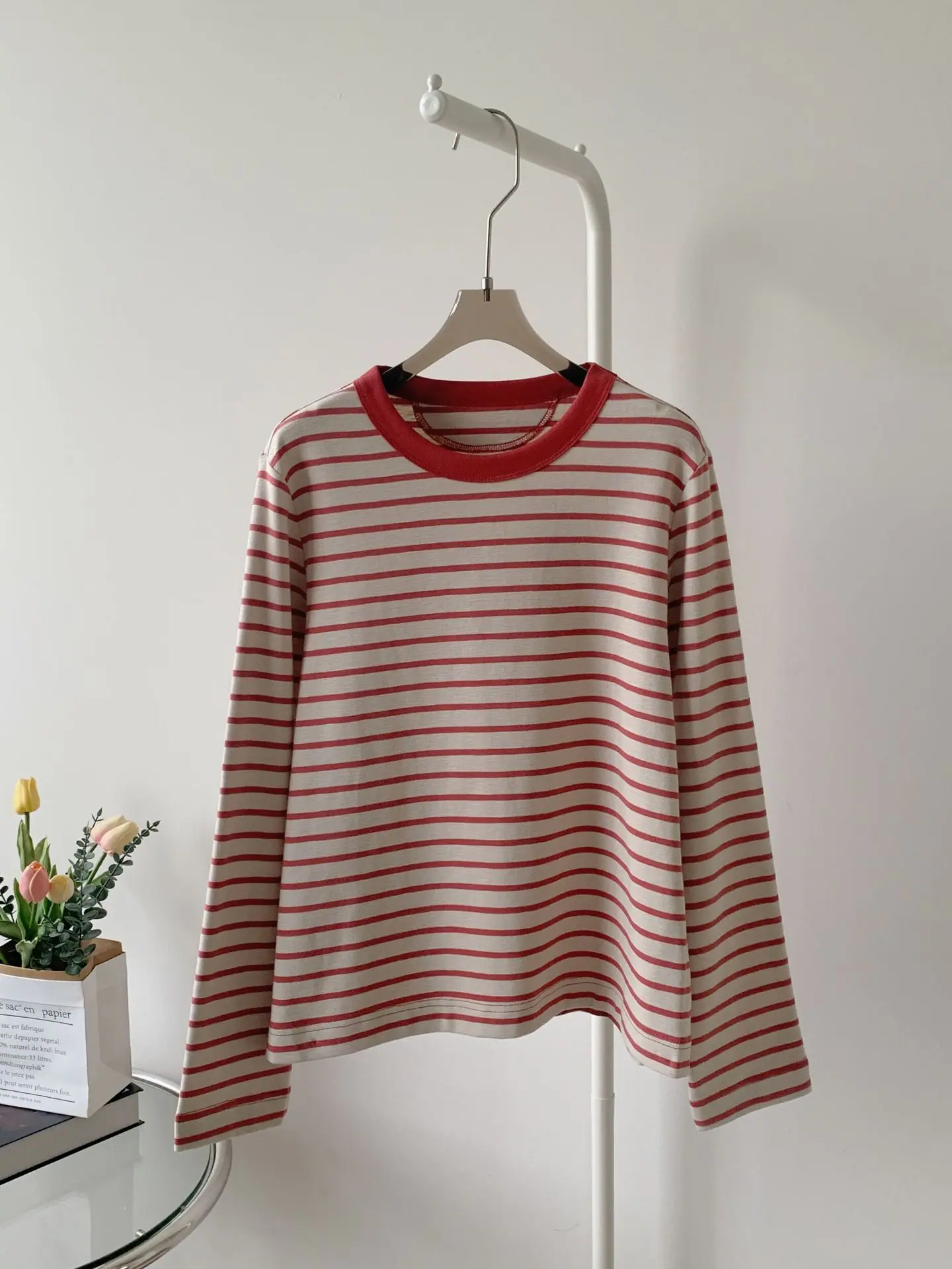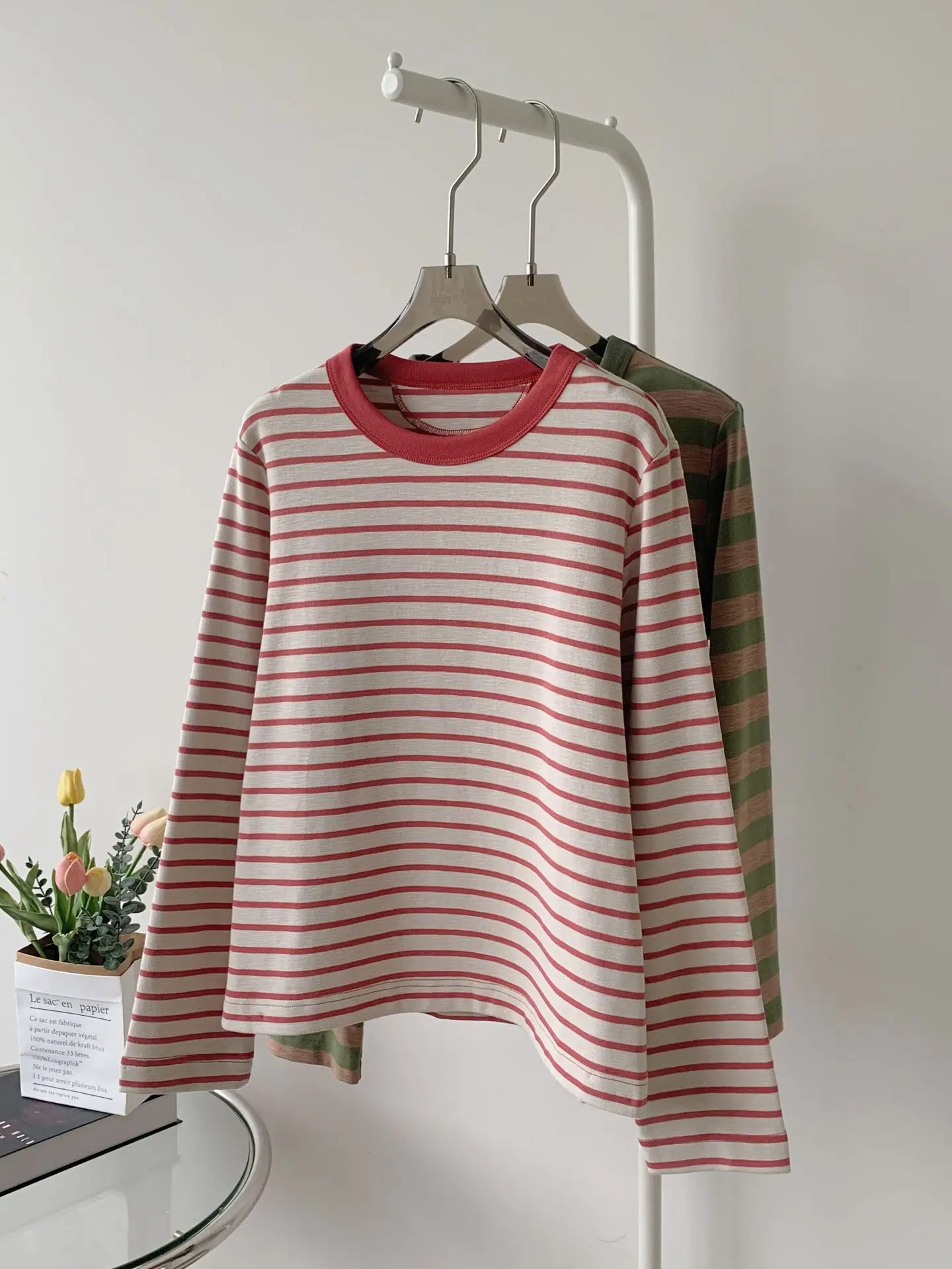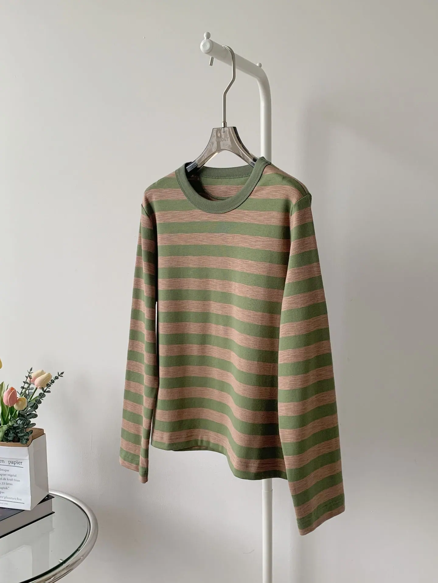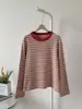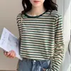 Camiseta Básica Rayada de Principios de Otoño para Mujer Ropa Interior Moda Cuello Redondo Holgada Versátil Camiseta de Manga Larga Casual Top de Algodón Puro Fino