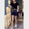 88530 Daaimaiyiyuan 2025 Verano Nuevo Color Sólido Negro Camiseta de Manga Corta Shorts de Mezclilla de Cintura Alta Ropa Adelgazante para Mujer