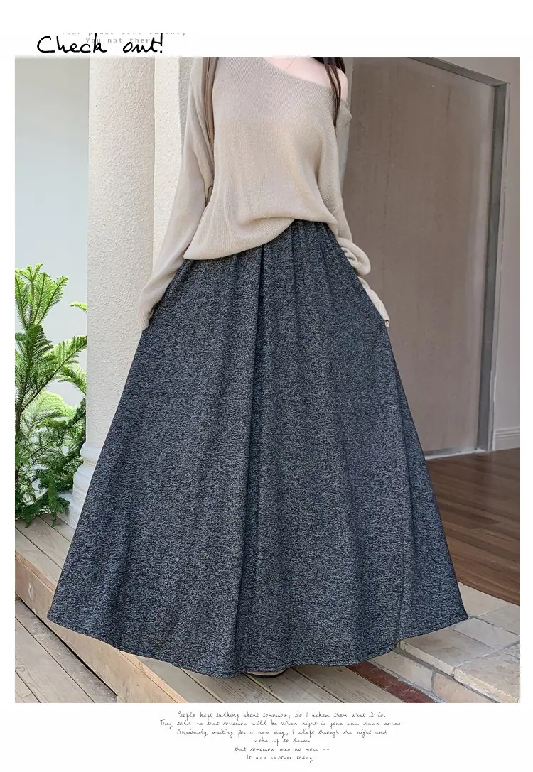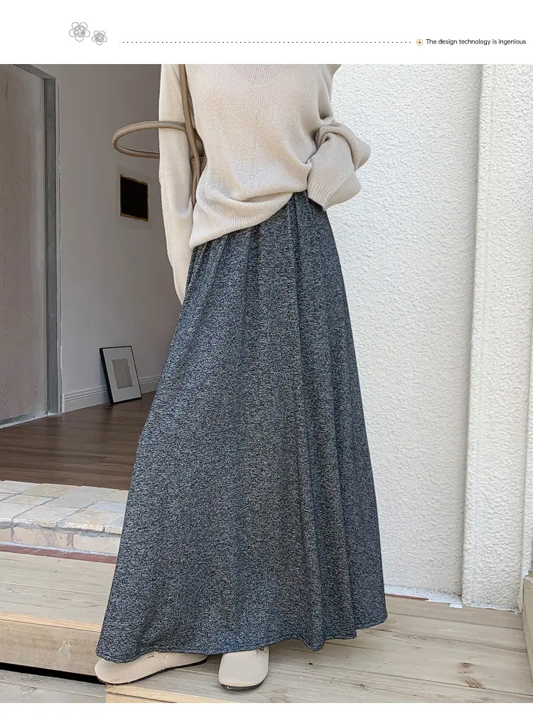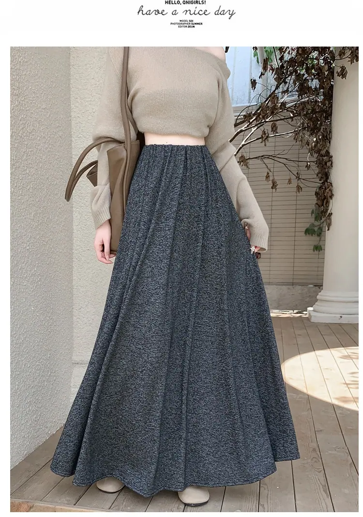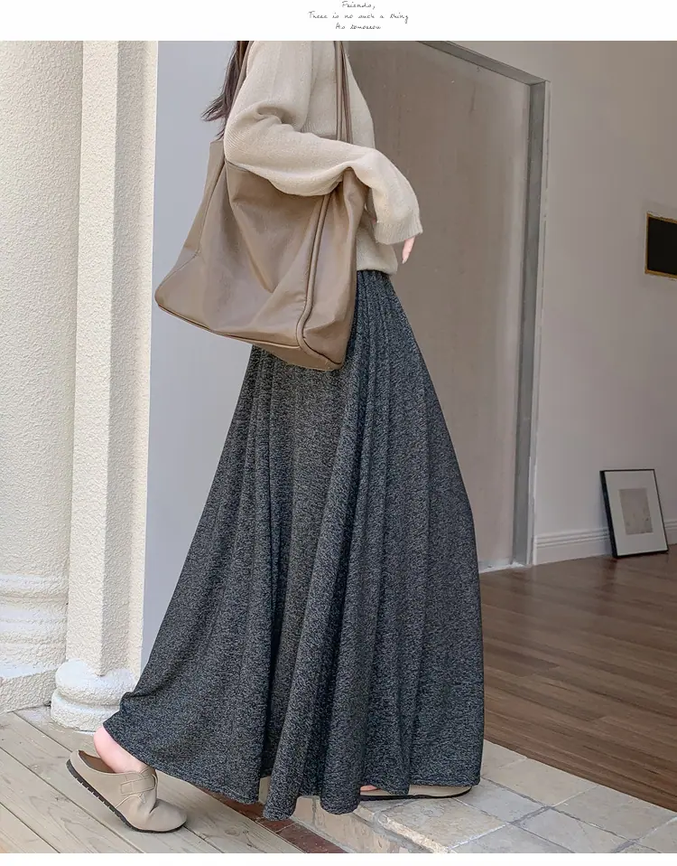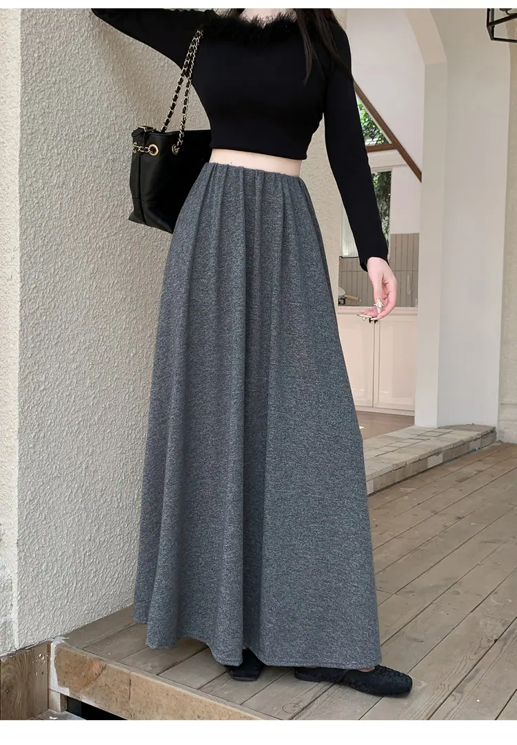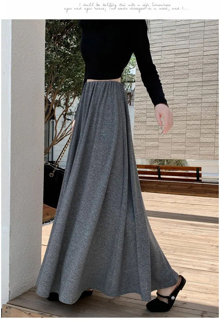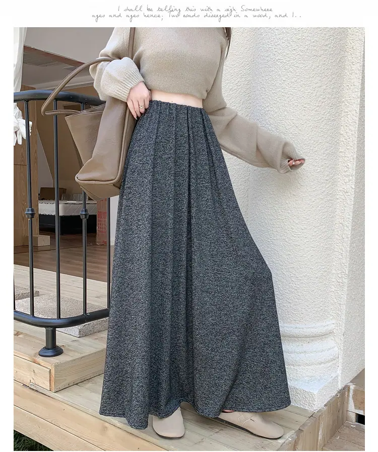 Falda de Cintura Alta Estilo Holgado Mujer Otoño Adelgazante Versátil Cintura Elástica Falda Larga A-line Falda Acampanada Falda de Punto