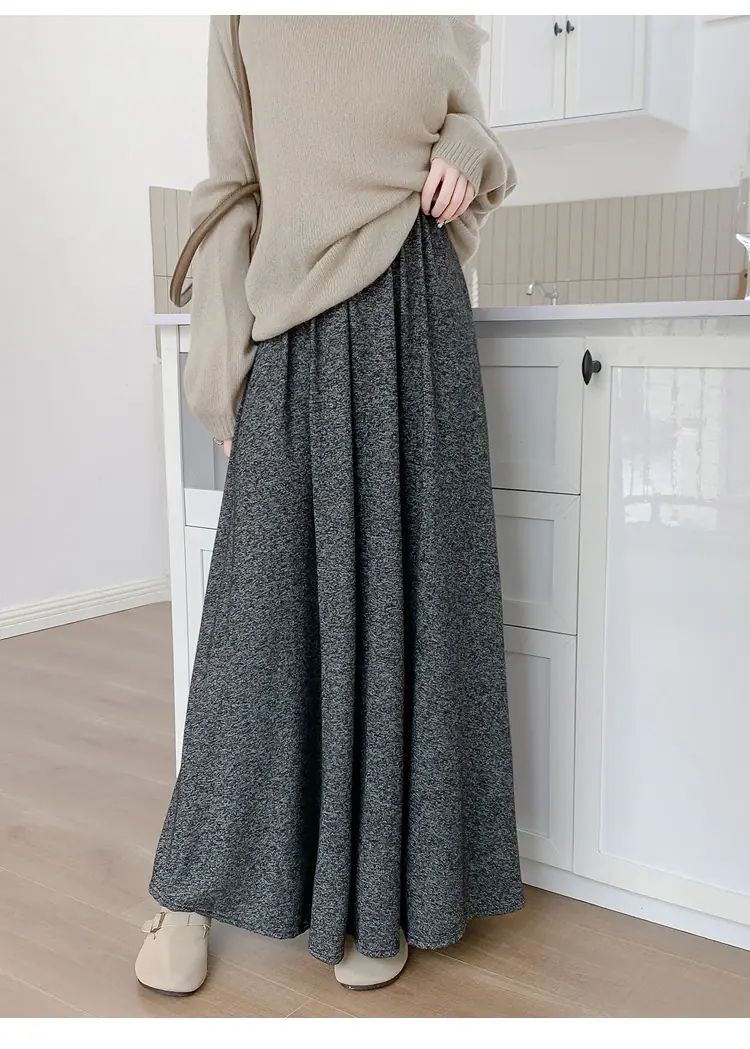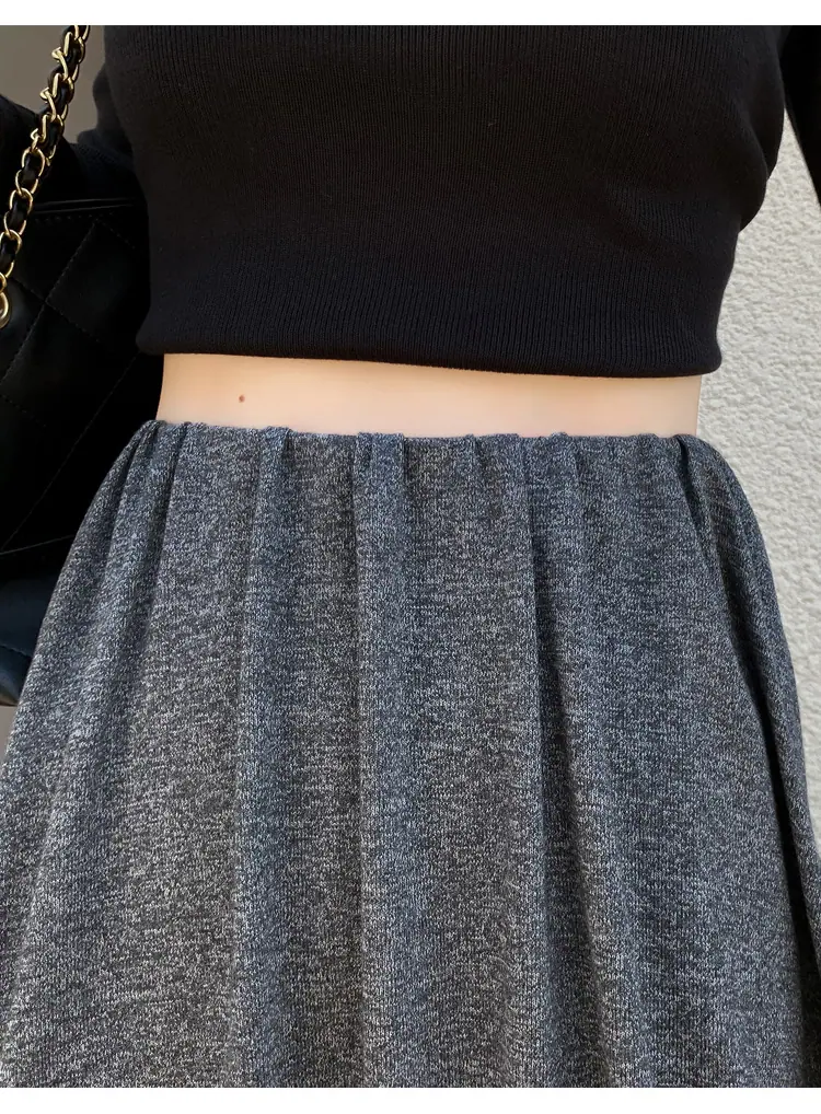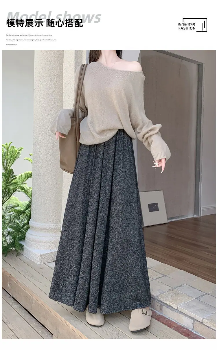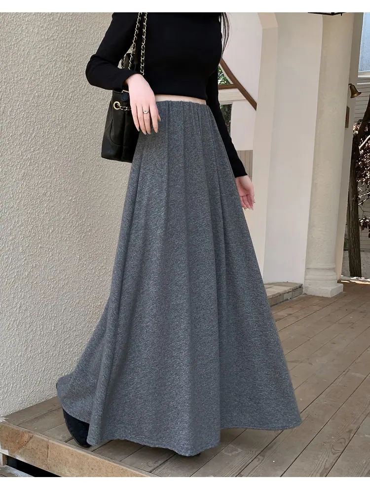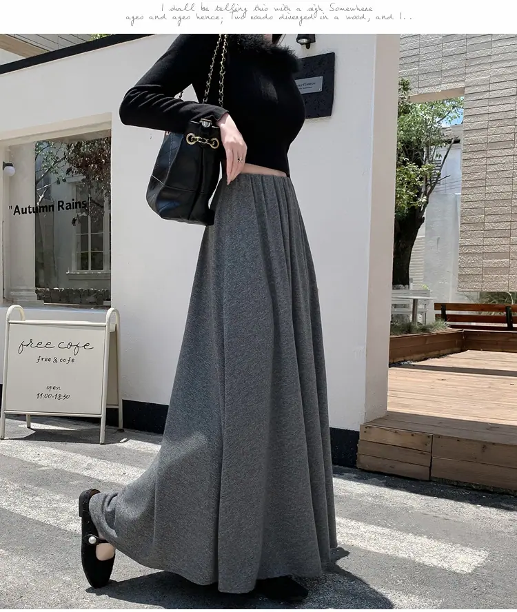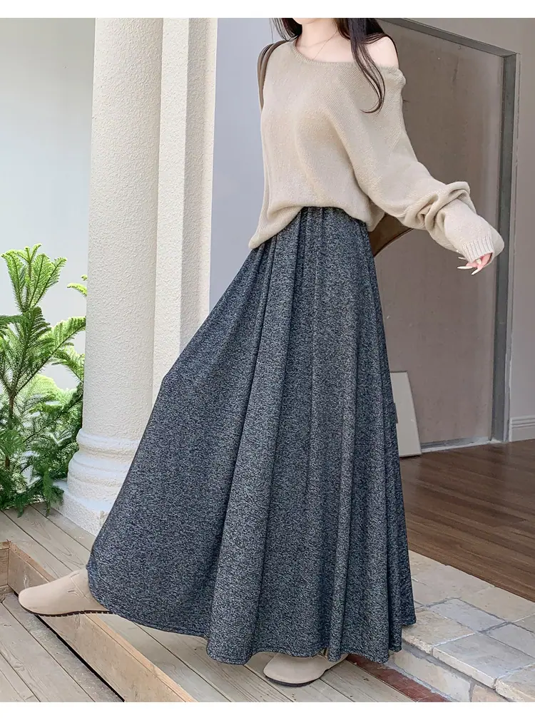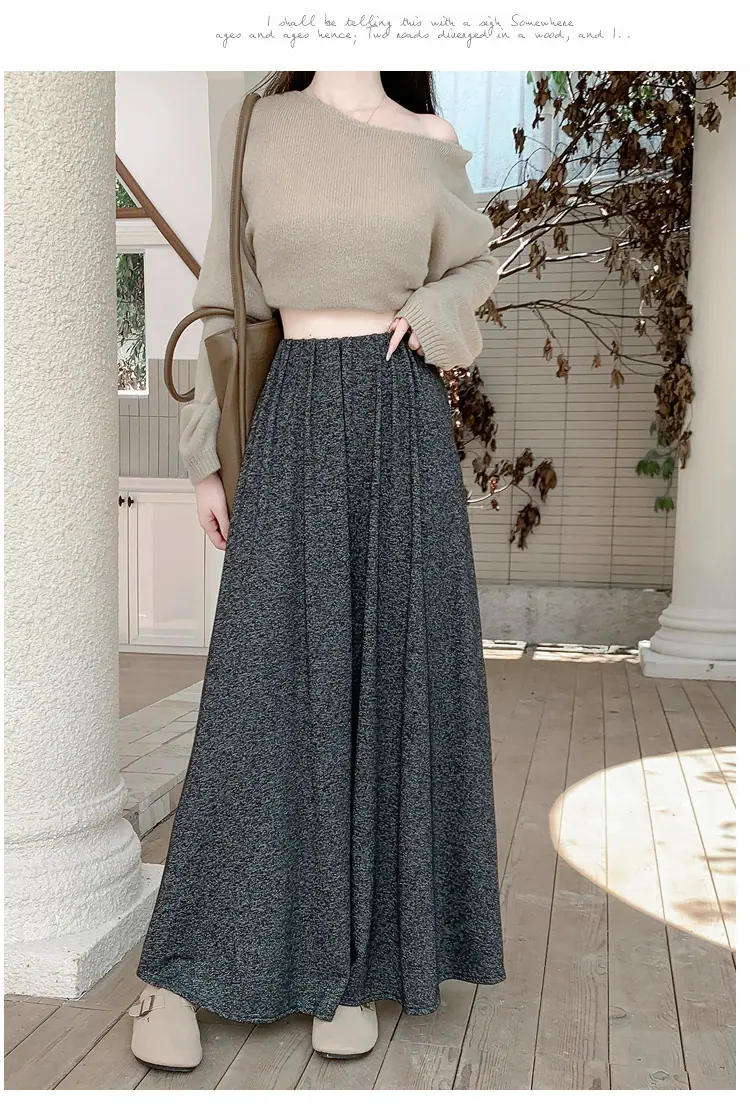 Falda de Cintura Alta Estilo Holgado Mujer Otoño Adelgazante Versátil Cintura Elástica Falda Larga A-line Falda Acampanada Falda de Punto