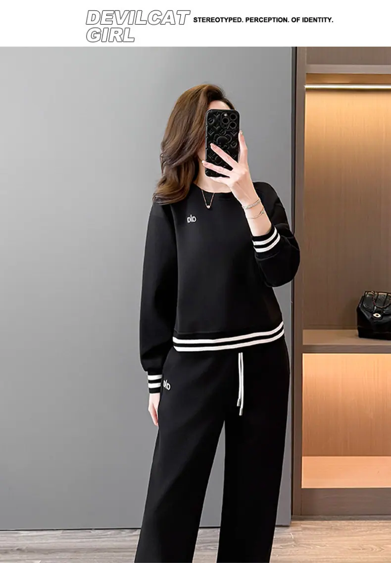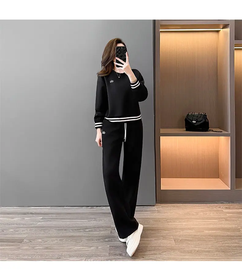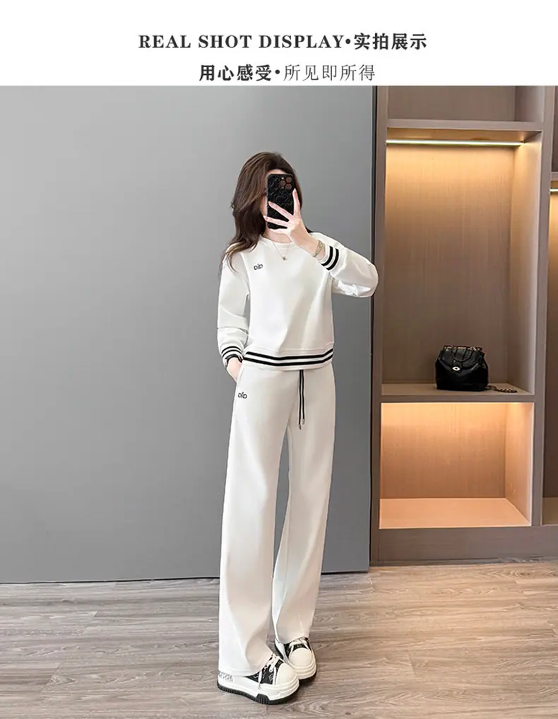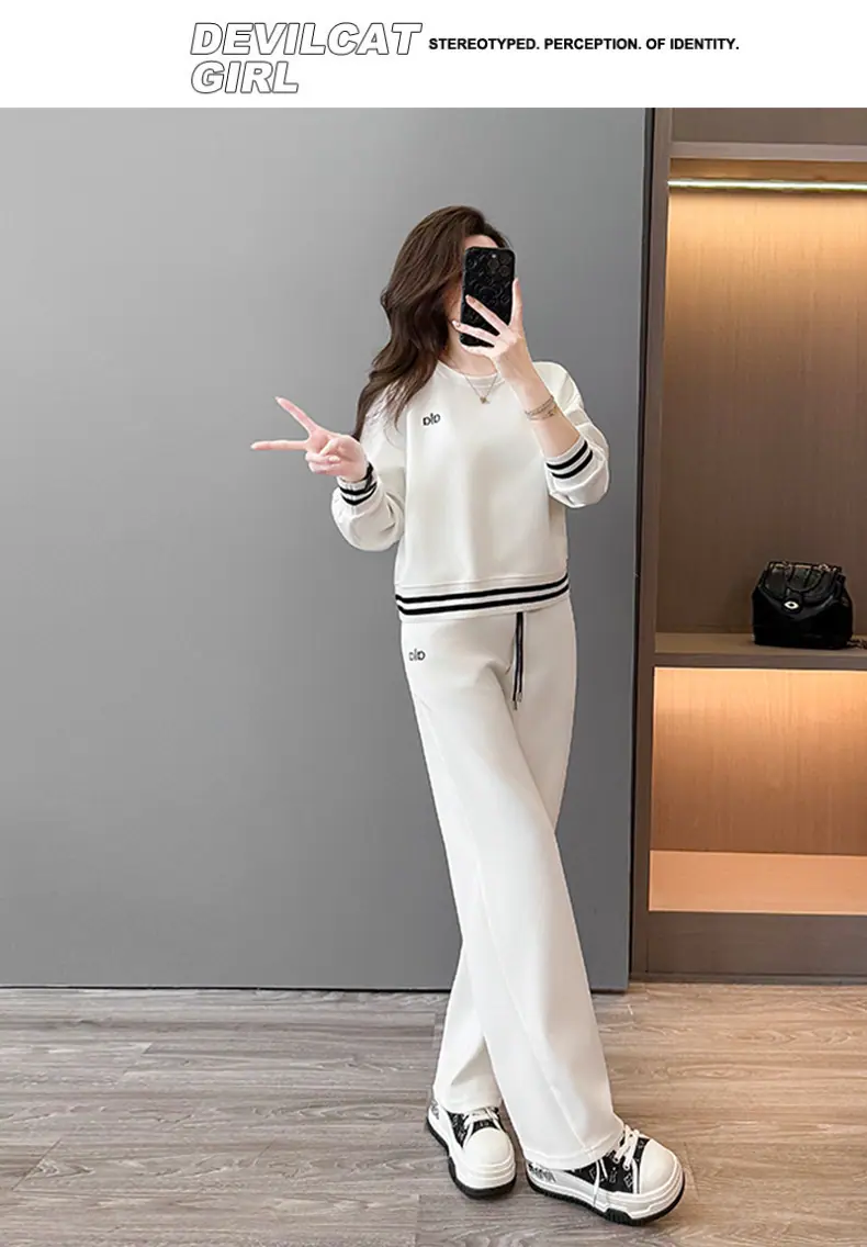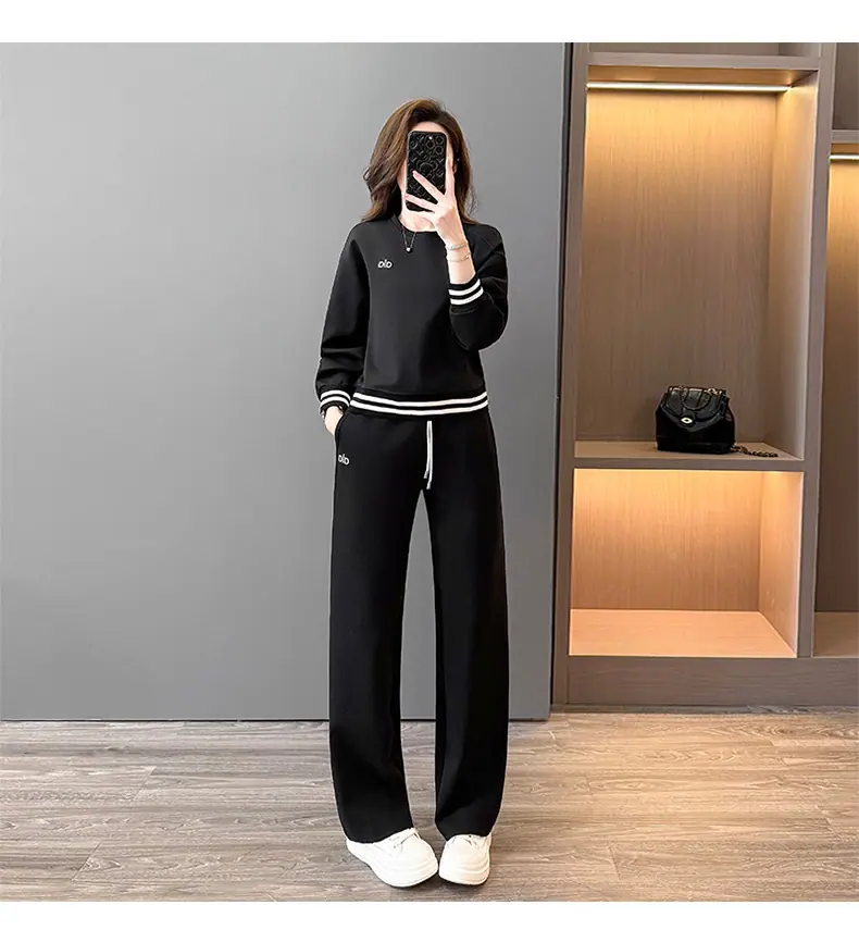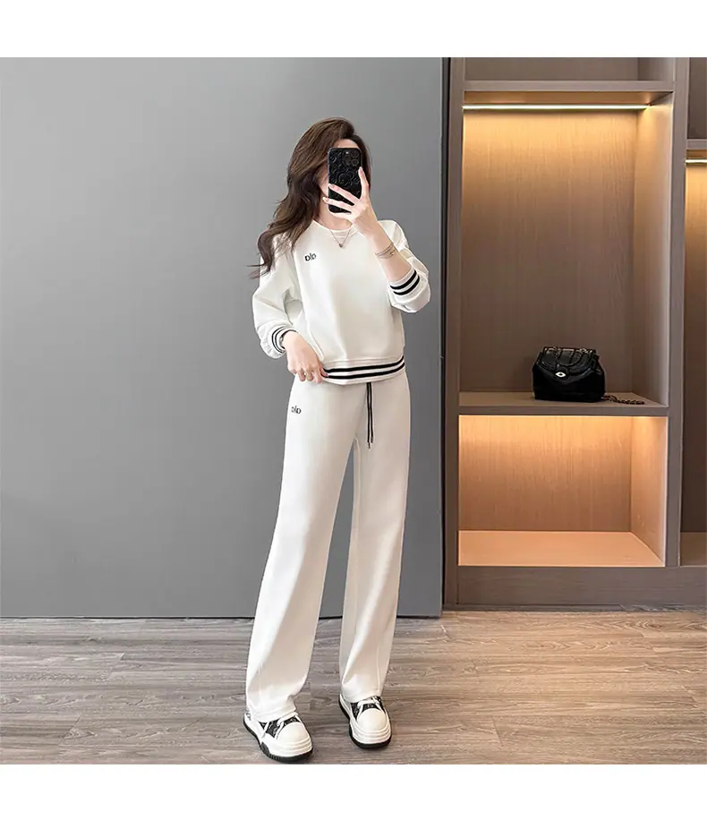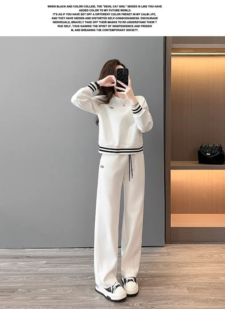 Conjunto de Ropa Deportiva Casual de Alta Gama de Estación Europea para Mujer 2025 Moda Otoño Reductor de Edad Top de Manga Larga Pantalones de Pierna Ancha Conjunto de Dos Piezas