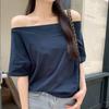 Camiseta de Algodón Puro de un Hombro y Manga Corta para Mujer Verano Nueva Dulce Sexy Hombro Inclinado Diseño Suelto de Media Manga Top con Hombros Descubiertos