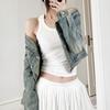 Diseño Nicho Estilo Retro Americano Lavado Desgastado Chaqueta de Mezclilla de Un Hombro Nuevo Diseño Set Top para Damas