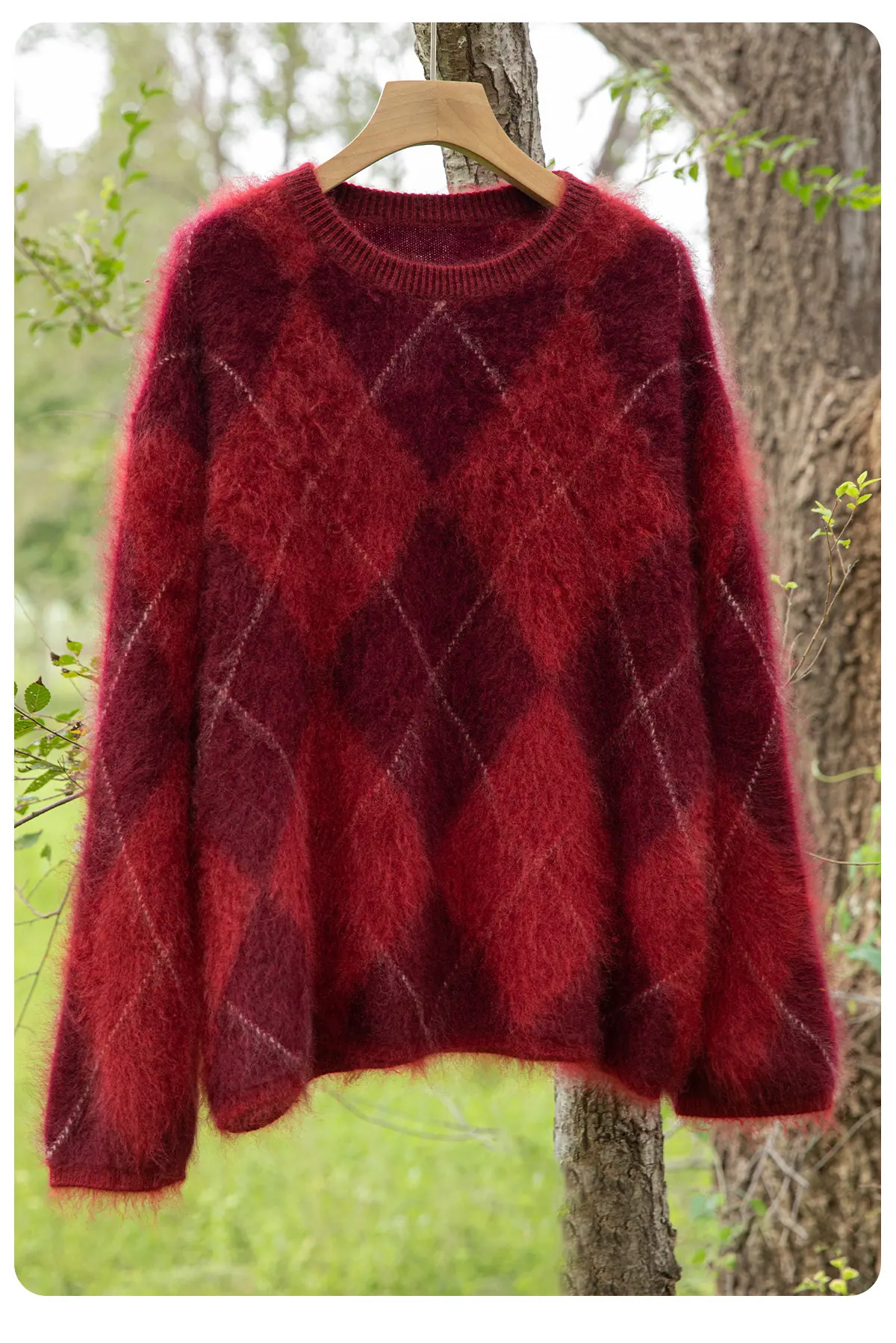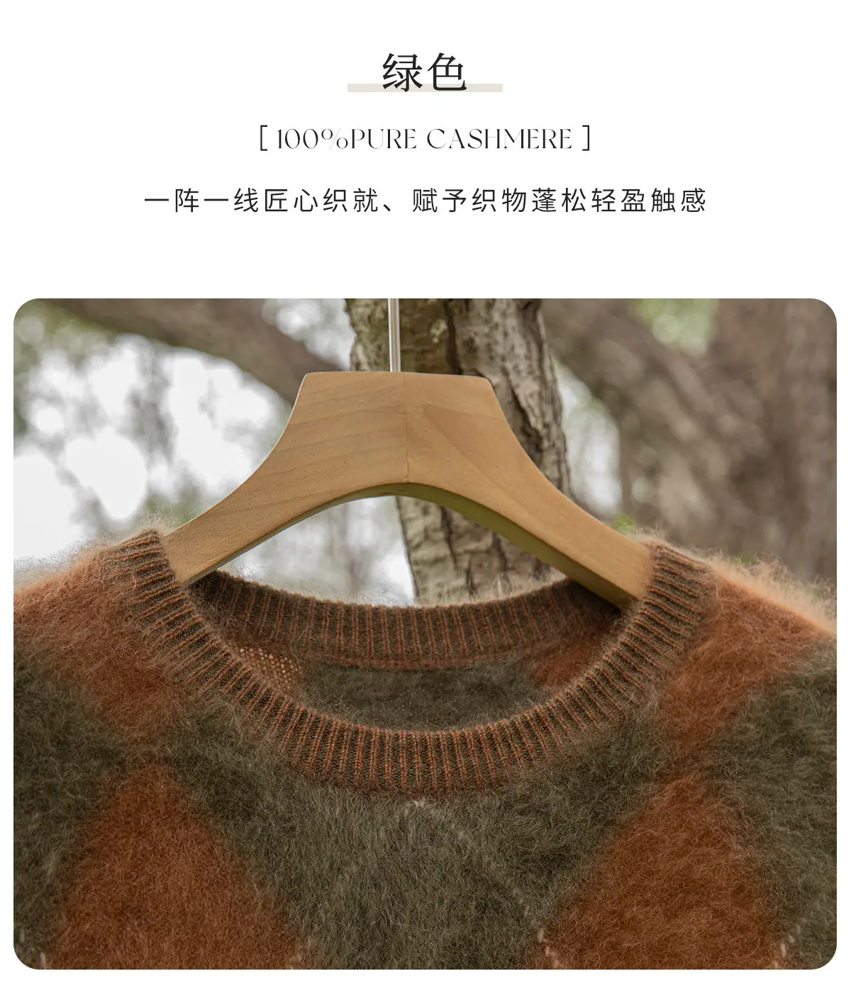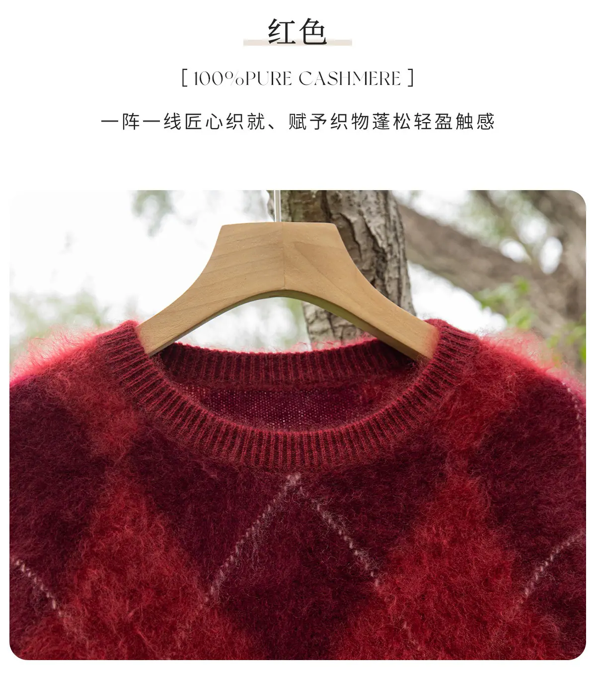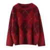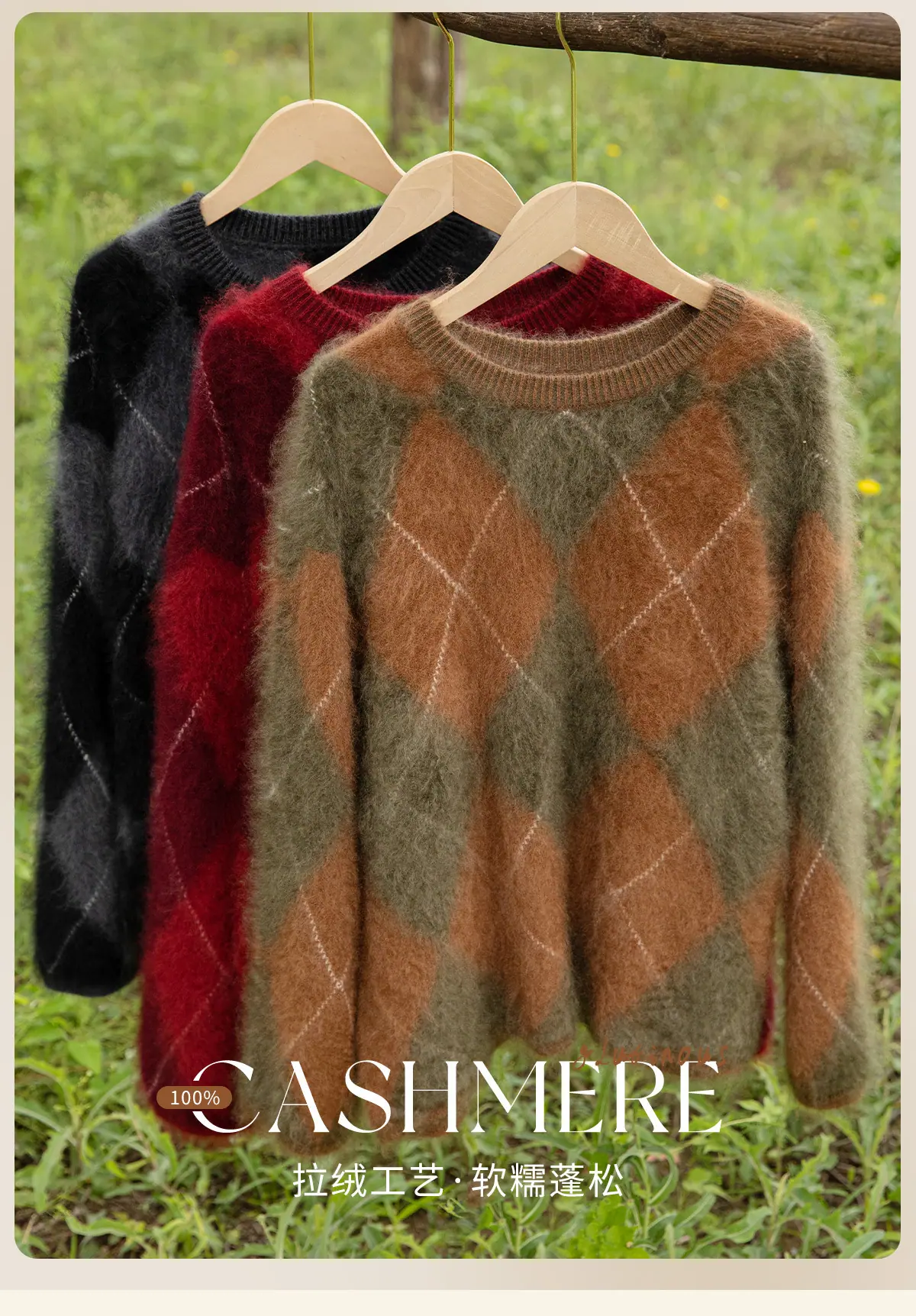 Primera capa tejida 100% Cachemira Pura Cuello Redondo Cepillado Argyle Cuello Redondo Suave y Amigable con la Piel Suéter Grueso para Mujer