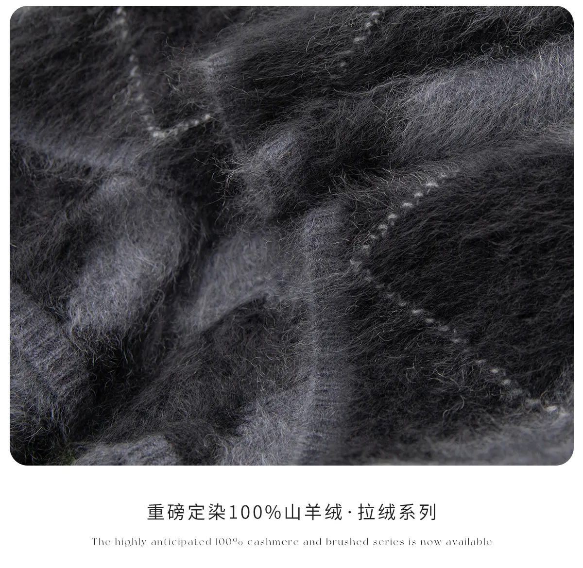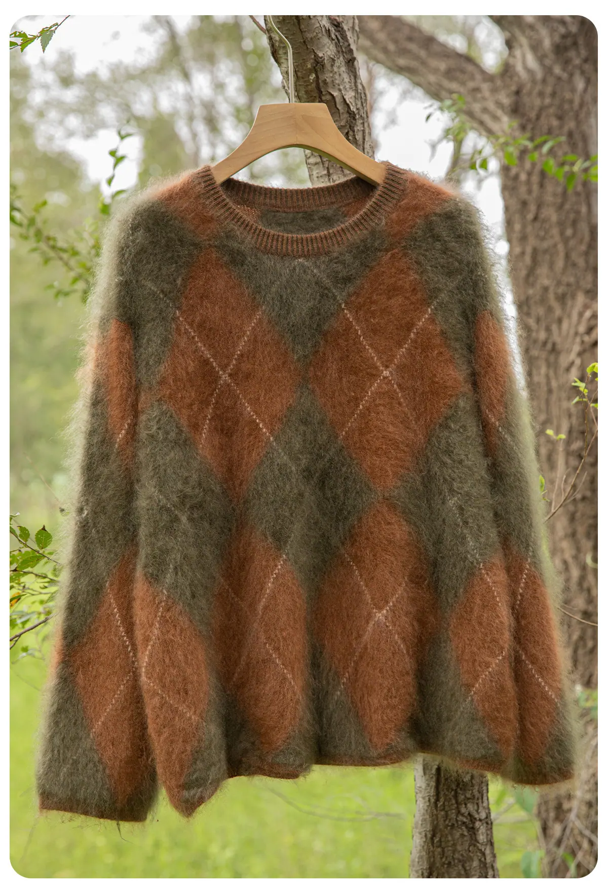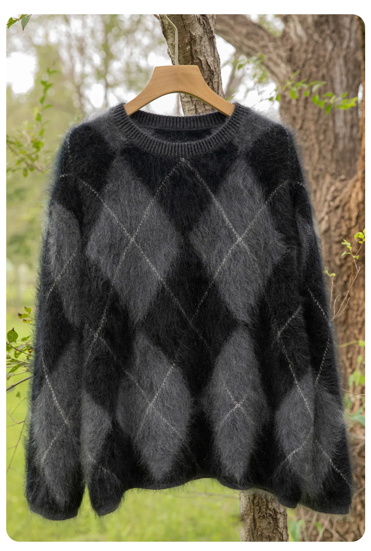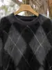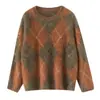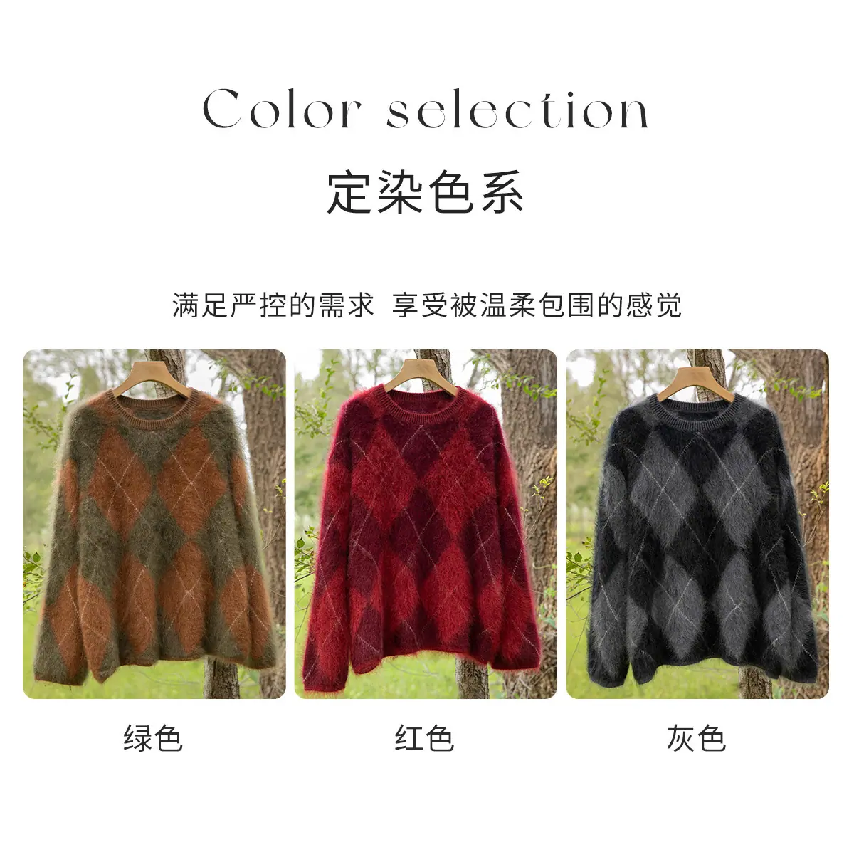 Primera capa tejida 100% Cachemira Pura Cuello Redondo Cepillado Argyle Cuello Redondo Suave y Amigable con la Piel Suéter Grueso para Mujer