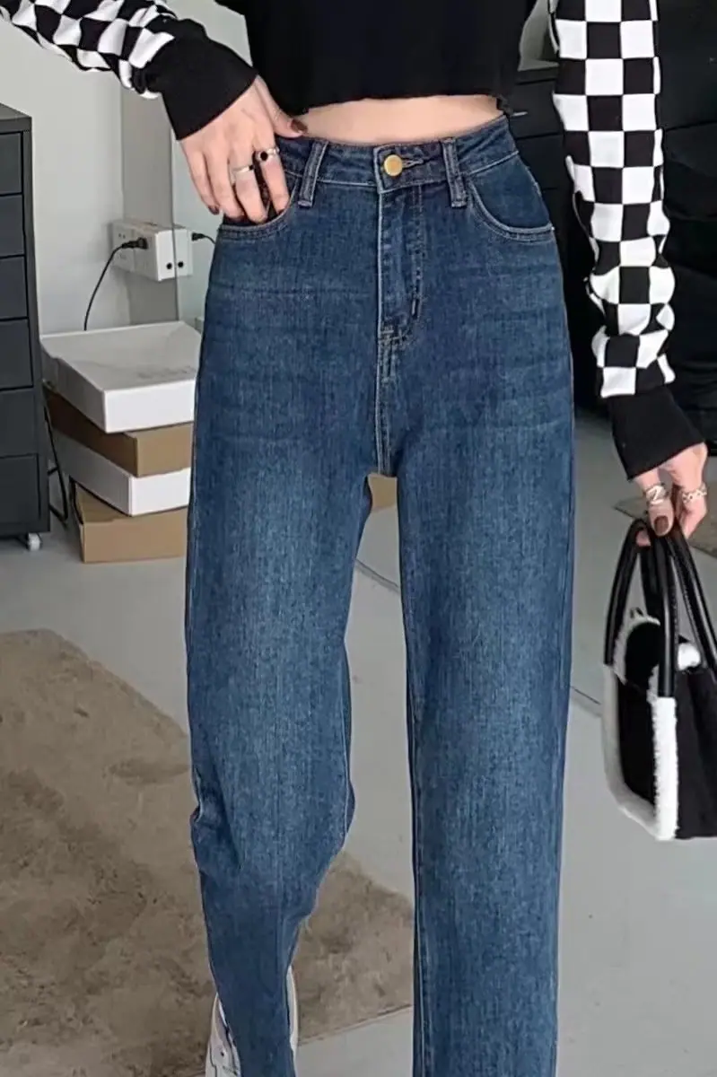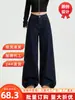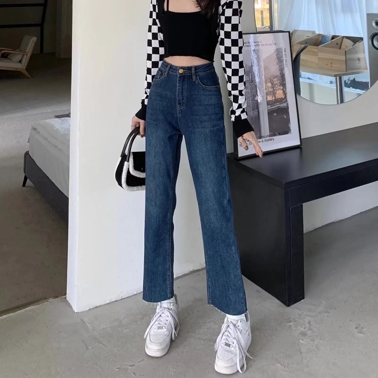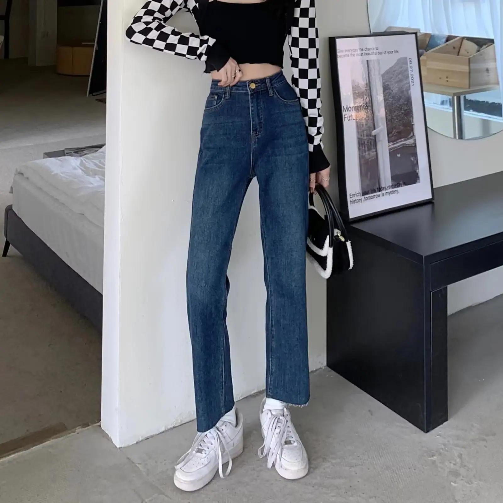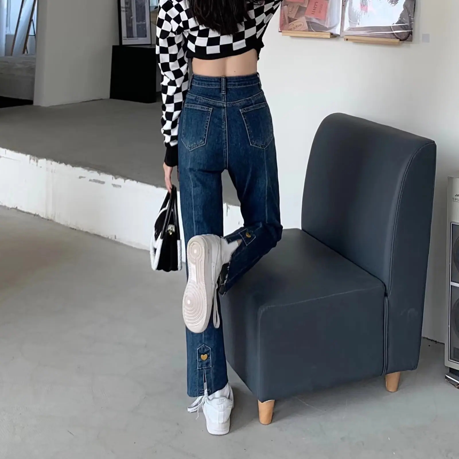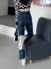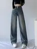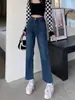 Jeans rectos de pierna ancha con abertura de talle alto azul lavado para mujer 2025 primavera nuevos pantalones largos ajustados y realzadores de la altura