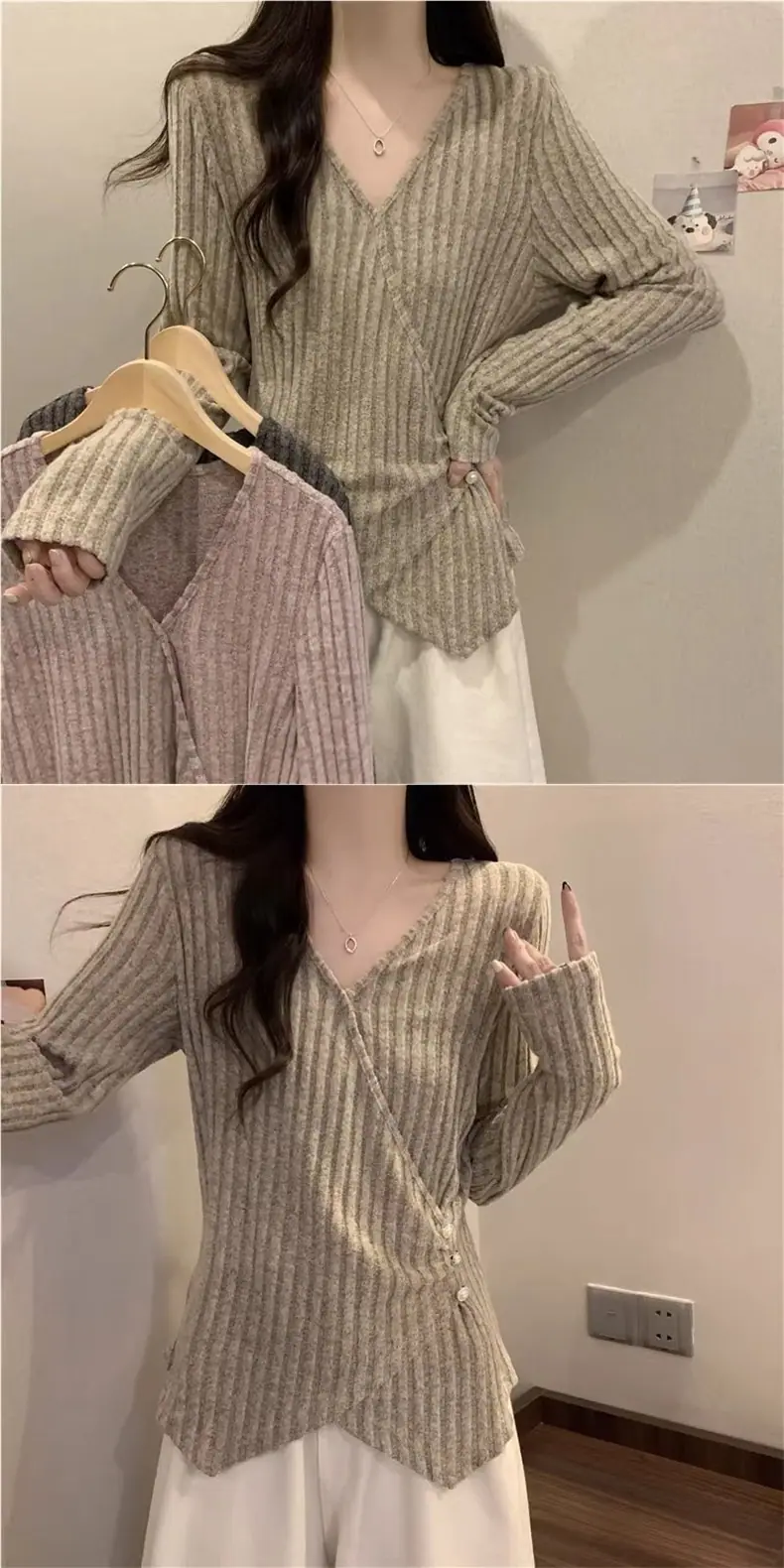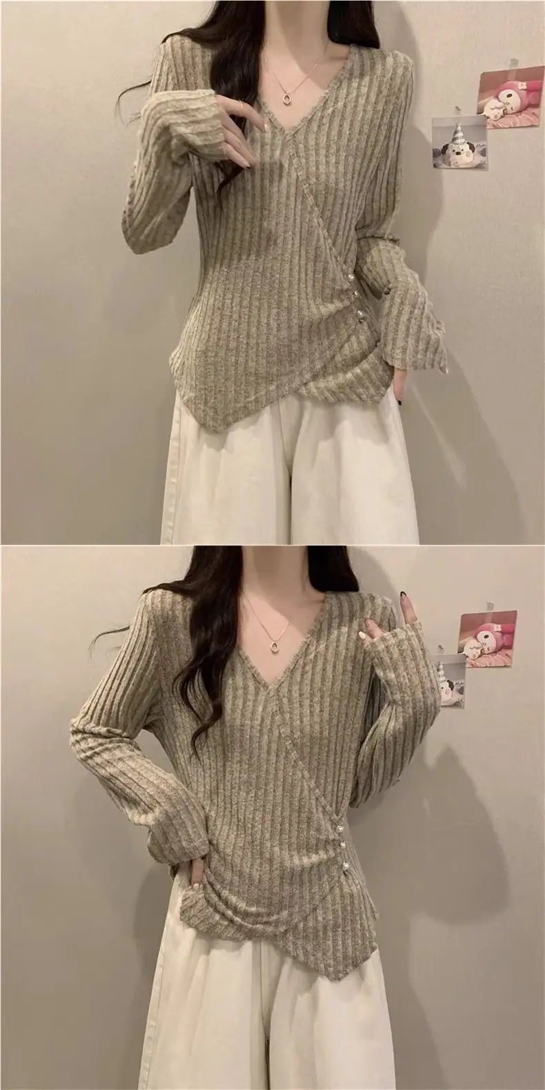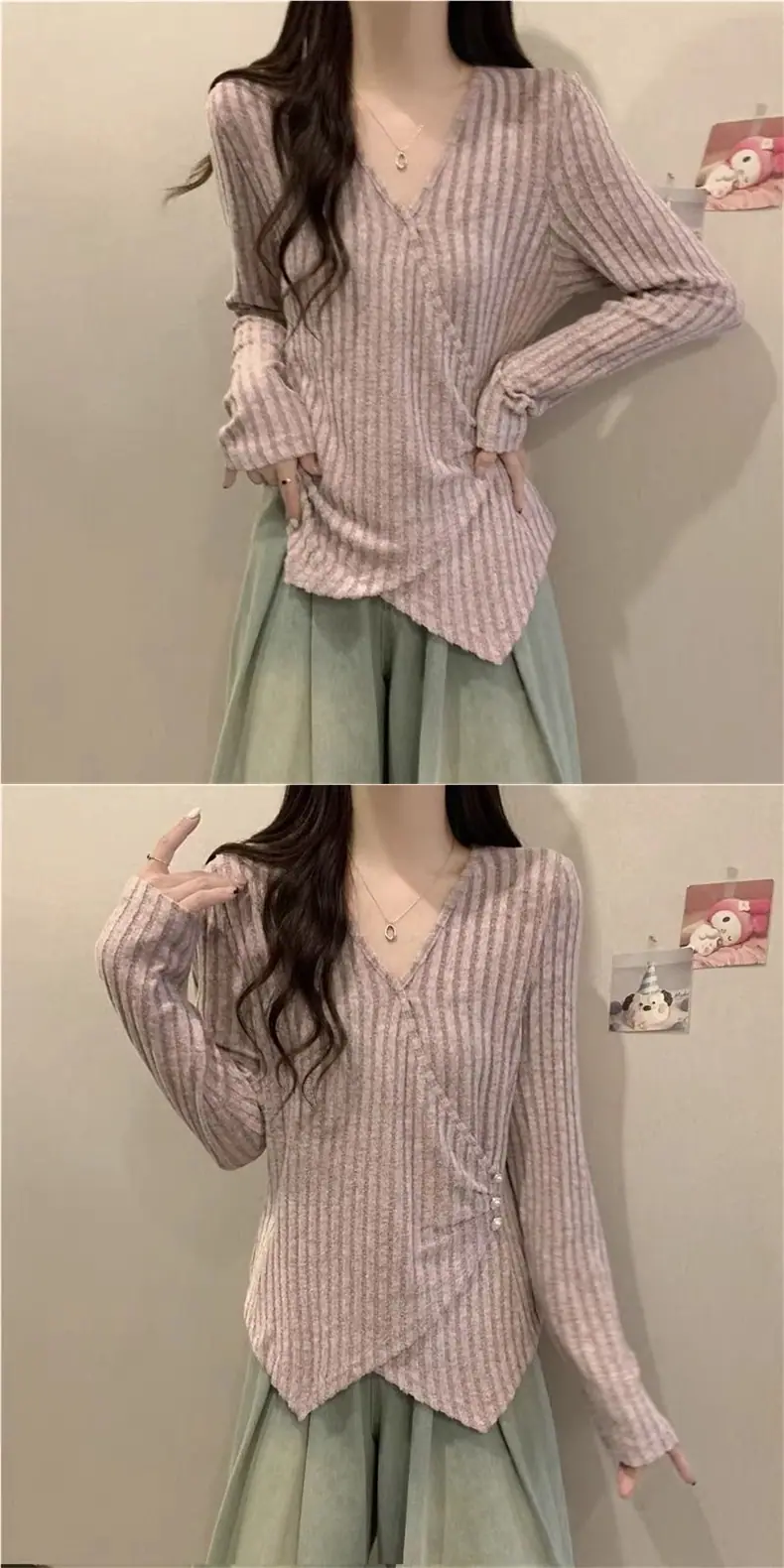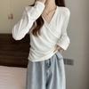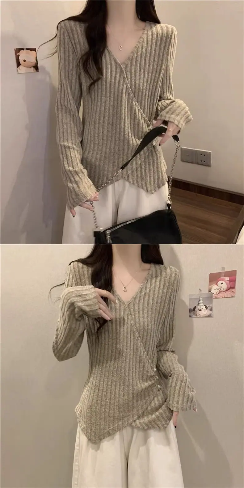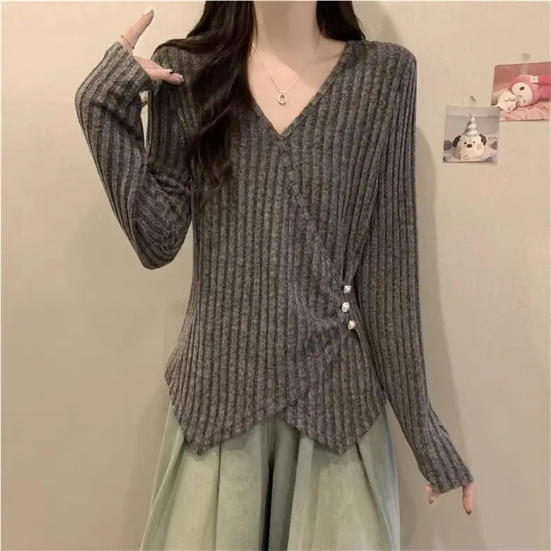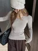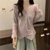 Talla Grande Primavera Otoño Sentido del Diseño Nicho Adelgazante Manga Larga Camiseta de Mujer Nueva Irregular Camiseta Base Cuello Hombro Recto Top