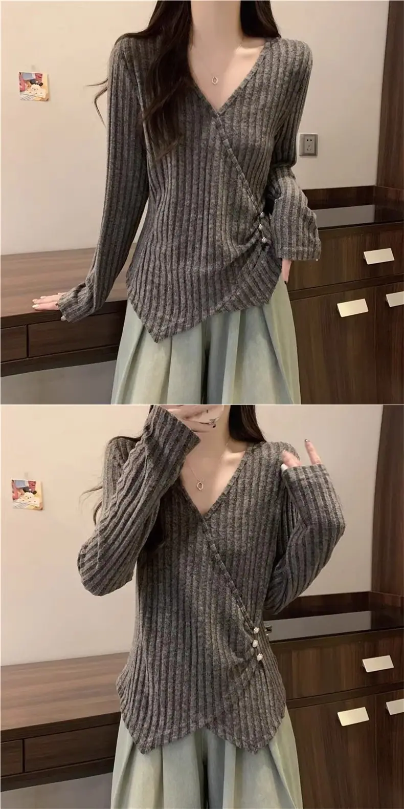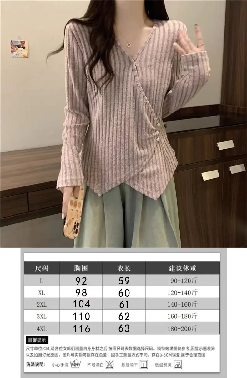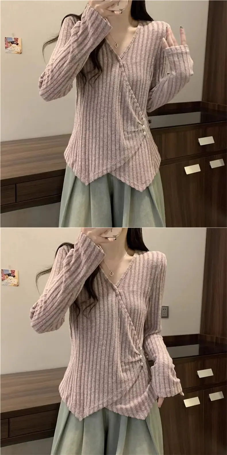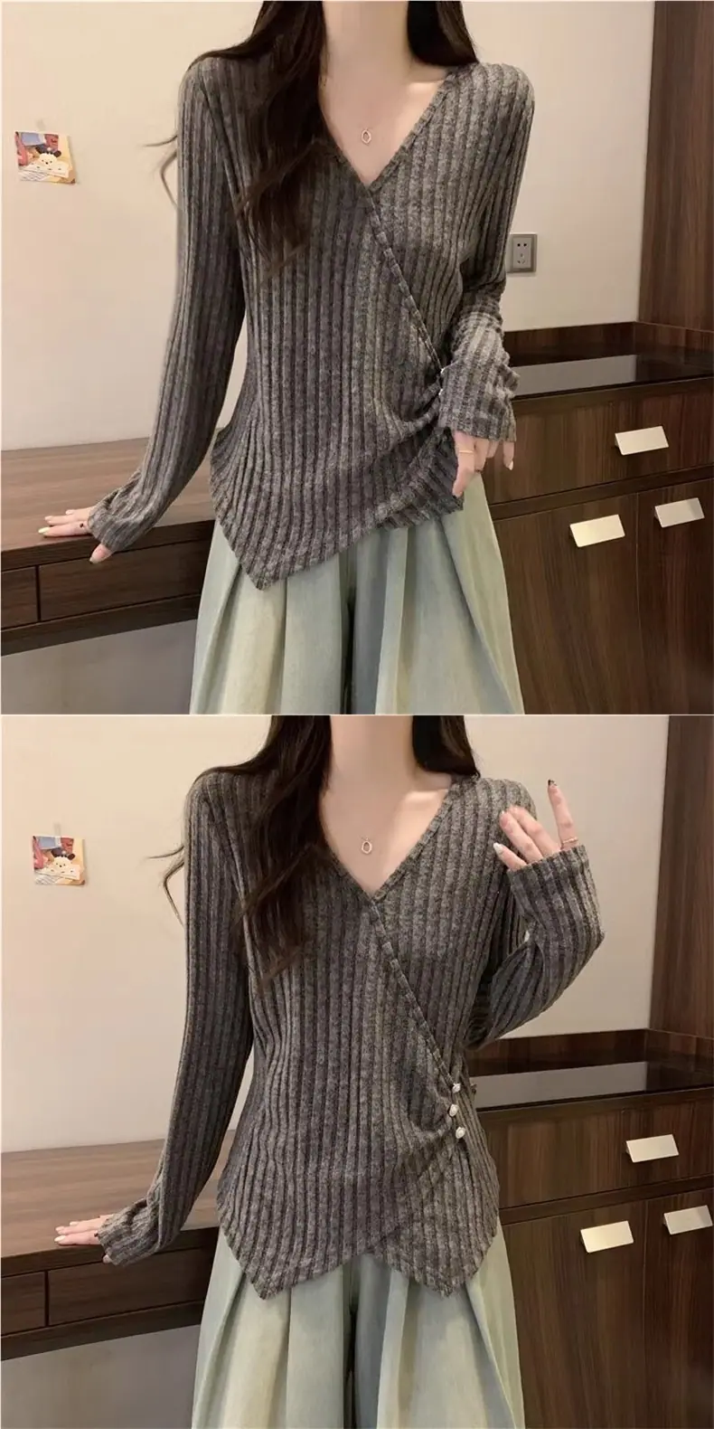Talla Grande Primavera Otoño Sentido del Diseño Nicho Adelgazante Manga Larga Camiseta de Mujer Nueva Irregular Camiseta Base Cuello Hombro Recto Top