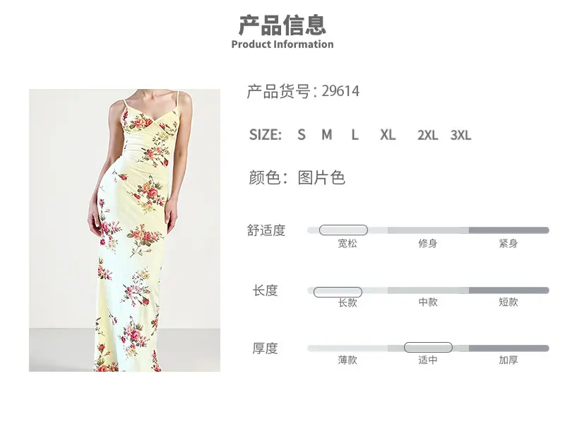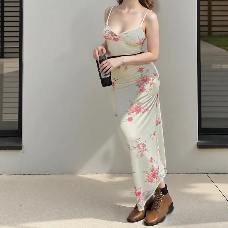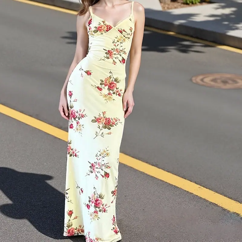 Transfronterizo Europa y América 2025 Verano Sling Cuello en V Estampado Sexy Ajustado Vestido Largo Estilo Vacacional Vestido sin Espalda Mujer