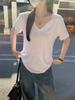 Playera Blanca de Manga Corta con Cuello en V Bajo en el Hombro Derecho y Clavícula Expuesta para Mujer 2025 Verano Nuevo Estilo Sencillo Casual Ajustado Look Adelgazante Top