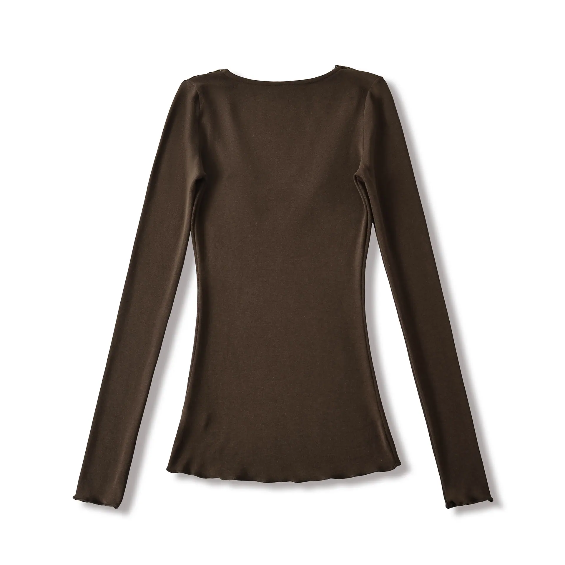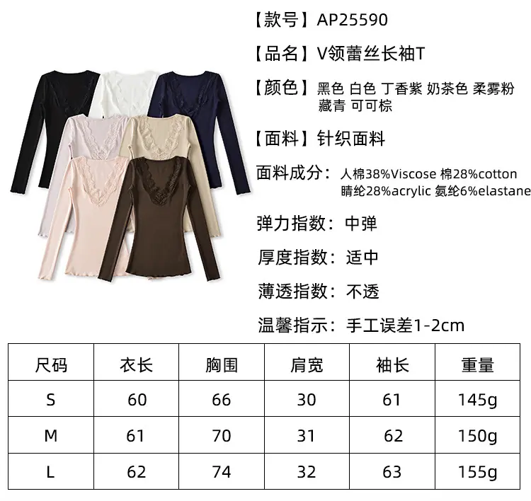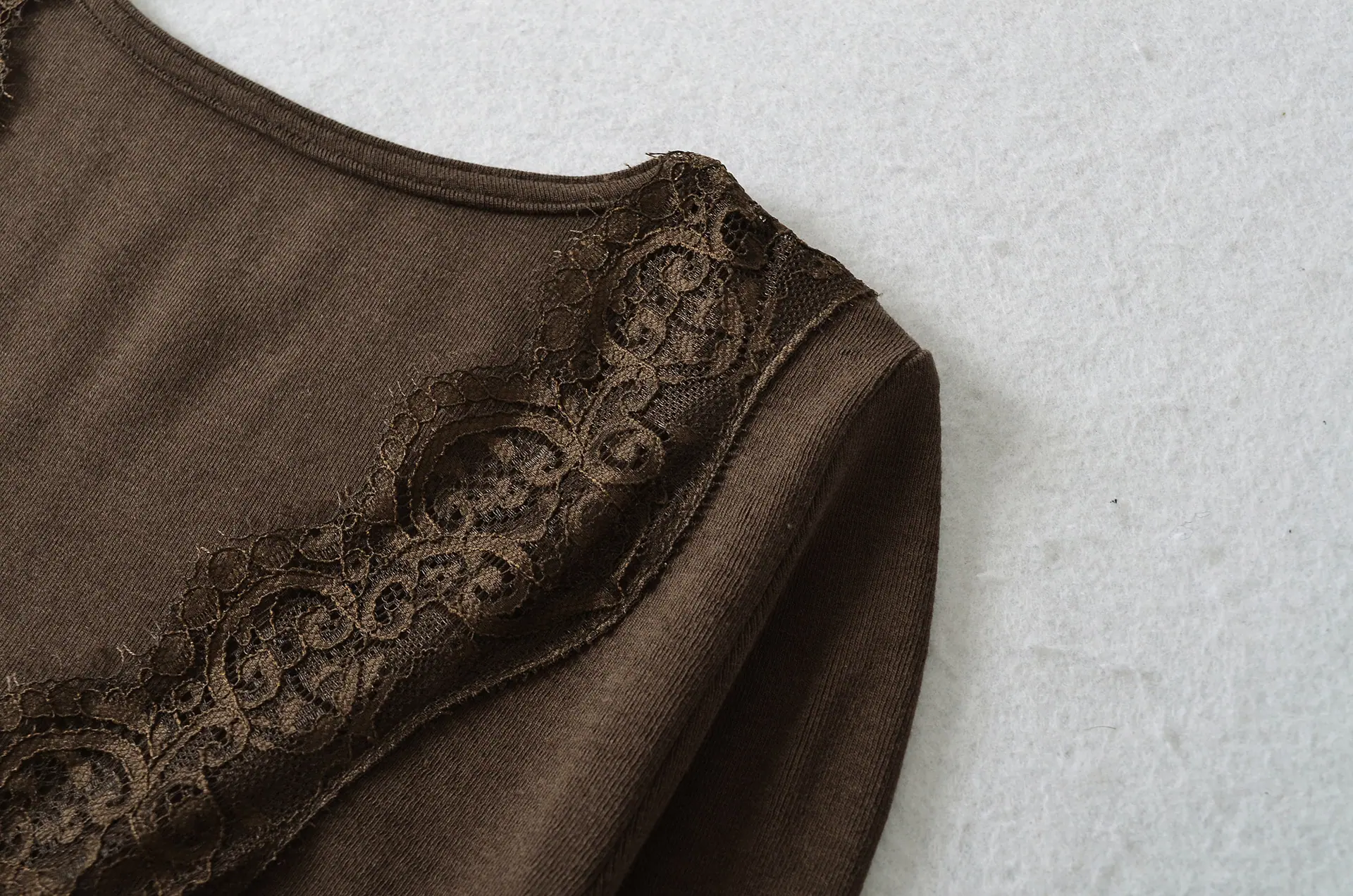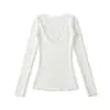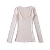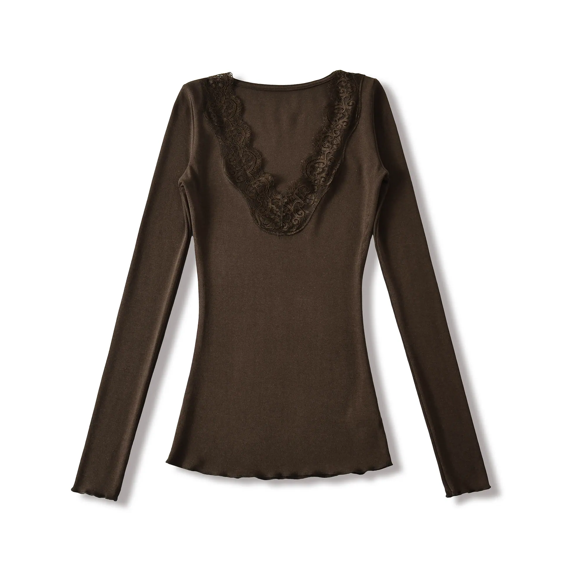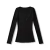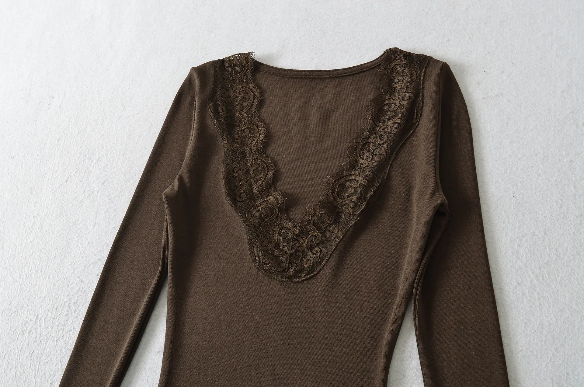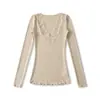 AP25590-25 Otoño Nuevo Americano Deseo Puro Chica Caliente Sexy Cuello en V Encaje Recorte Manga Larga Ajustado Camiseta