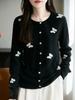 2025 Nuevo Otoño e Invierno Cárdigan de Punto de Lana Pura con Cuello Redondo y Manga Larga para Mujer, Jacquard de Mariposas, Top Holgado, Chaqueta