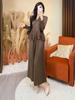 Conjunto de Dos Piezas de Otoño para Mujer a la Moda Top Elegante de Manga Larga con Frunces Pantalones Sueltos de Pierna Ancha Conjunto Completo Adelgazante