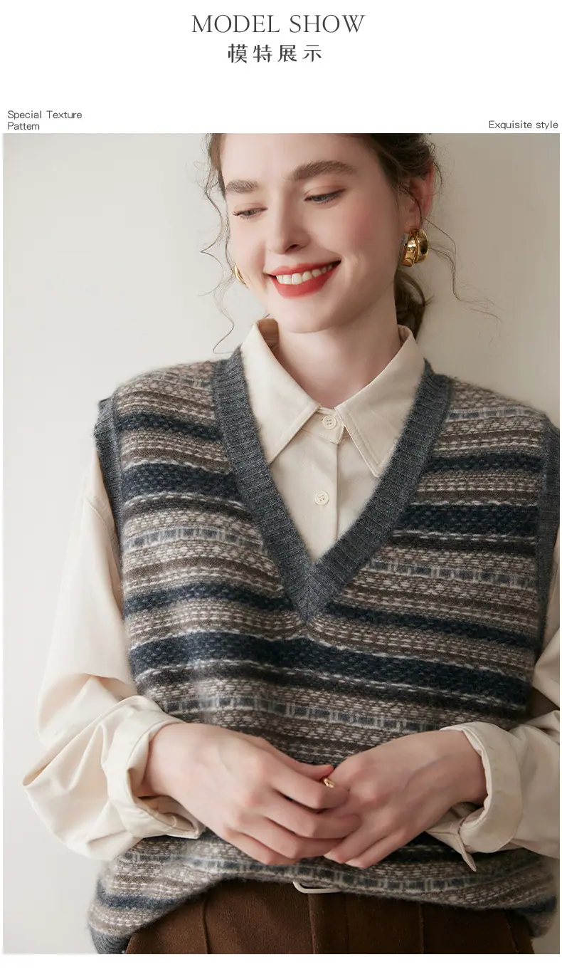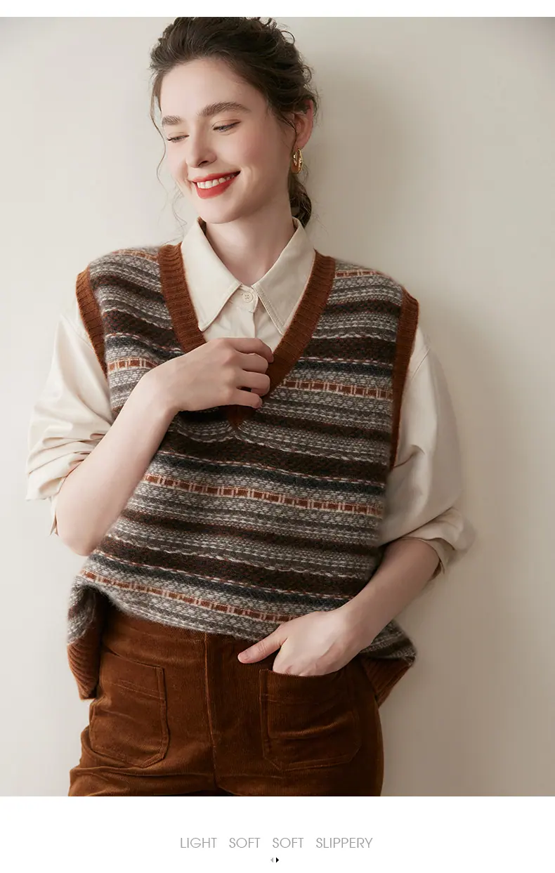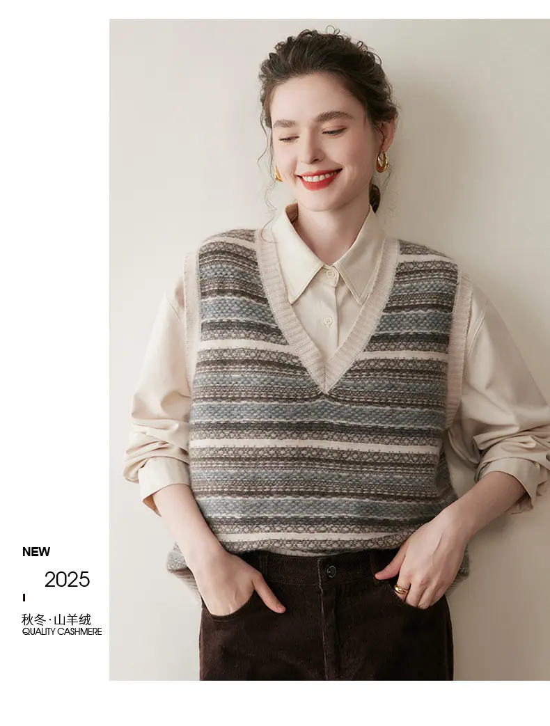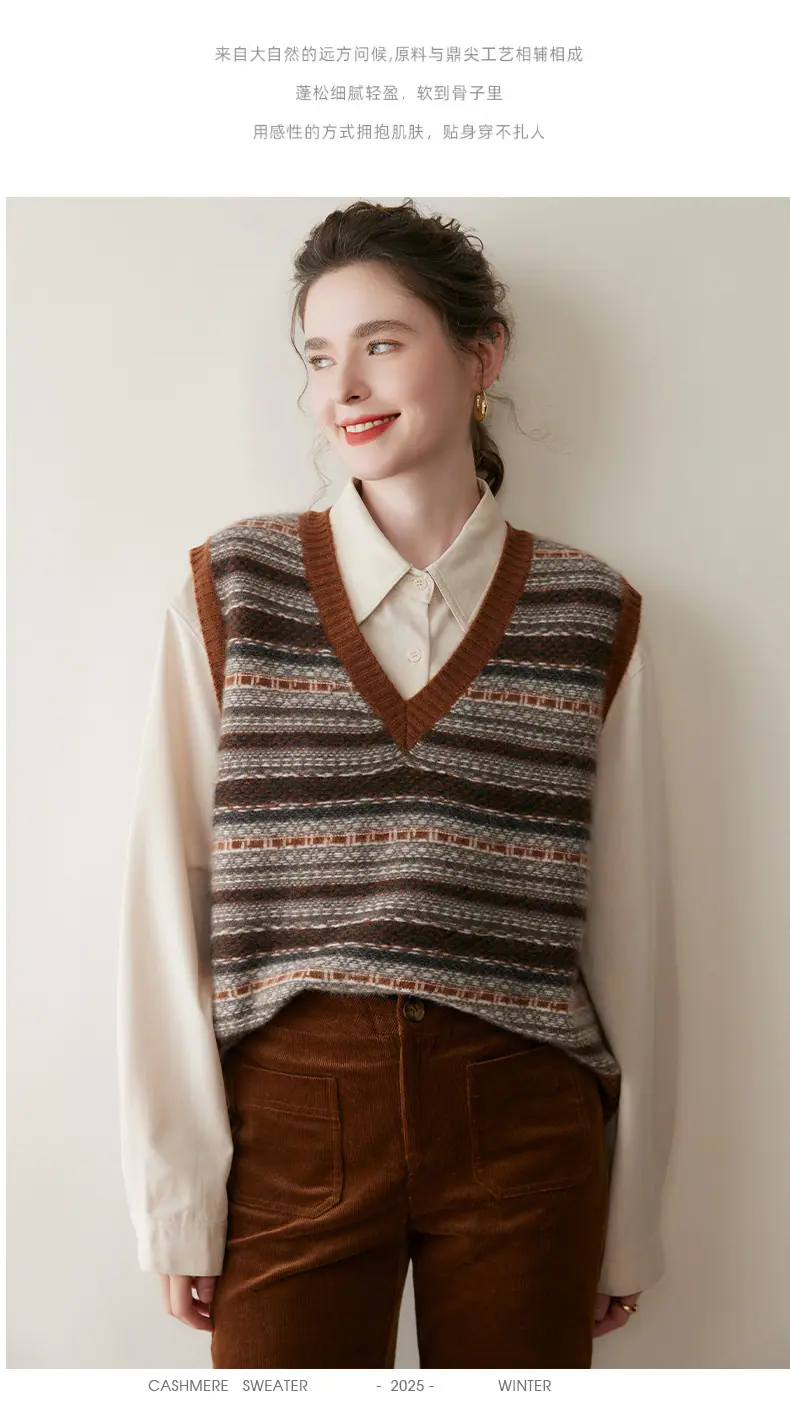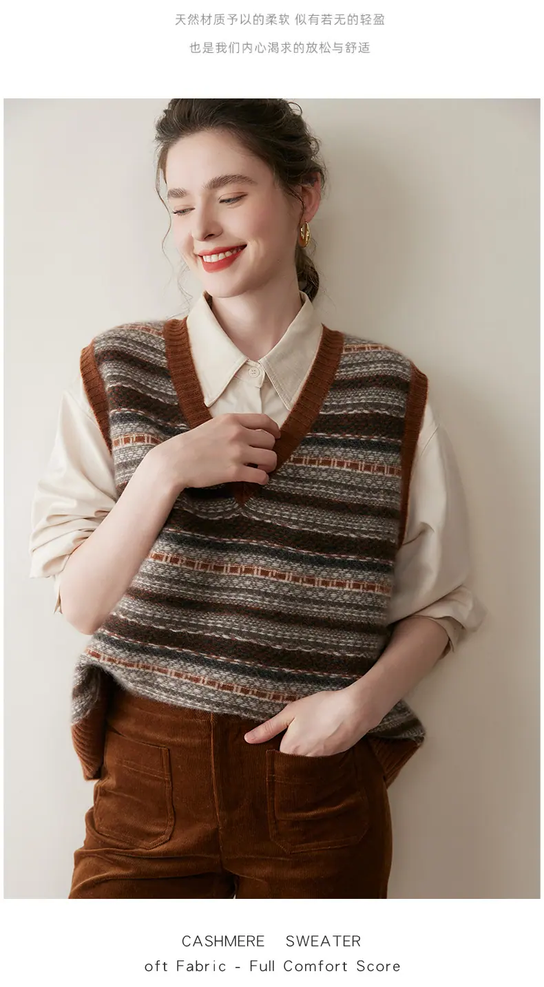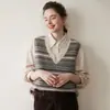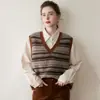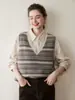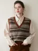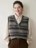 Chaleco Retro de Cachemira para Mujer Primavera y Otoño 2025 Suelto Cuello en V Versátil Bloque de Color Sin Mangas Jersey de Punto