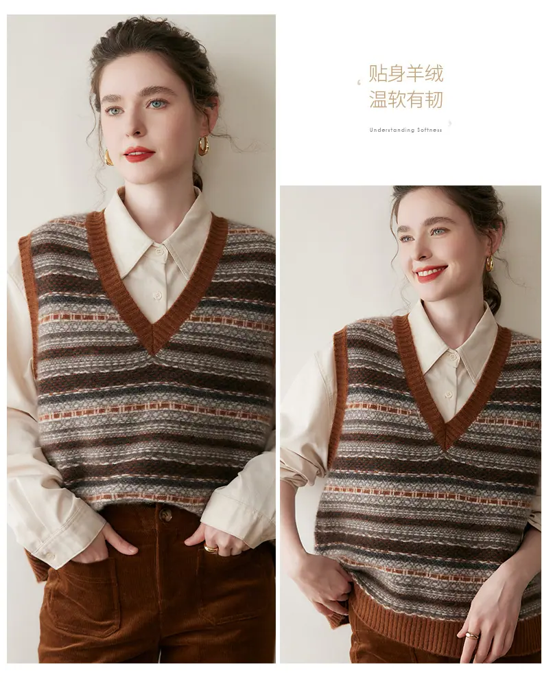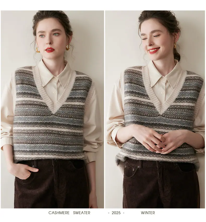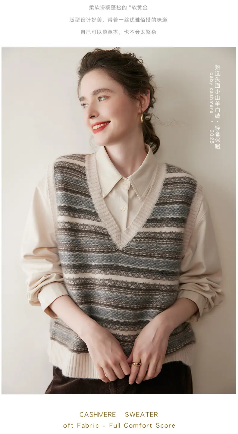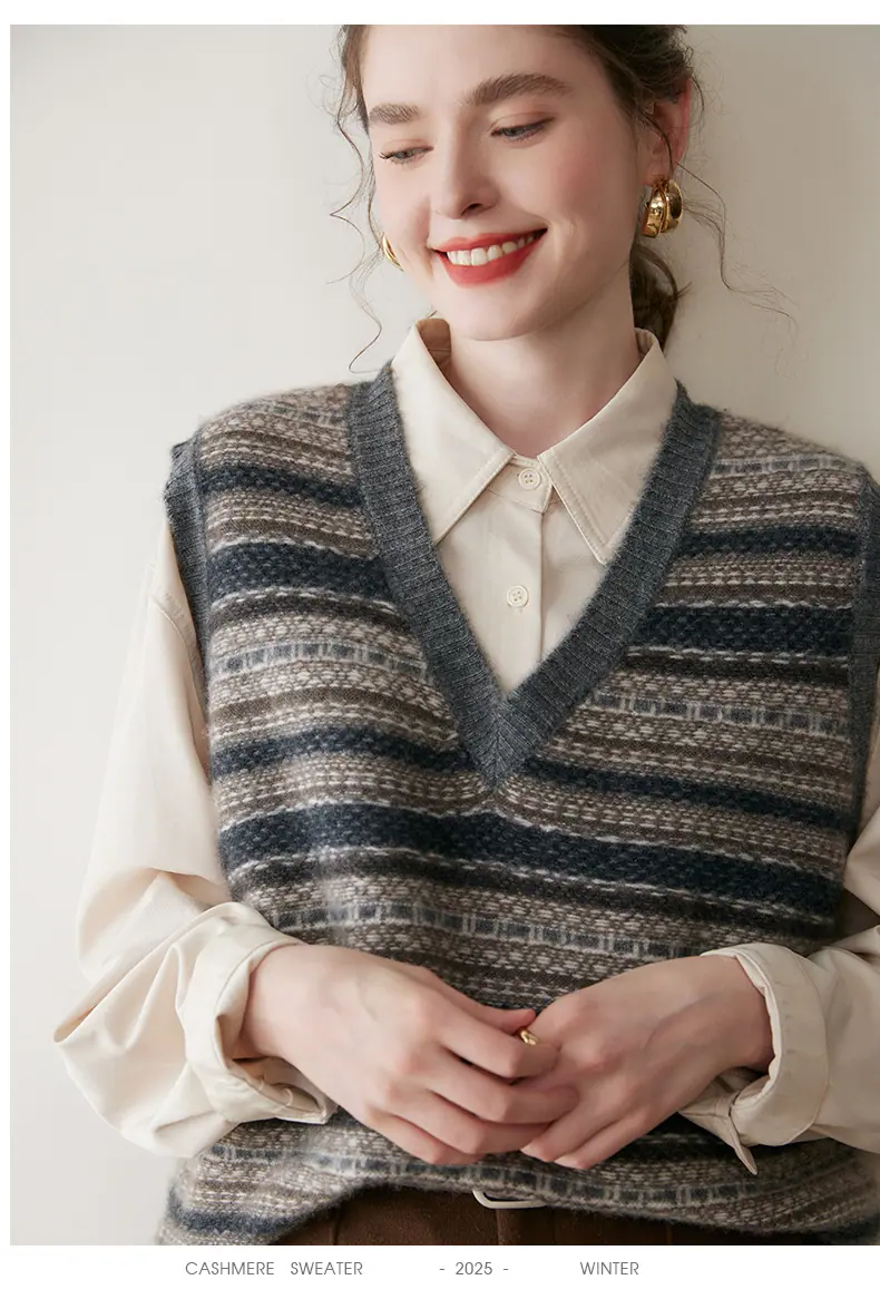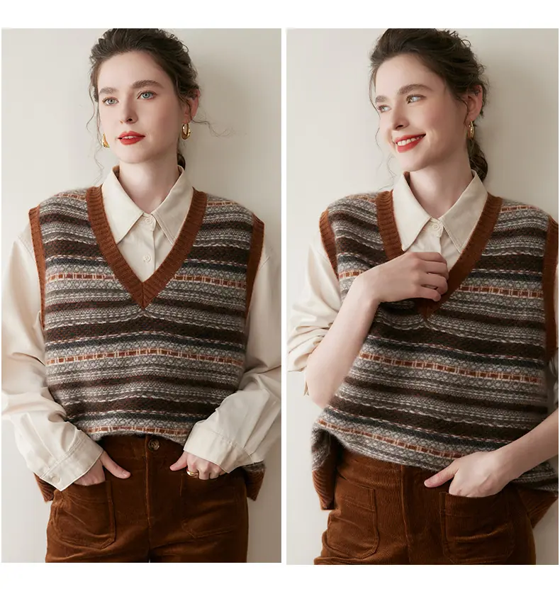 Chaleco Retro de Cachemira para Mujer Primavera y Otoño 2025 Suelto Cuello en V Versátil Bloque de Color Sin Mangas Jersey de Punto