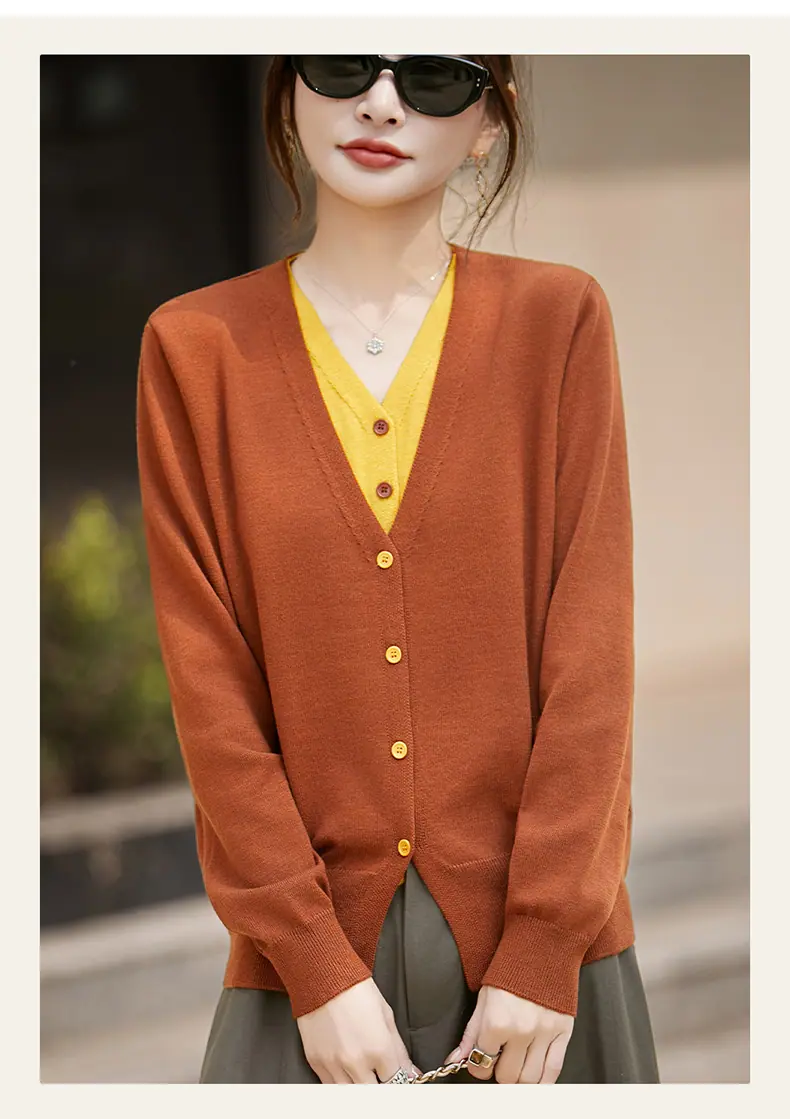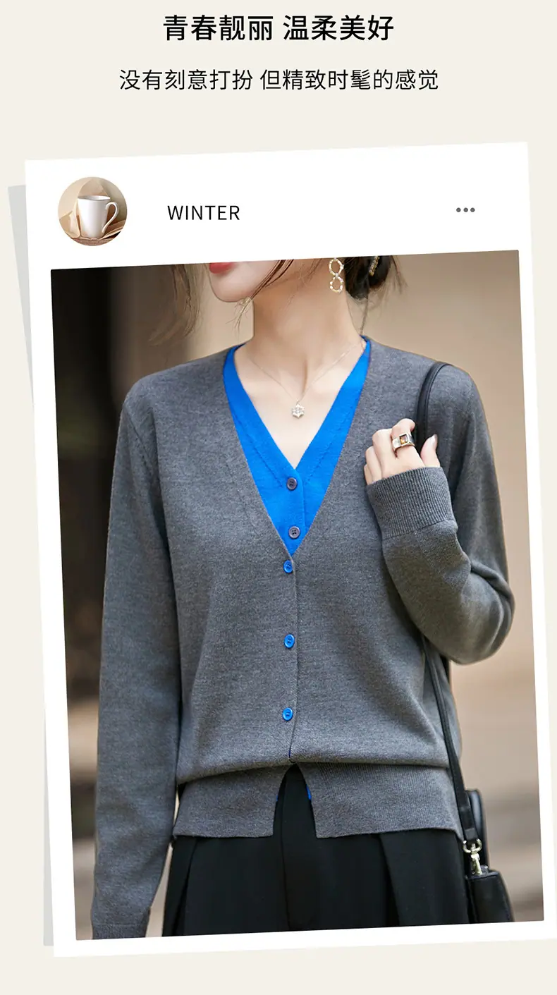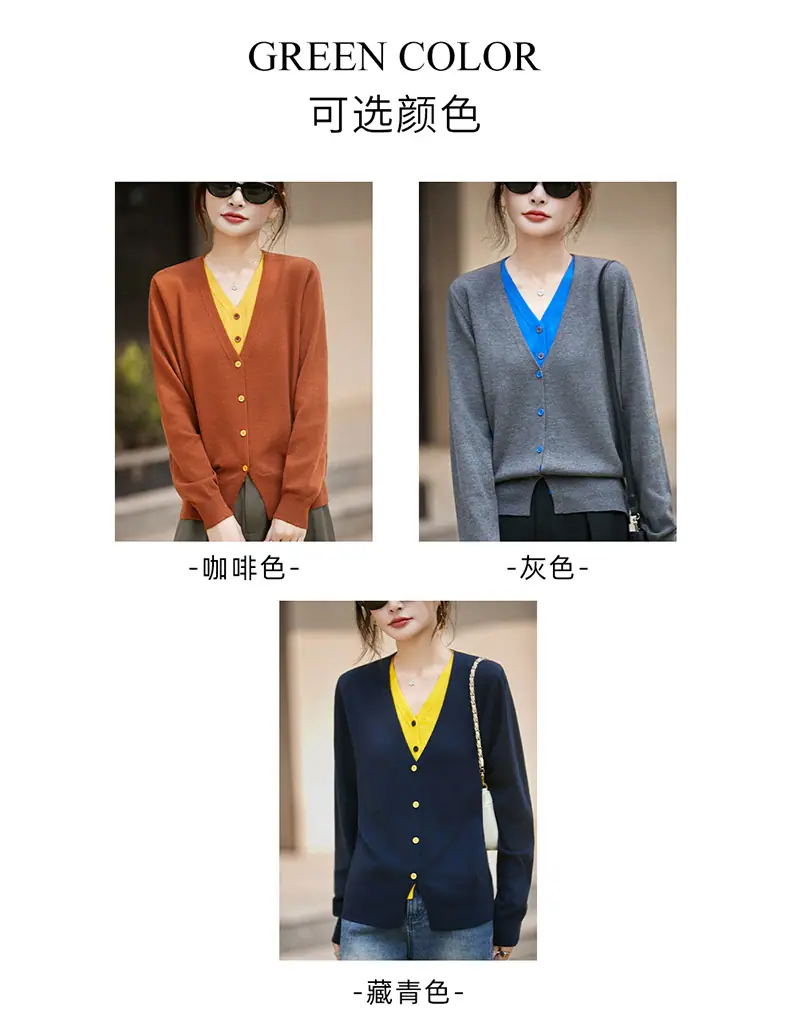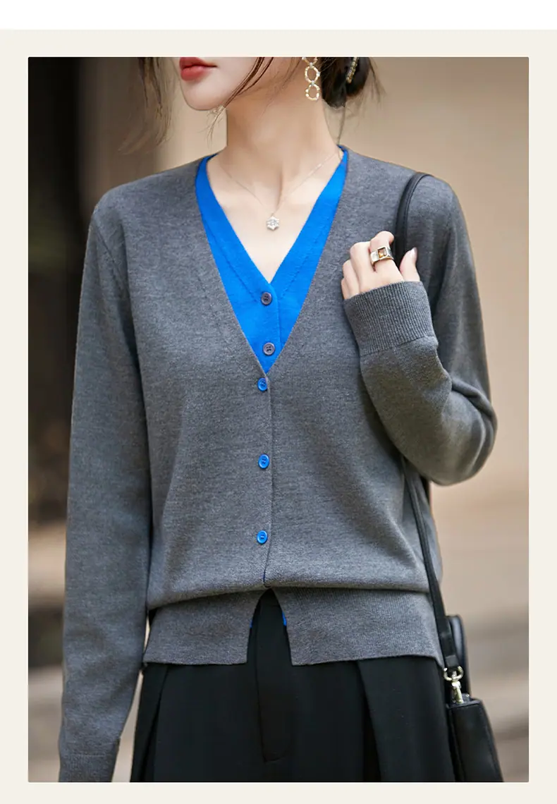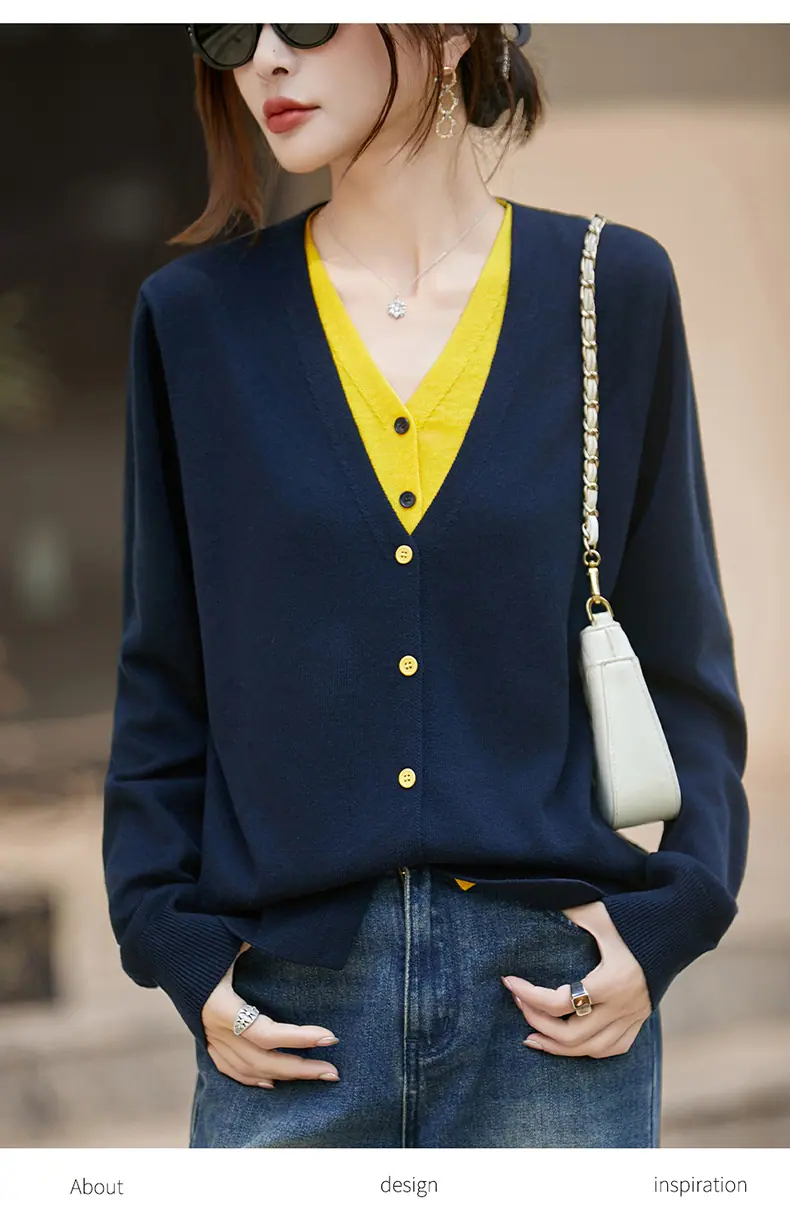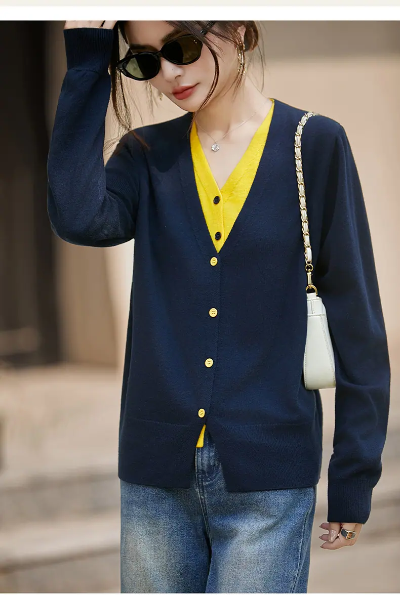 Cárdigan de Punto Fino de Lana Merino Falso de Dos Piezas con Cuello en V Diseño Color Block Nuevo Abrigo Suéter Otoño/Invierno Directo de Fábrica