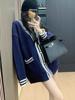 25 Cardigan de Punto 100% Cachemira Pura con Cuello en V para Otoño e Invierno para Mujer, Holgado, Aspecto Adelgazante, Elegante, Raya Blanca y Azul Marino