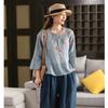 Verano Nueva Camisa Artística de Algodón y Lino con Bordado Floral, Jersey de Cuello Redondo Holgado Adelgazante Versátil de Moda