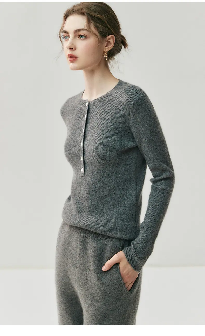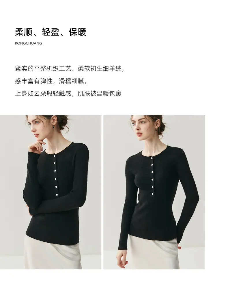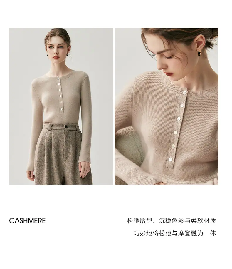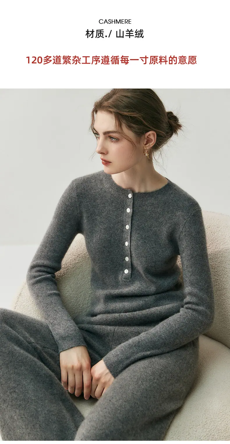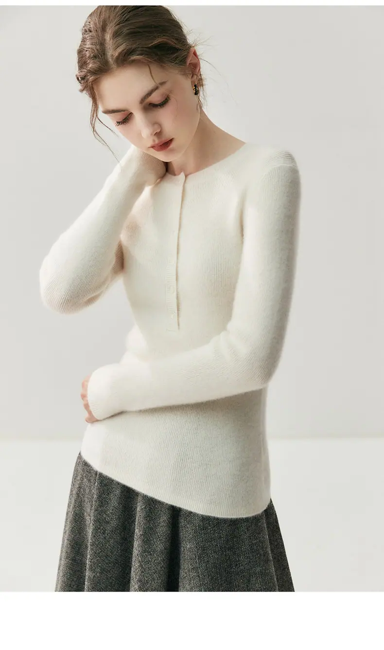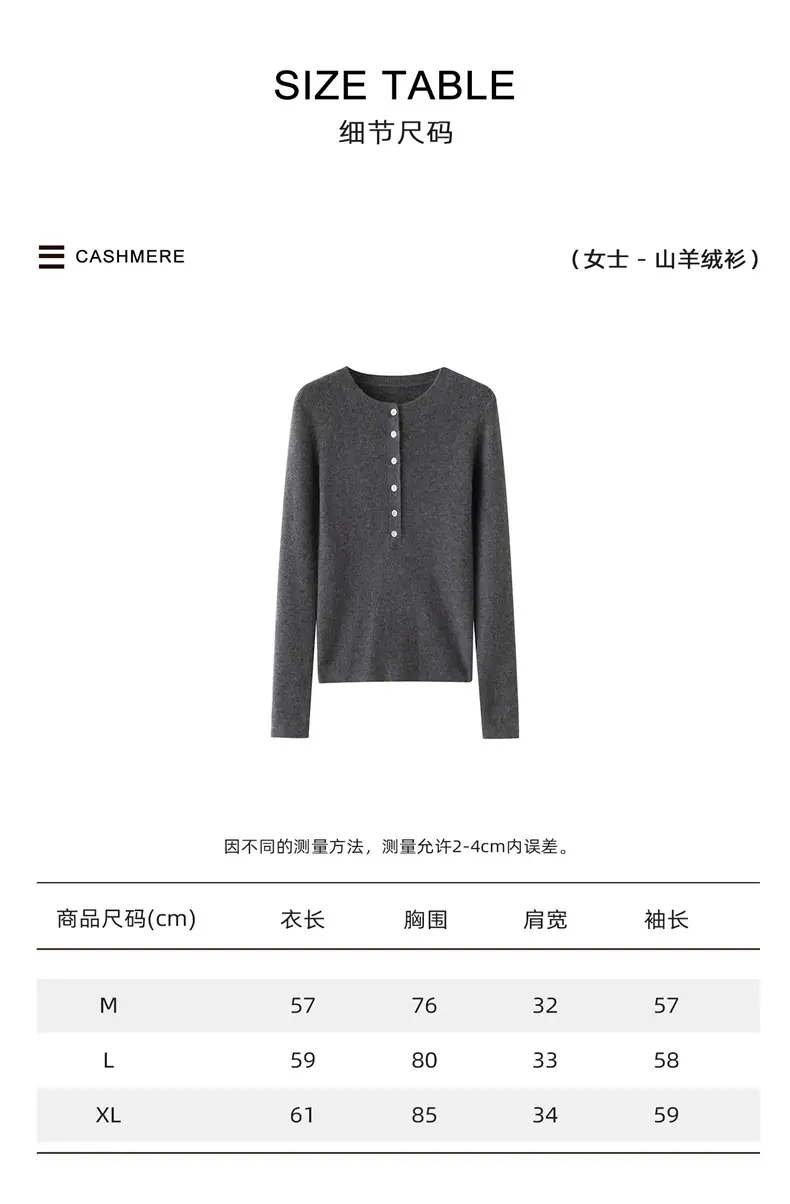Suéter de Cachemira de Manga Larga con Cuello Redondo y Medio Botón para Mujer, Jersey Ajustado de Color Sólido, Moderno, Cómodo, Capa Base