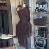 Ropa Femenina Transfronteriza Europea y Americana 2025 Nuevo Estilo Otoño Elegante Vestido Delgado Asimétrico con Volantes de Un Hombro y Escote Diagonal