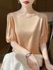Primavera y Verano Nuevo Satén Acético Sedoso Sentido de Alta Gama Camiseta de Manga Corta con Cuello Diamante Moda Femenina Top Adelgazante Versátil para Mujer