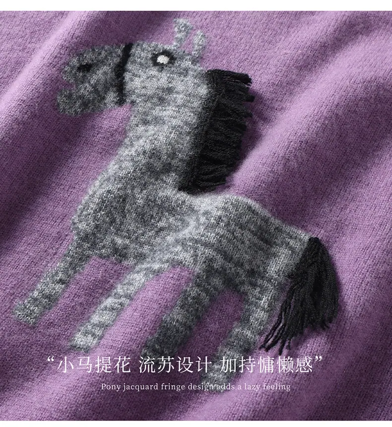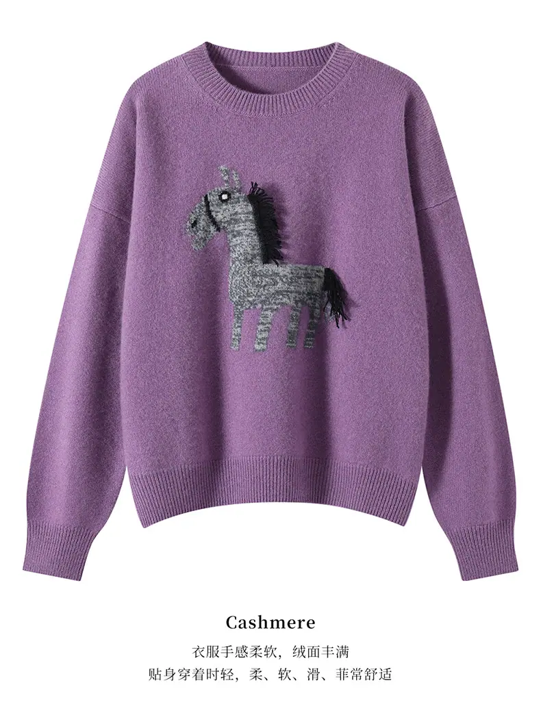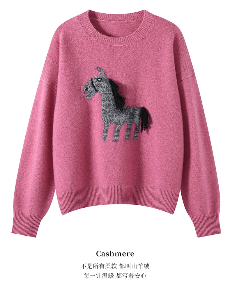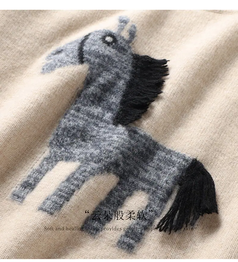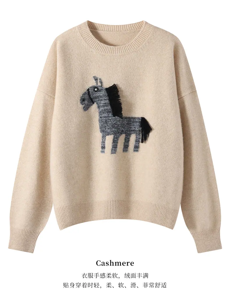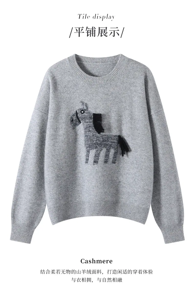 Suéter de Punto de Cachemira Suave y Delicado para la Piel con Jacquard de Caballo Pequeño Simple y Versátil Estilo Coreano para Mujer, Holgado y Adelgazante con Cuello Redondo