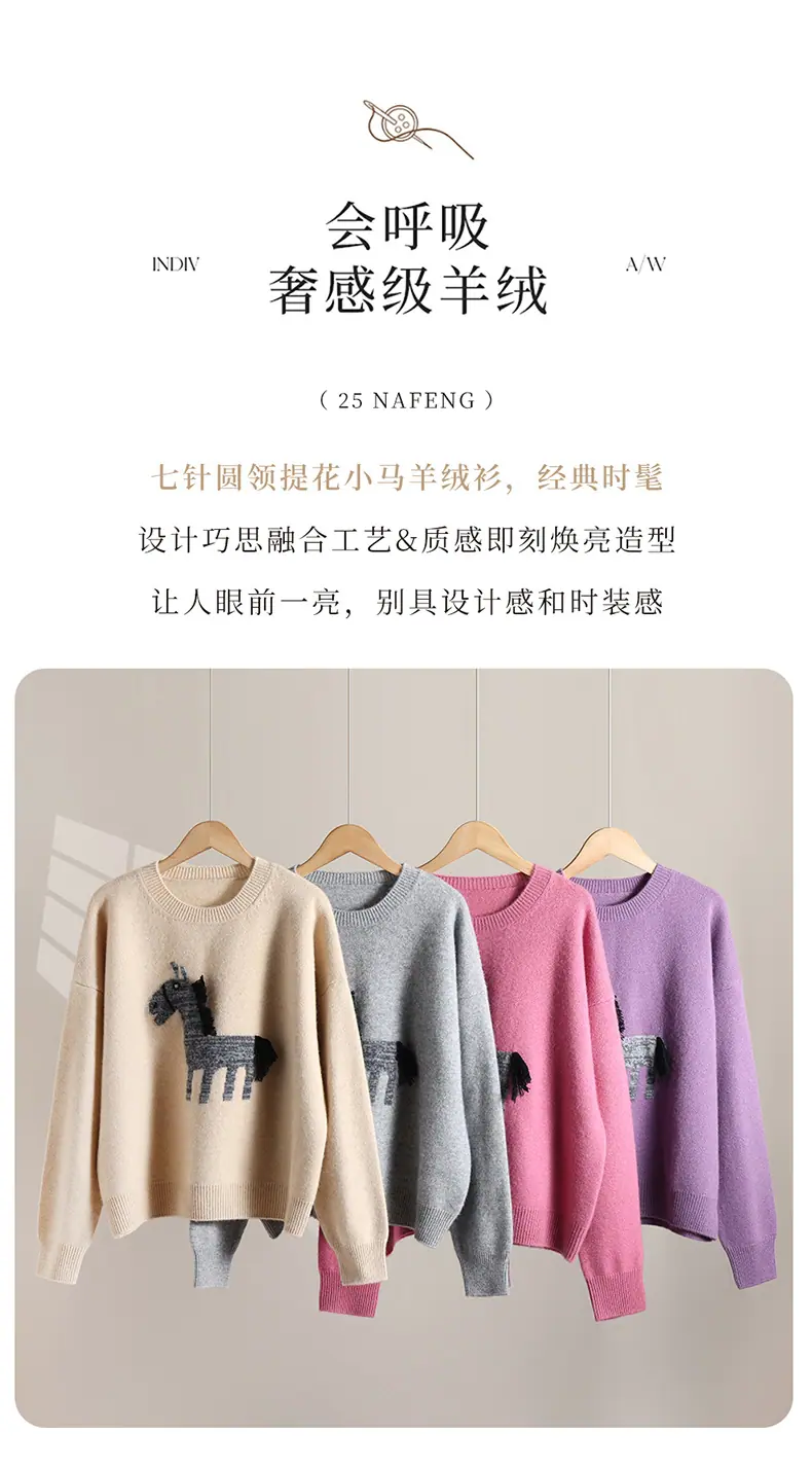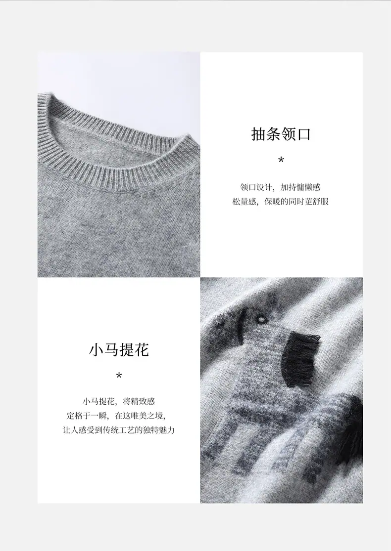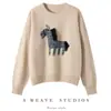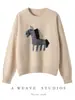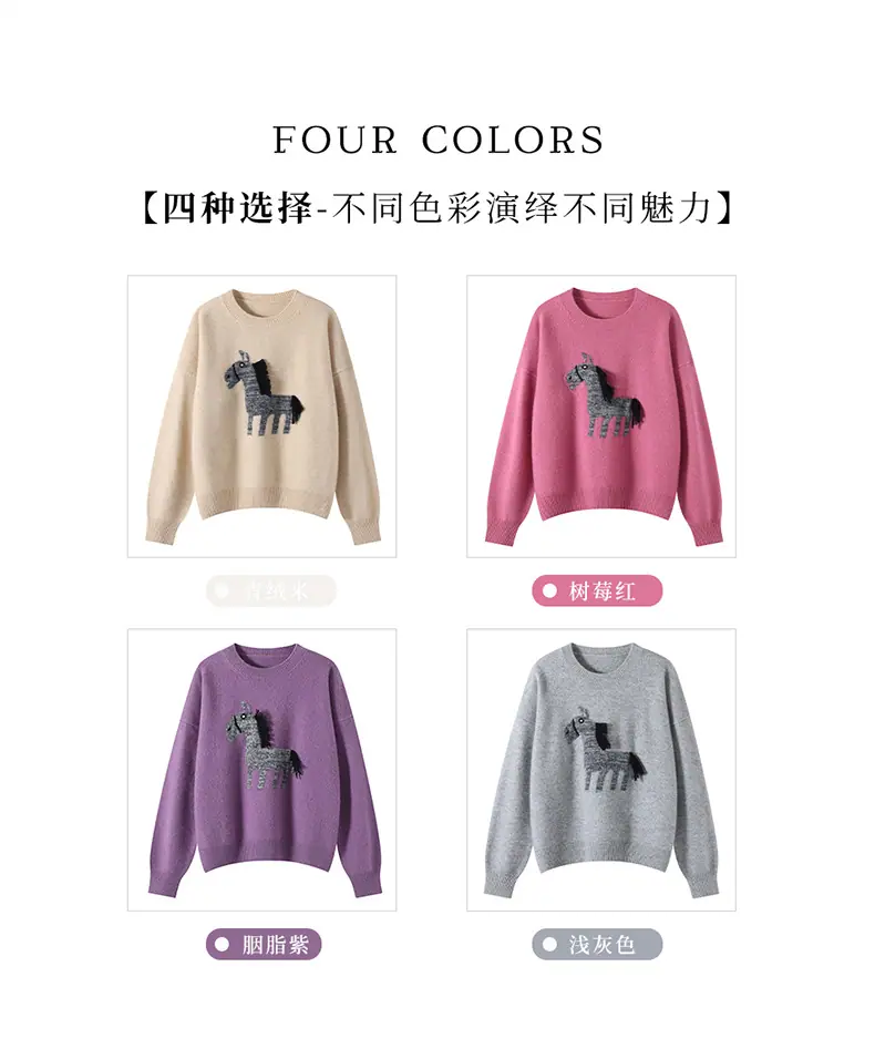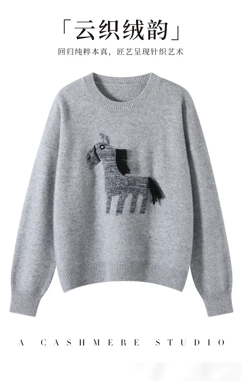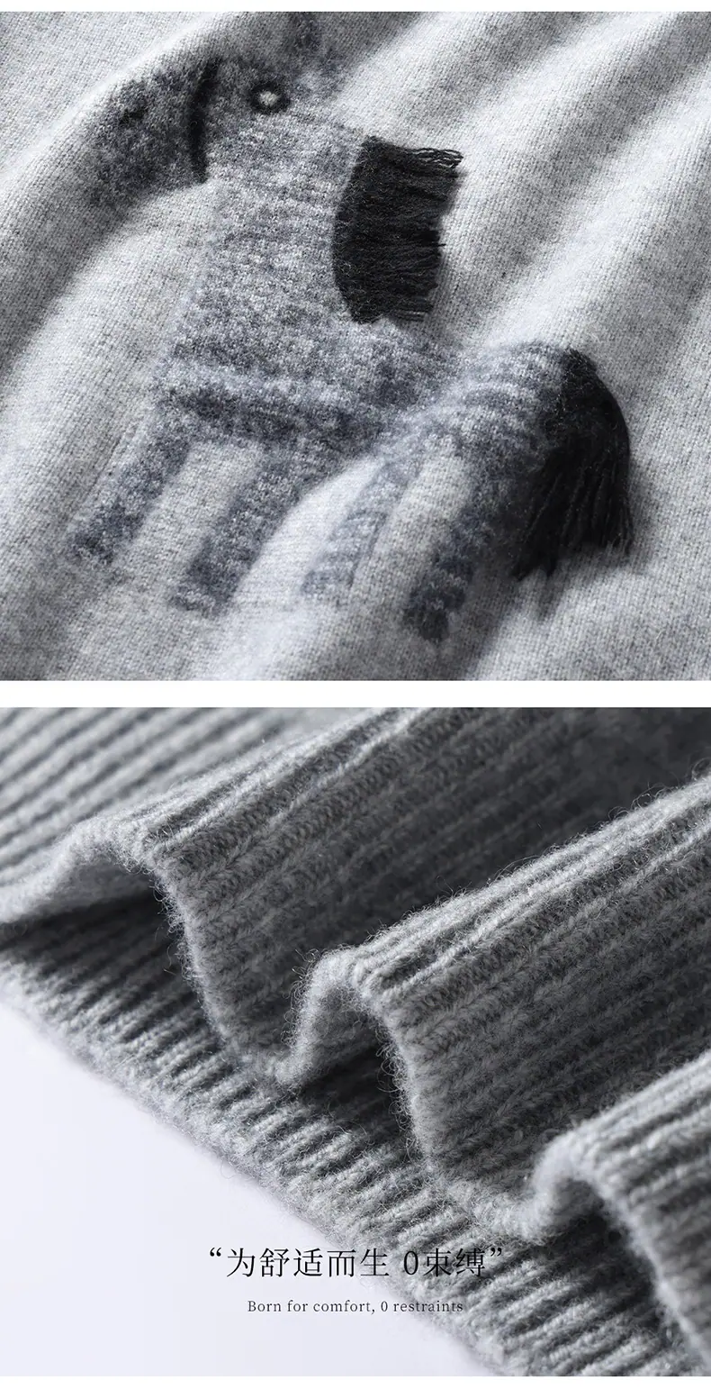 Suéter de Punto de Cachemira Suave y Delicado para la Piel con Jacquard de Caballo Pequeño Simple y Versátil Estilo Coreano para Mujer, Holgado y Adelgazante con Cuello Redondo