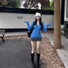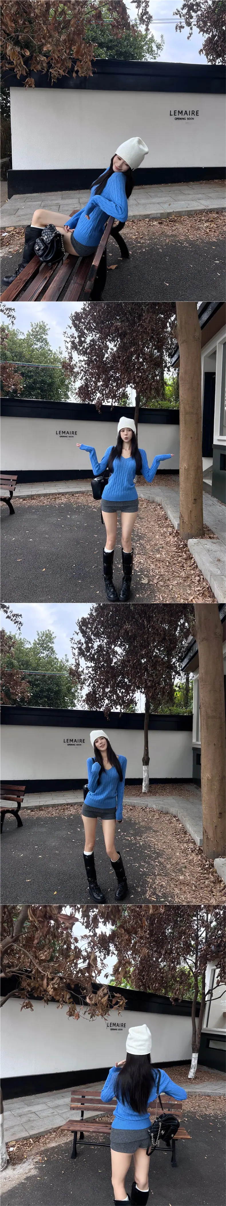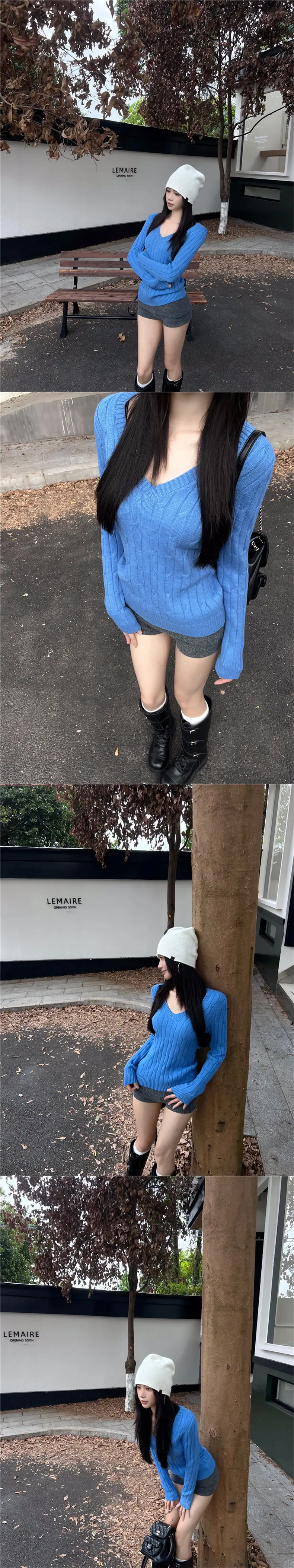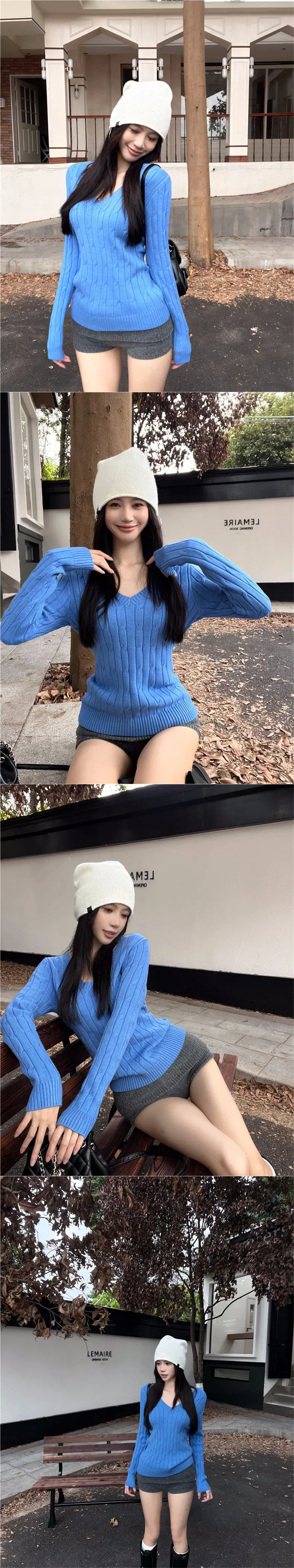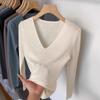 Suéter básico de punto trenzado azul con cuello en V y manga larga para mujer, otoño e invierno, corte ajustado, capa interior, suéter adelgazante, camiseta base