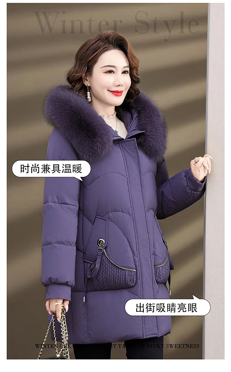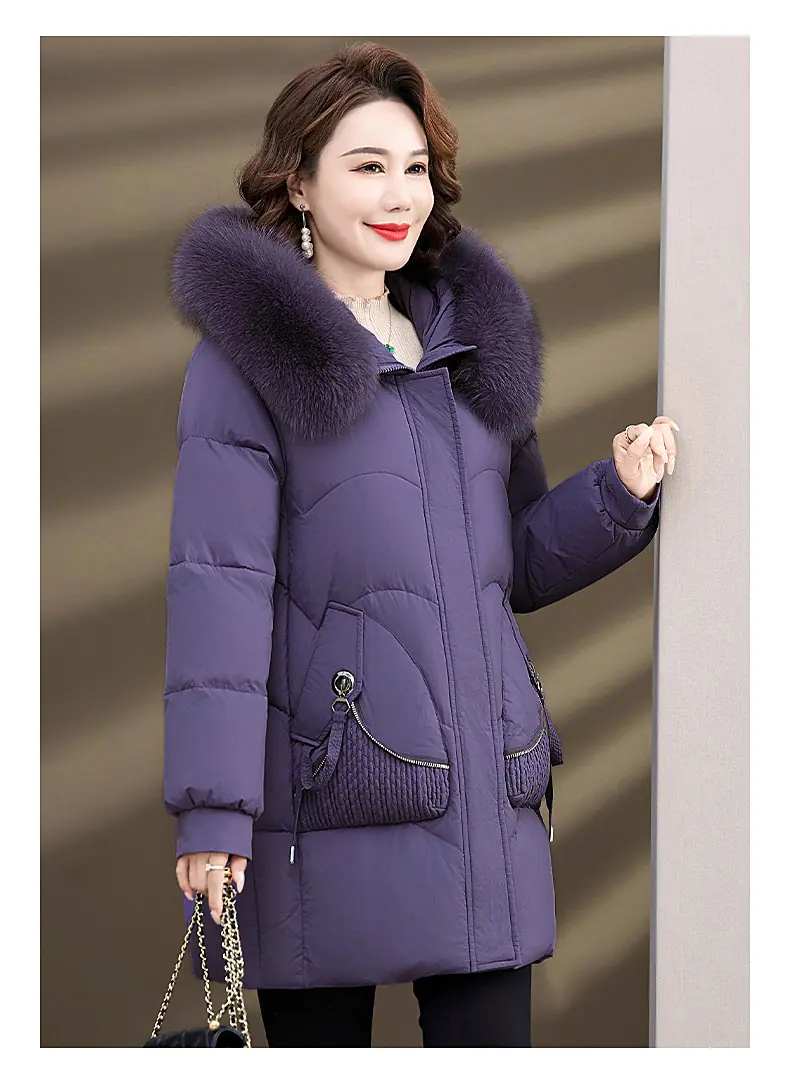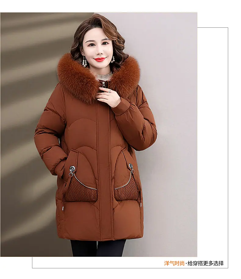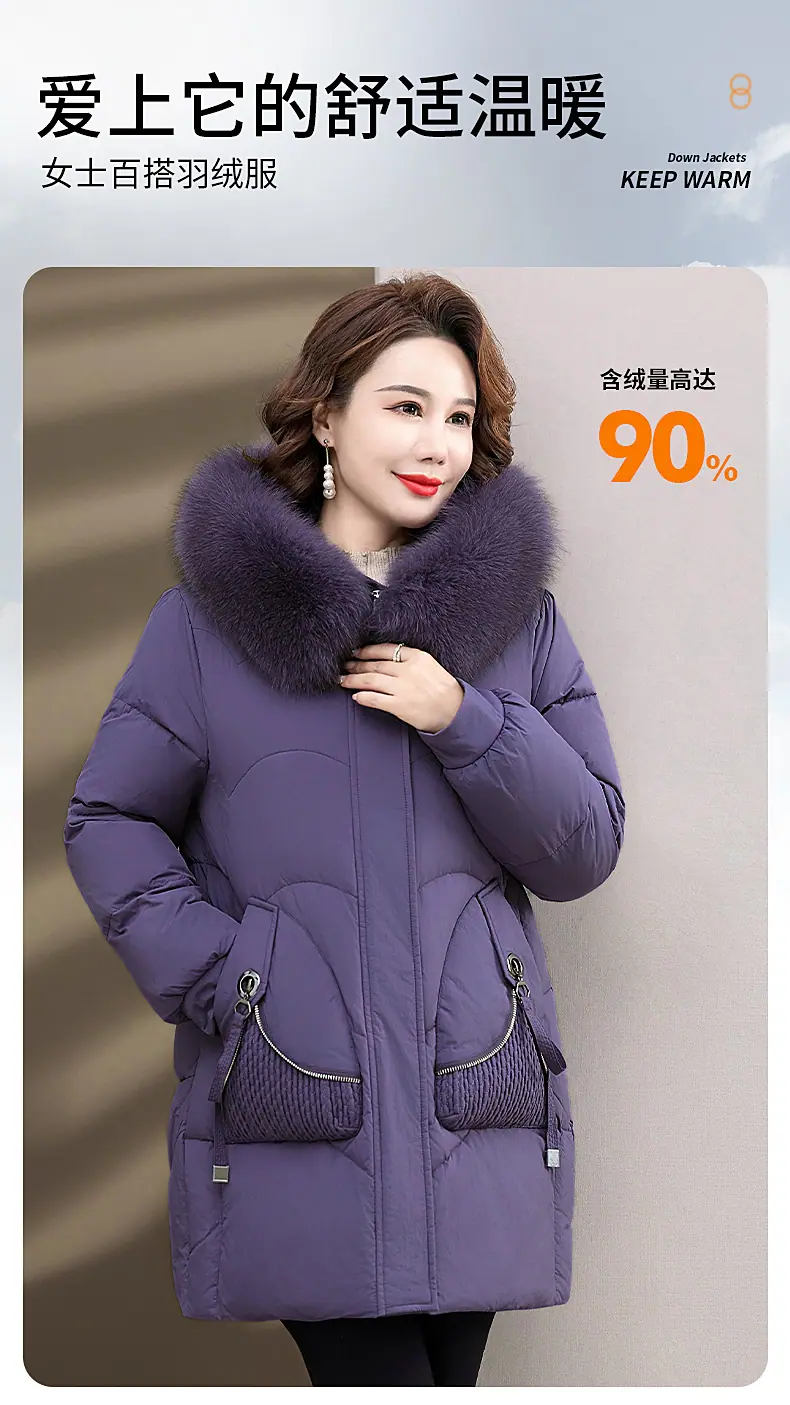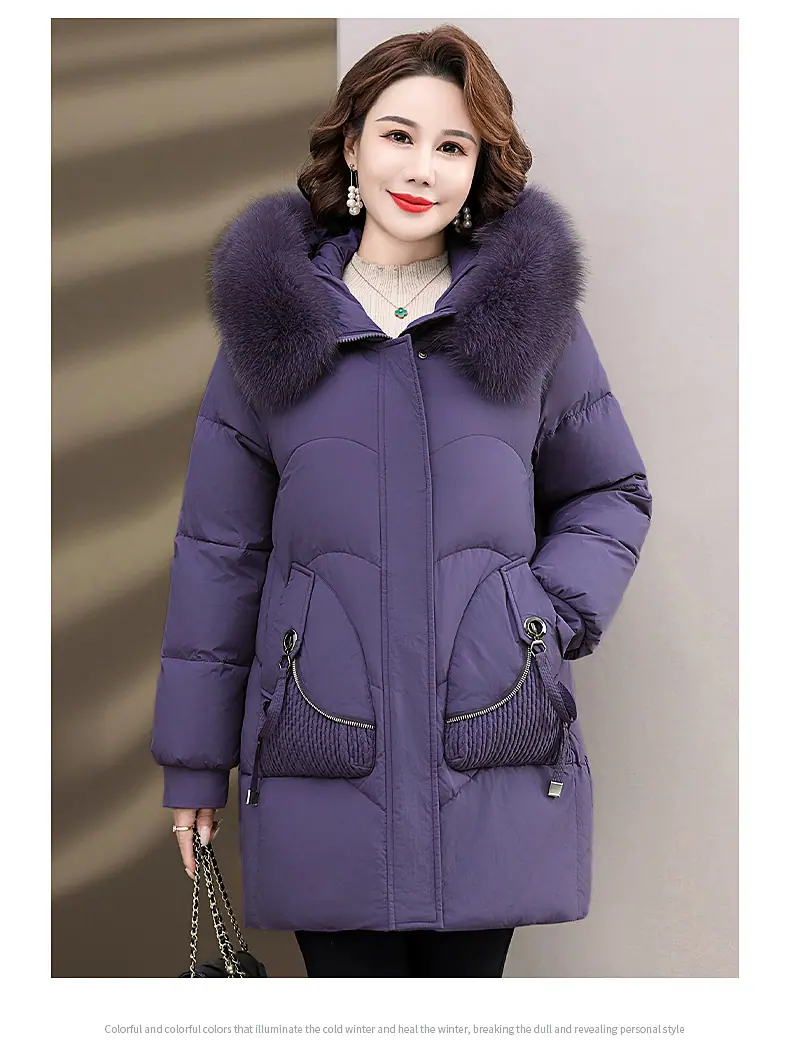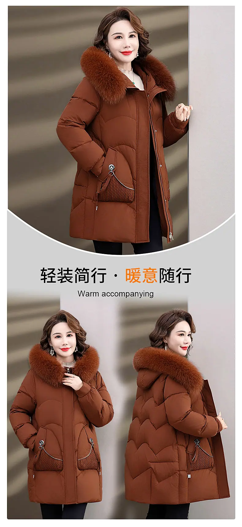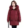 Chamarra de plumón de pato blanco para mujeres de mediana edad y mayores 2025 nuevo invierno largo medio ropa de madre abrigo grueso cálido con cuello de piel