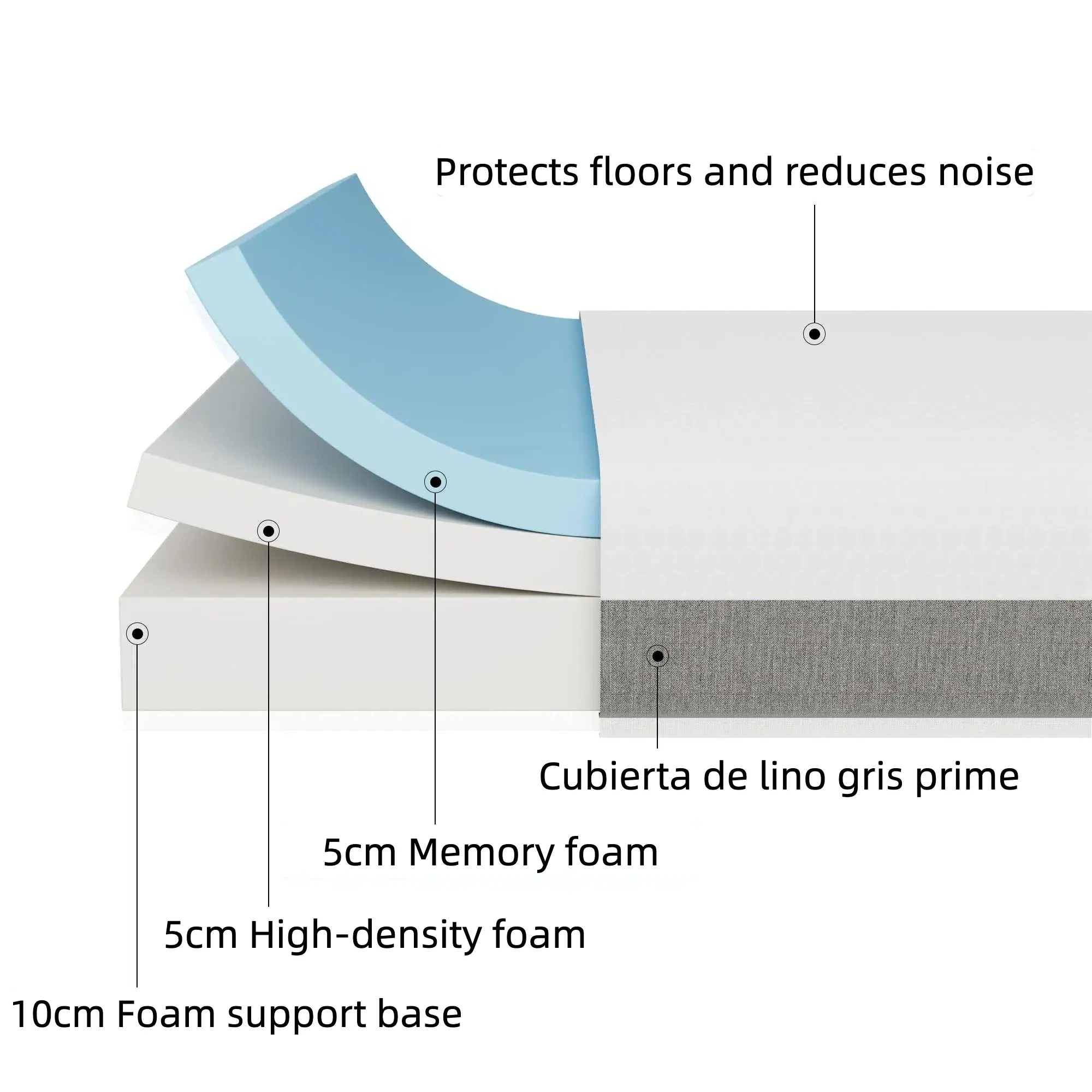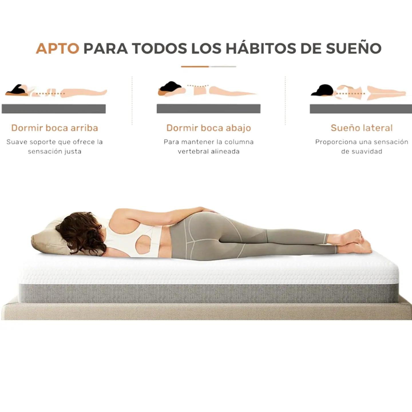 Experimente un soporte incomparable con capas de espuma viscoelástica con gel ultra refrescante, espuma suave y cómoda y una base duradera de alta densidad.. El colchón, con un grosor total de 20 cm, ofrece un equilibrio perfecto entre comodidad y alivio de presión.