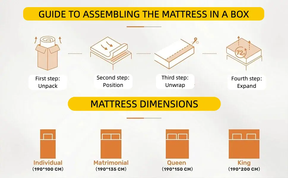 Este colchón llega comprimido expertamente en una caja para facilitar su envío.. Desempaquételo, desenróllelo y se expandirá completamente a su forma original en 72 horas.. En un ambiente cálido, se expande más rápido.; En uno frío puede tardar más. Saltar, caminar o dormir sobre él acelerará el proceso.